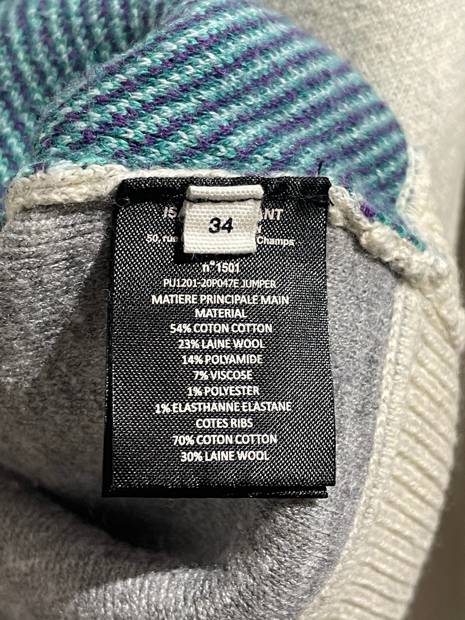Pull en coton et laine tricolore: beige, vert et violet signé Marant sur le devant. Bords en maille côtelée.