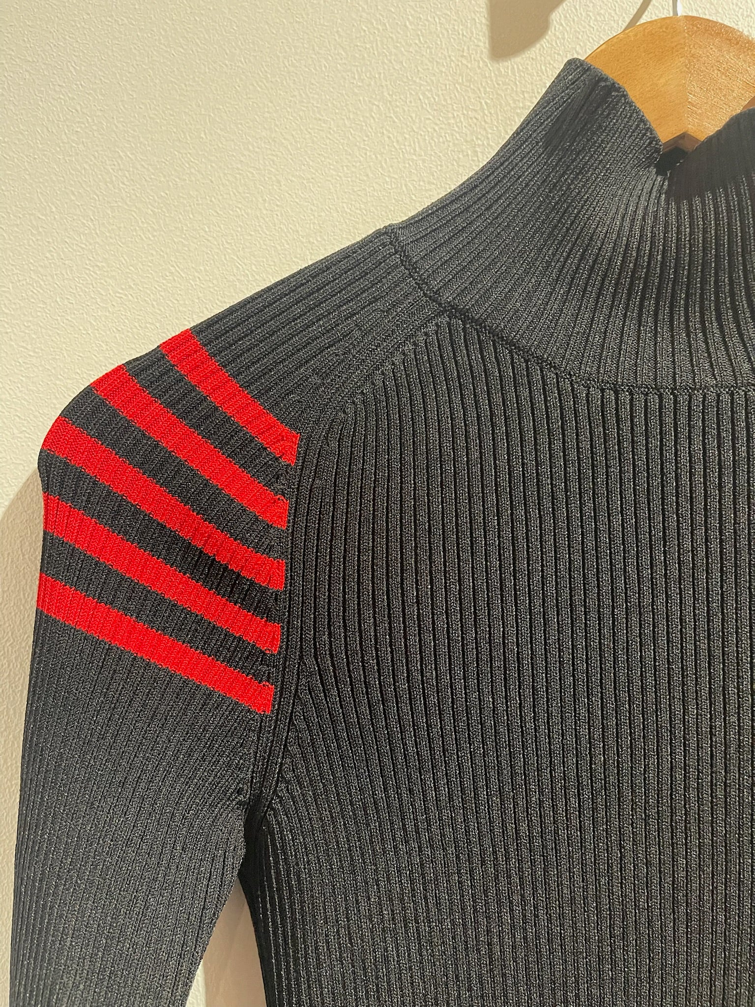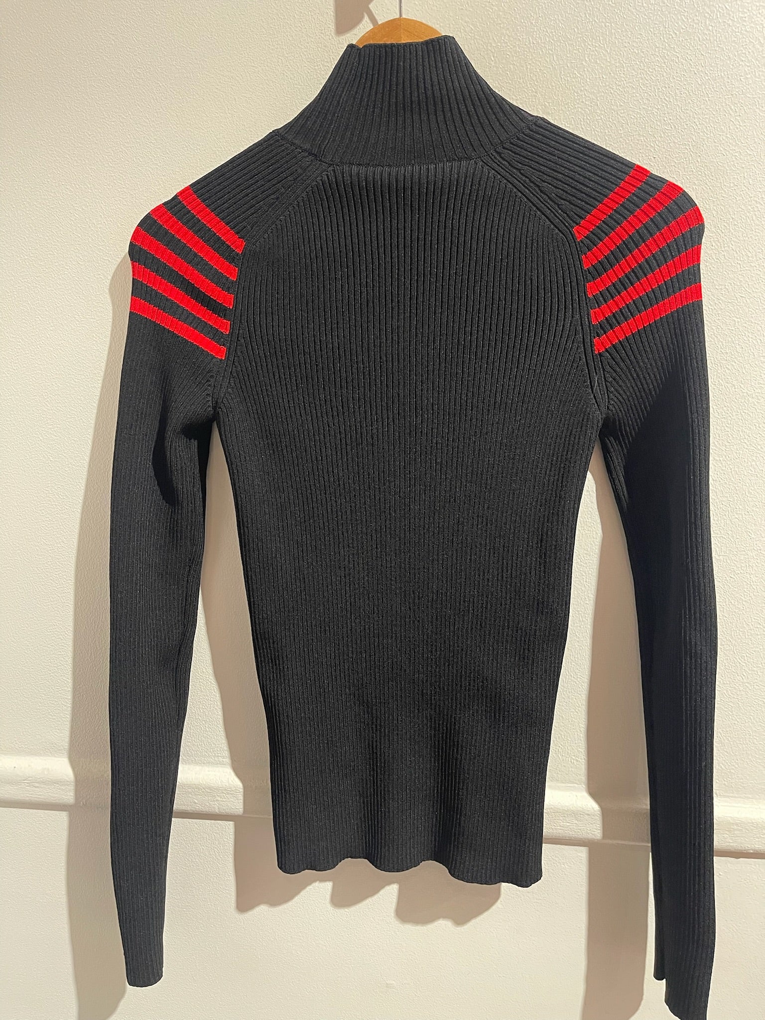 Pull en maille côtelée noir avec rayures rouges aux épaules, col montant et manches longues. Logo à la poitrine.