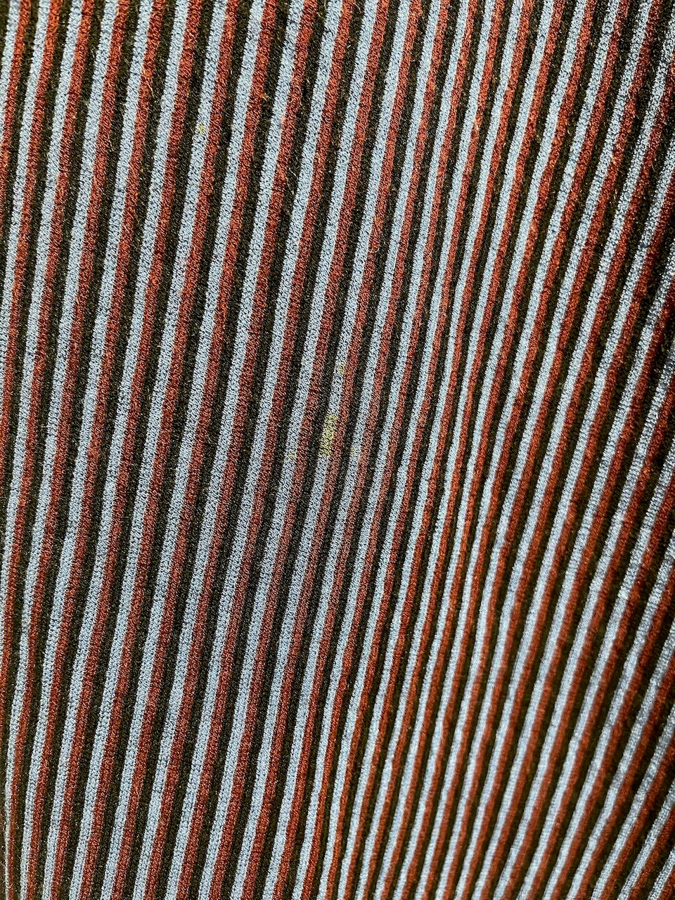 Robe en maille côtelée bleu à rayures bordeaux et noire avec col rond, sans manches et ourlet asymétrique. Doublure à motif fleuri.