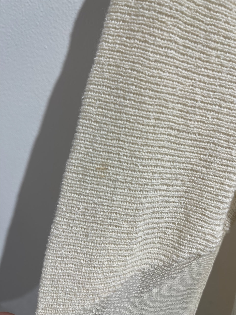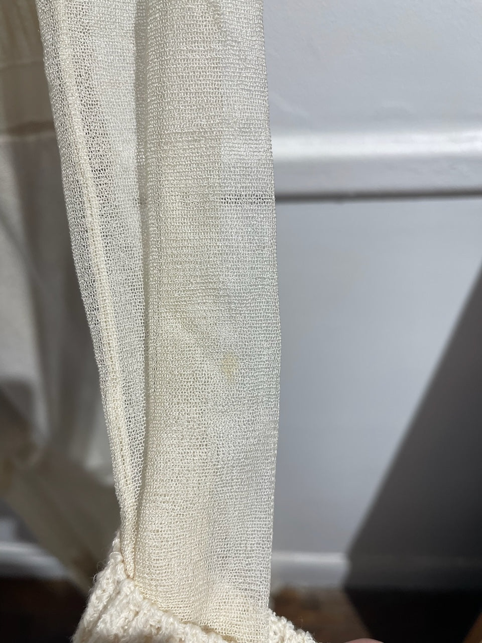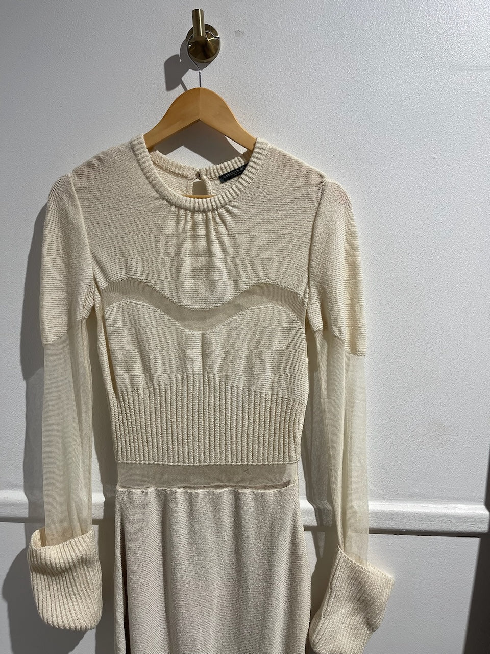Robe longue en laine et coton mélangée beige avec détails de transparence, col rond, manches longues à revers et bouton au dos du col.