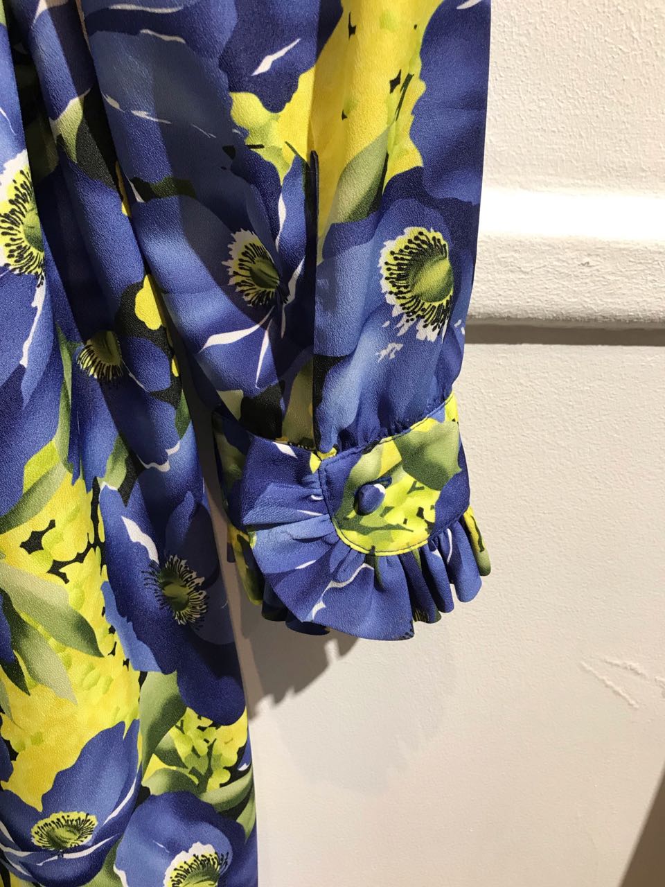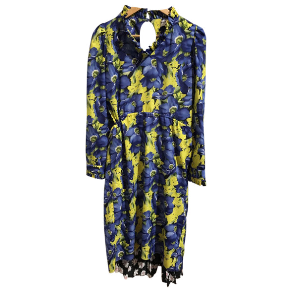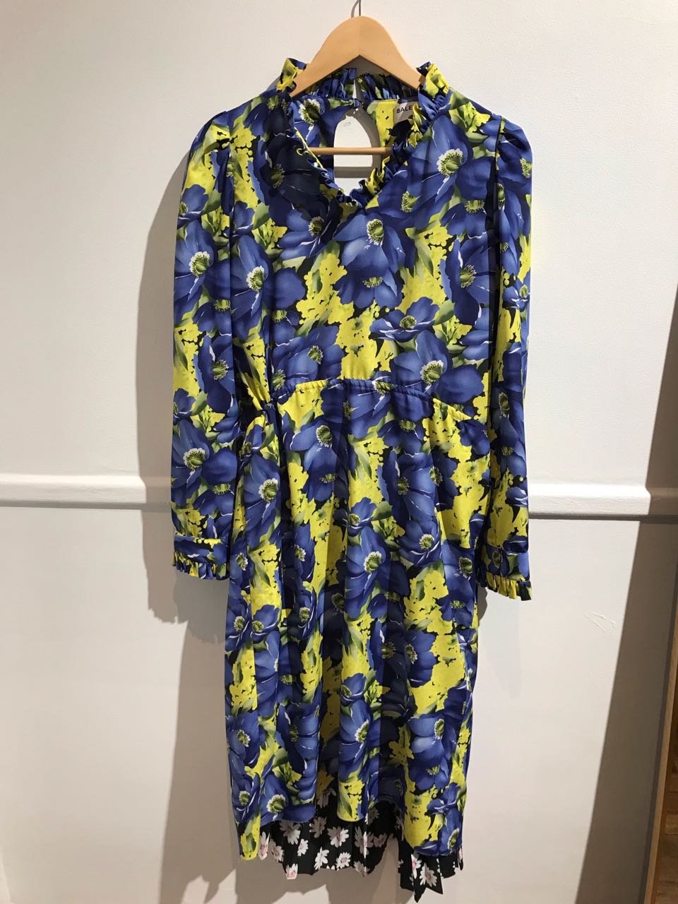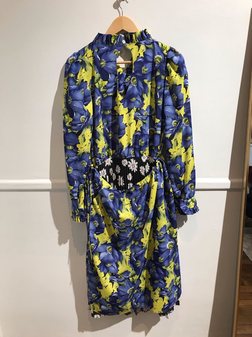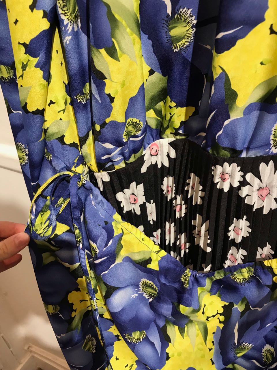 Robe en imprimé fleurs jaune et bleu, jupe en dessous dans un imprimé fleuri différent, noir et blanc.