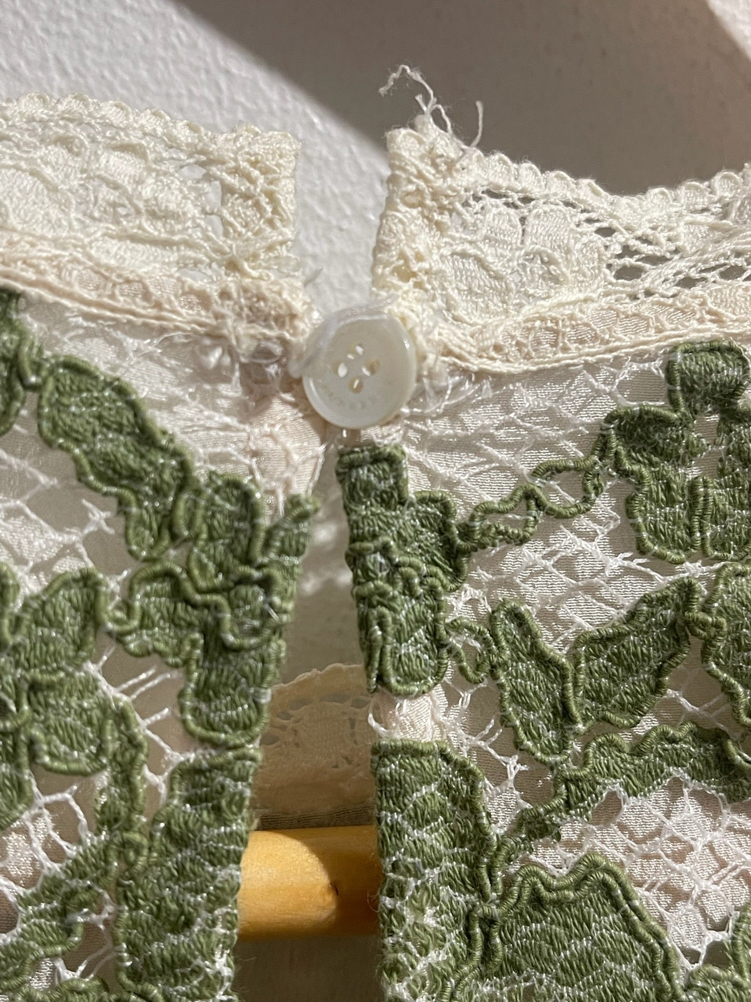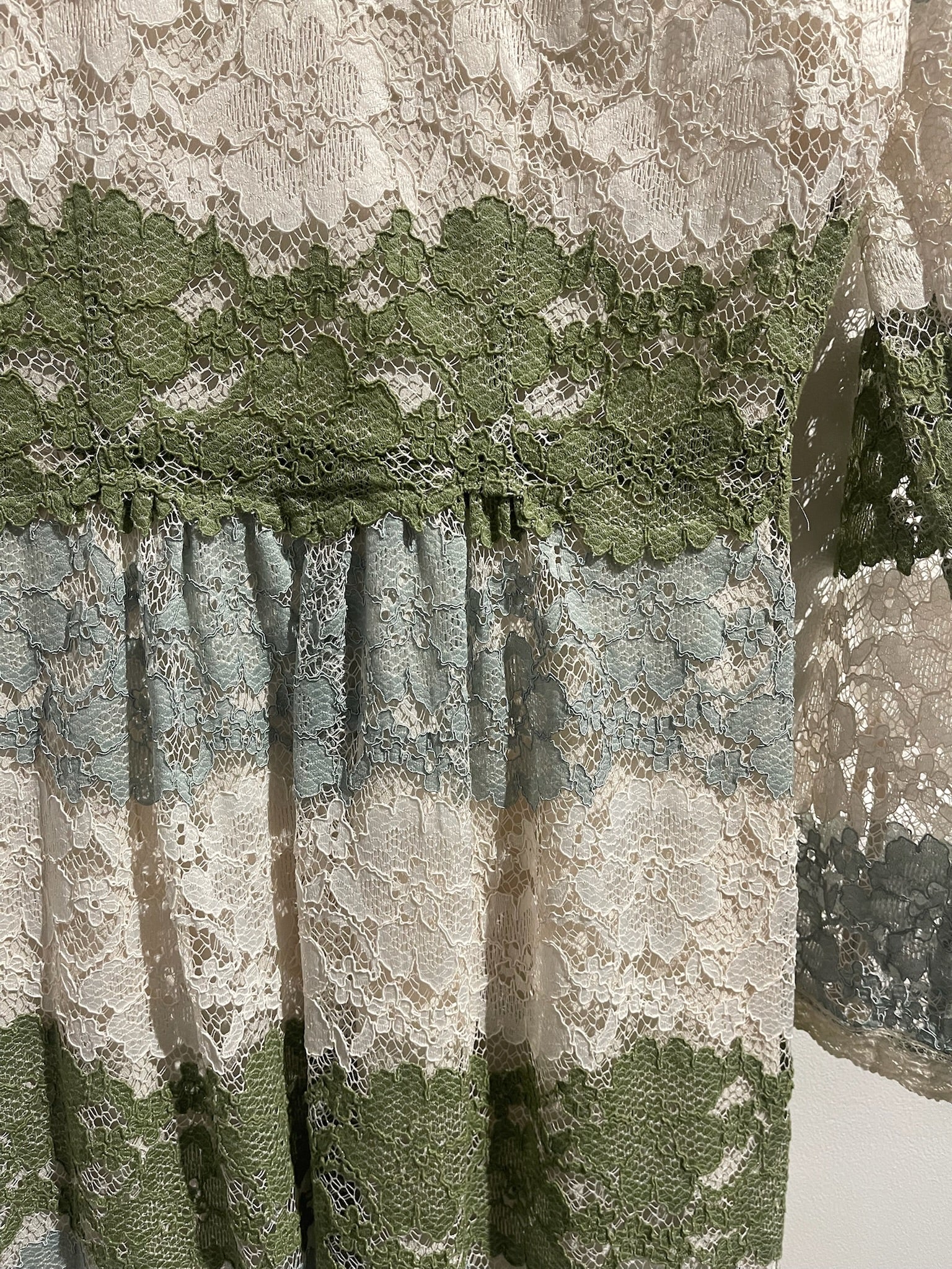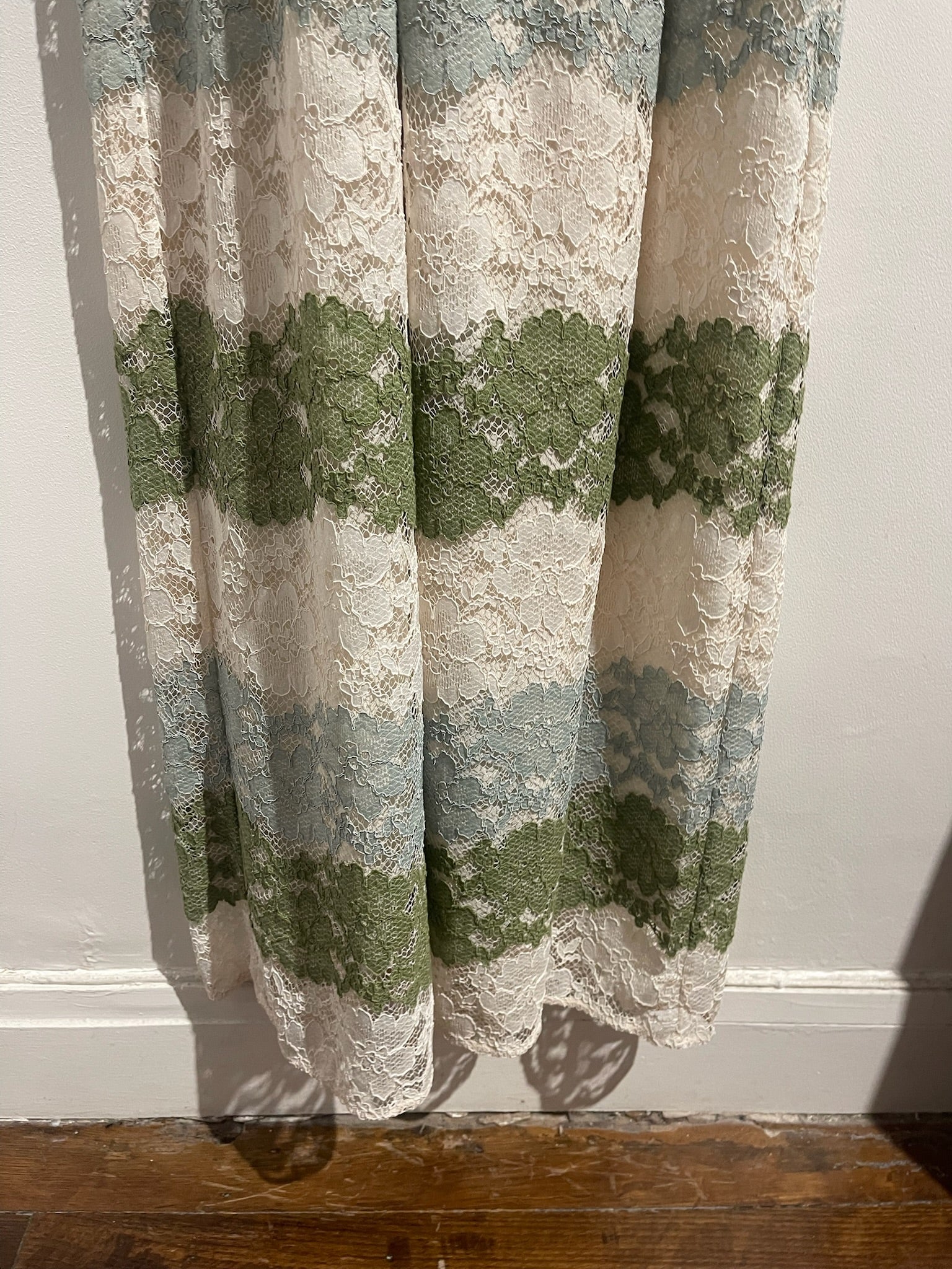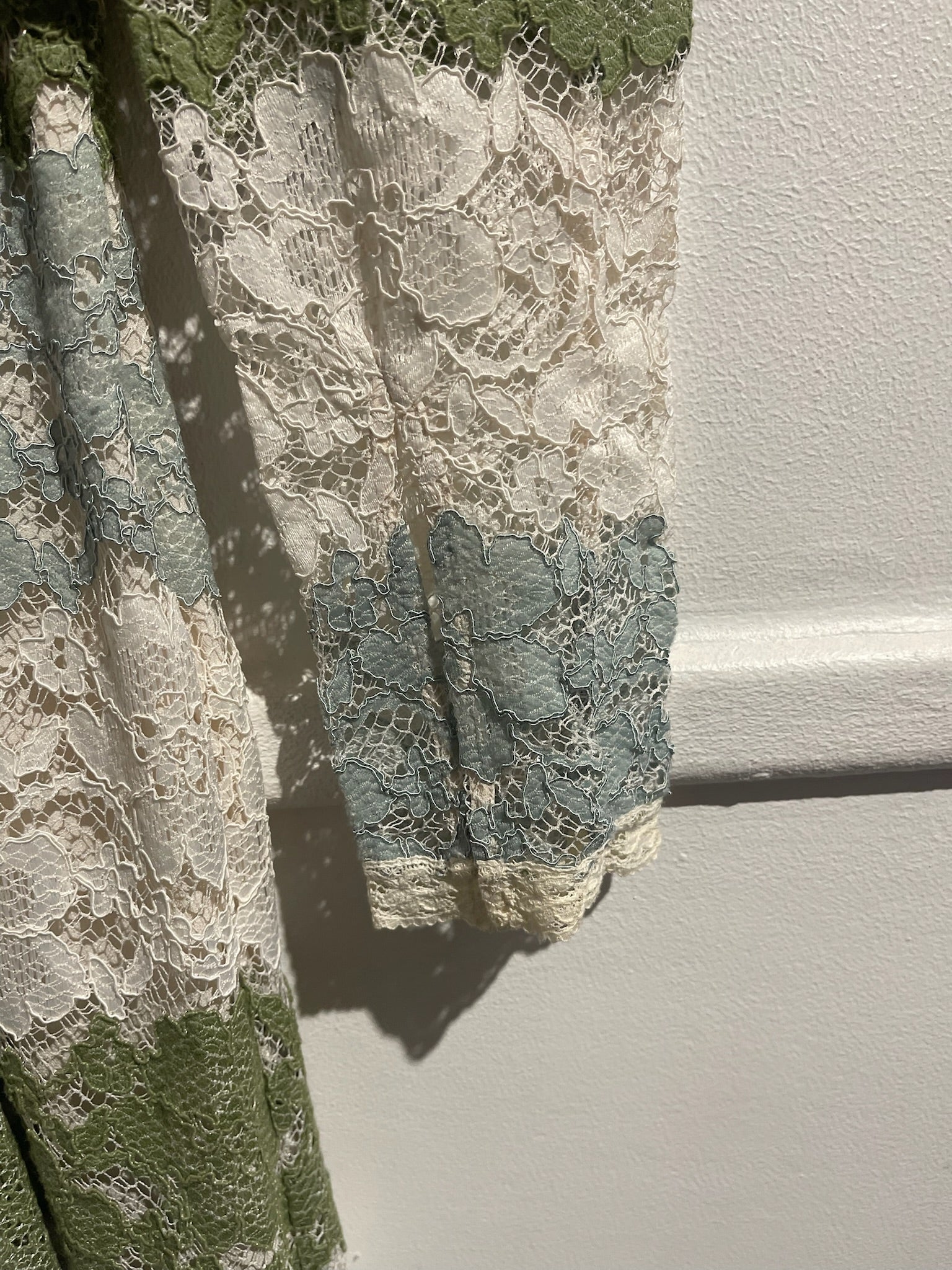 Robe longue en dentelle verte blanche et bleu avec col rond, manches longues et fermeture par bouton au dos du col.