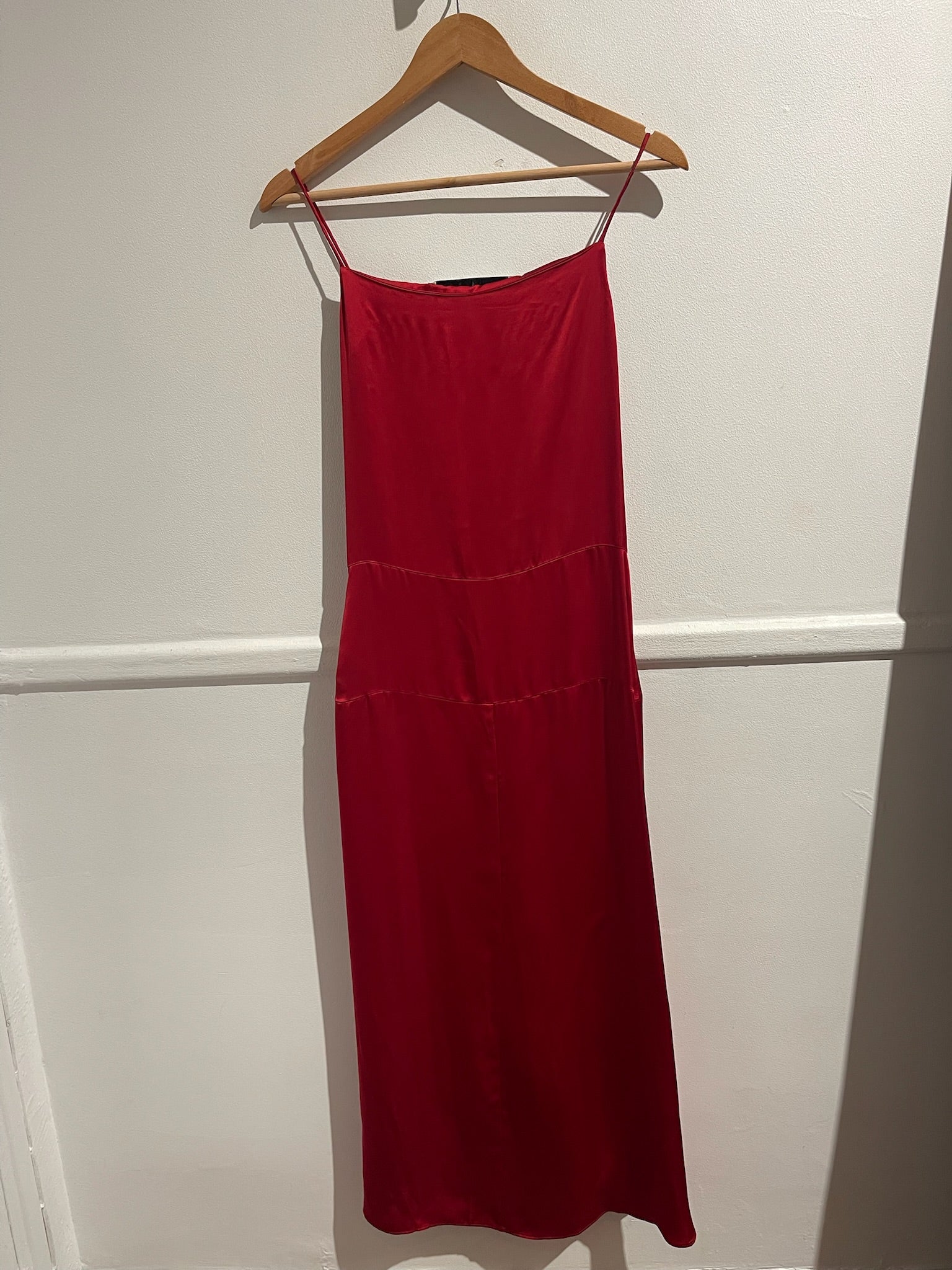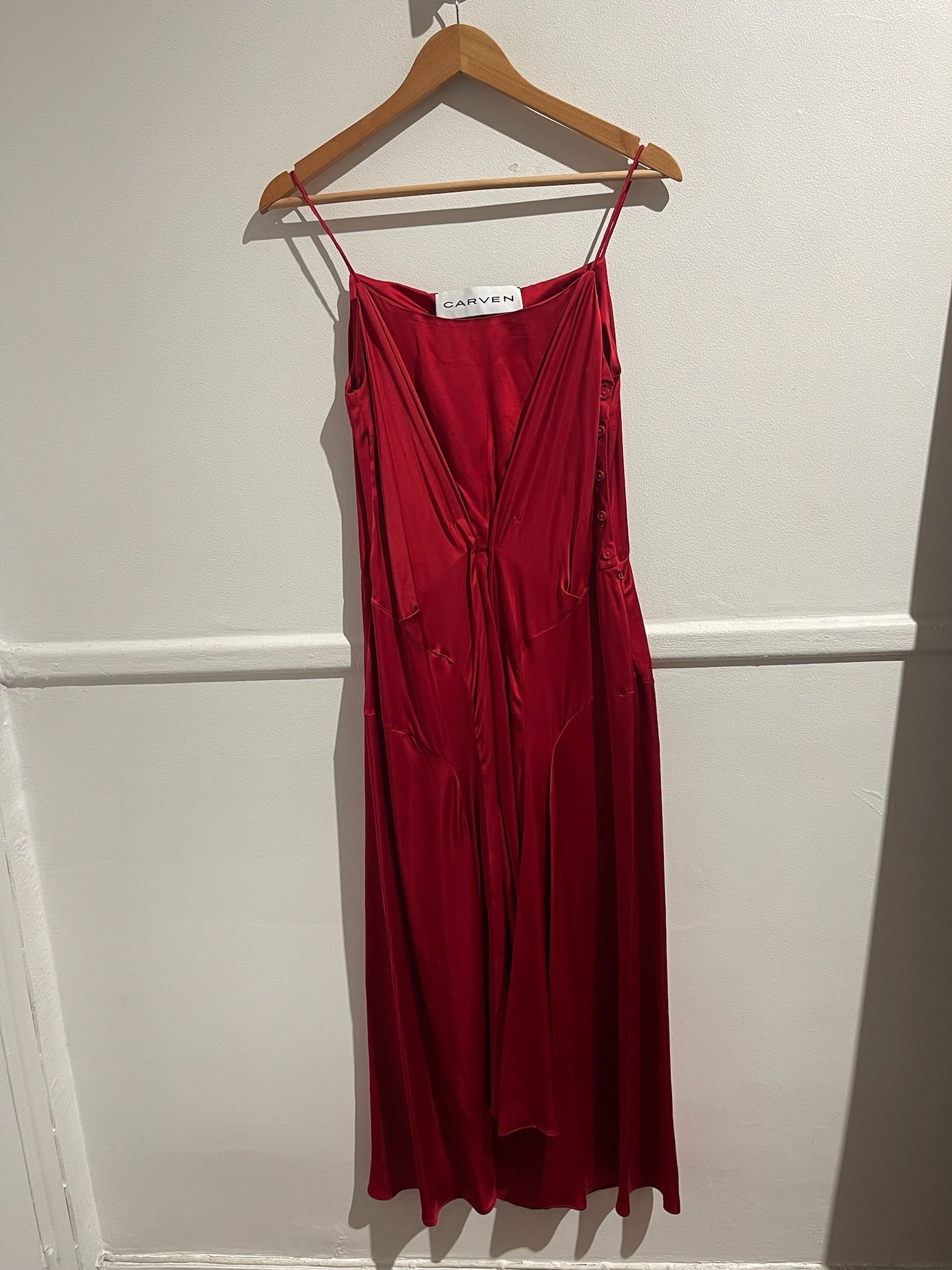 Robe en viscose rouge, à fines bretelles et détail drapé sur la longueur. Fermeture à boutons et zip sur le côté.