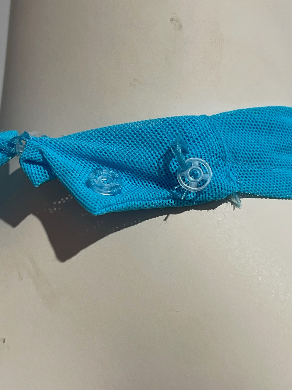 Robe courte en maille stretch transparente bleue avec ouverture au décolleté, manches courtes et logo Coperni en métal argent sur le côté de la taille. Attaches à boutons-pression derrière le cou.