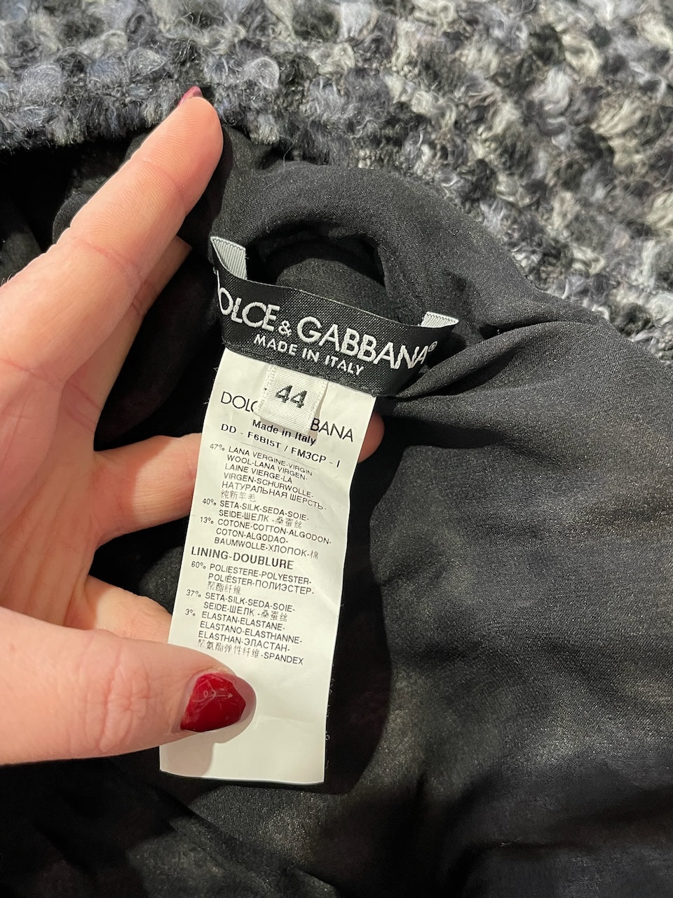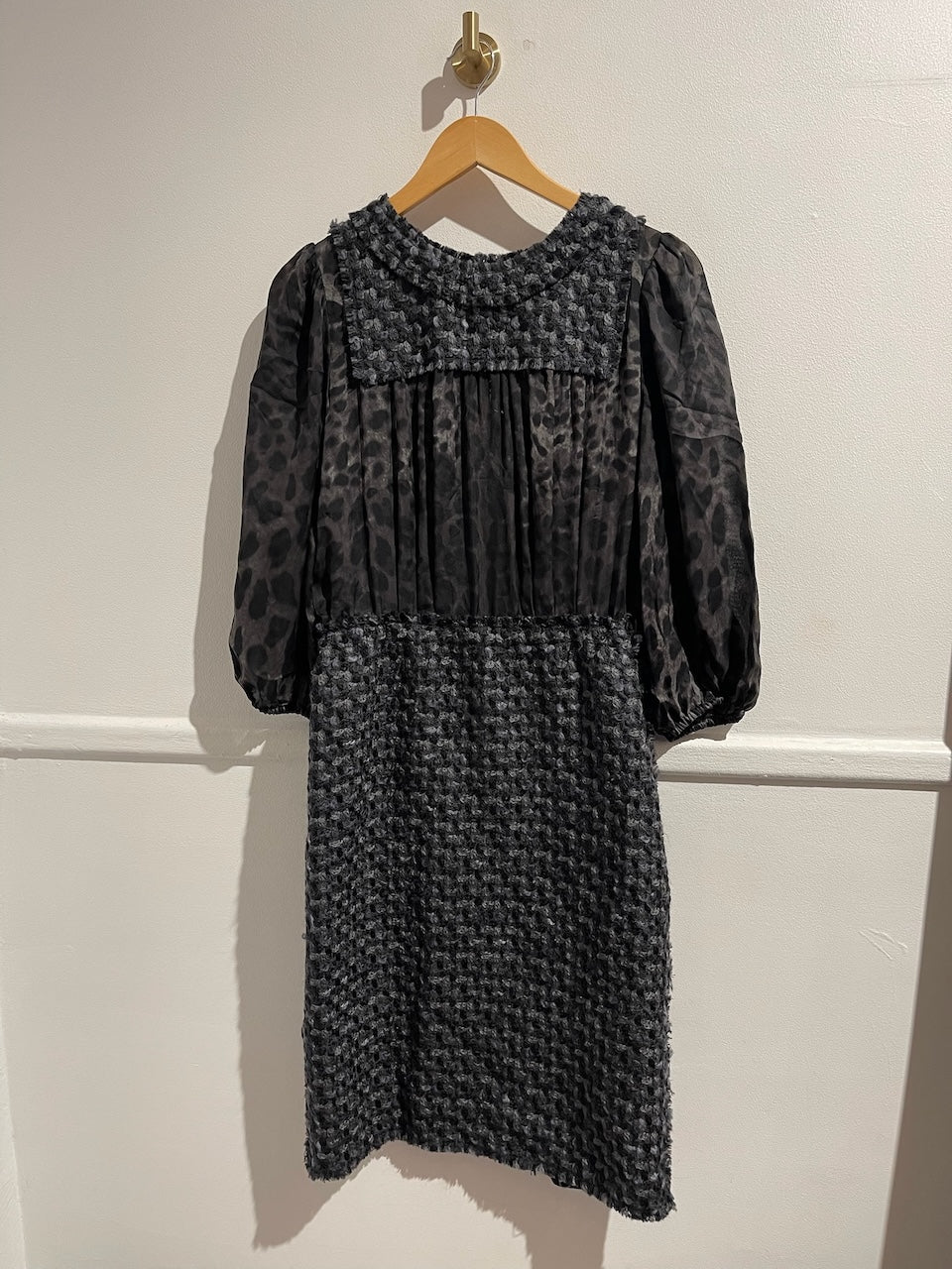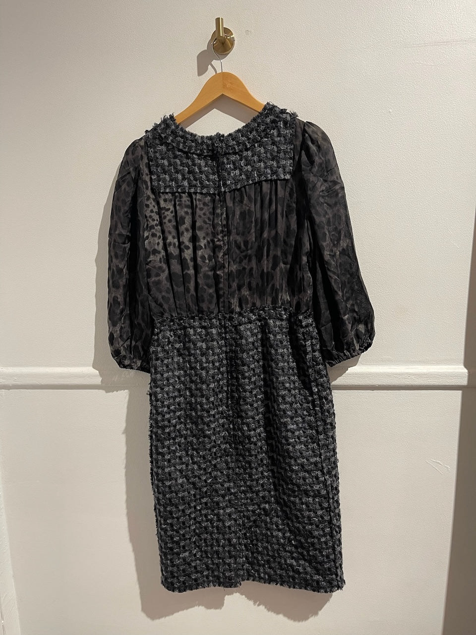 Robe en tweed et soie imprimée léopard noir et gris avec effet de transparence sur la soie, manches longues et fermeture zippée au dos. Poignets resserrés.