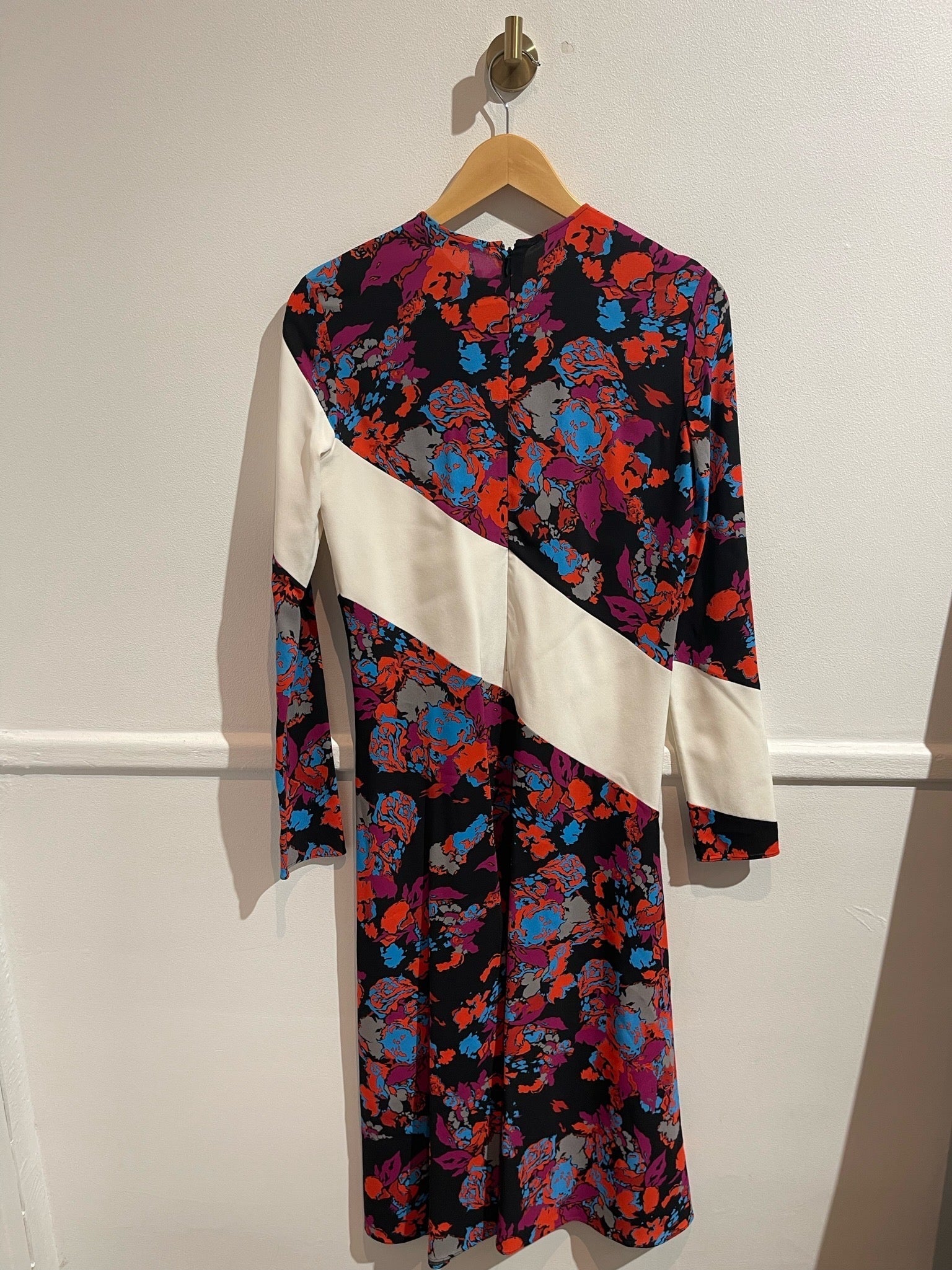 Robe longue en viscose à motif fleuri orange, bleu et violet sur fond noir. Motif coupé par une large rayure blanche. Fermeture zippée à l'arrière. Coupe droite.