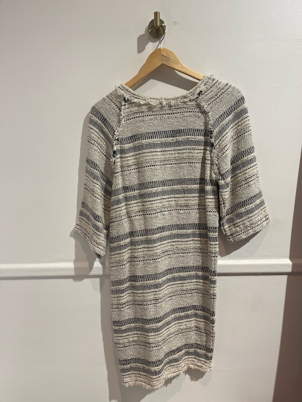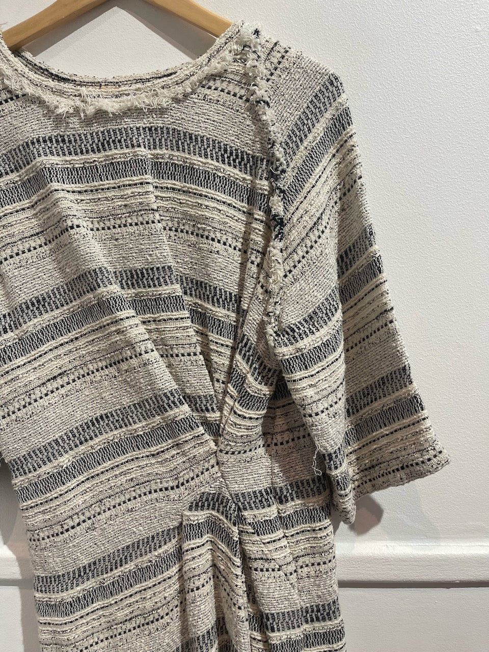 Robe courte en coton mélangé ecru et noir avec effet plissé sur l'avant. Col rond et manches courtes.