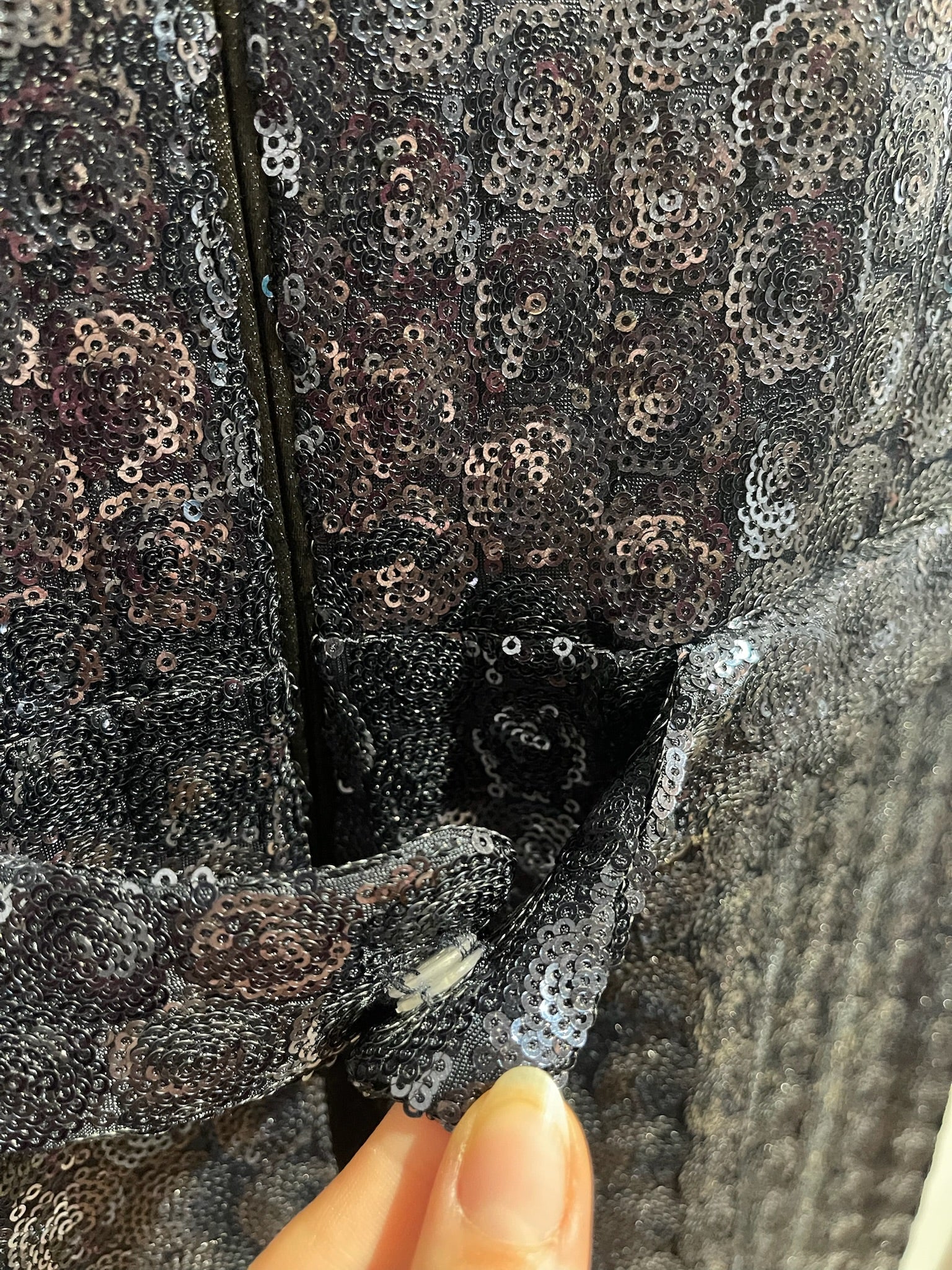 Robe longue sans manches à sequins bleu marine avec col rond, détail ceinturé avec bouton pression à l'arrière et fermeture zippé et crochet. Coupe évasé sur le bas.