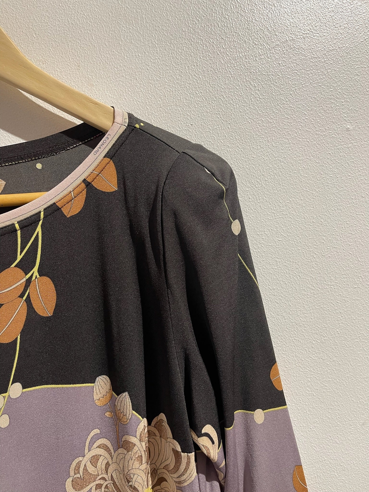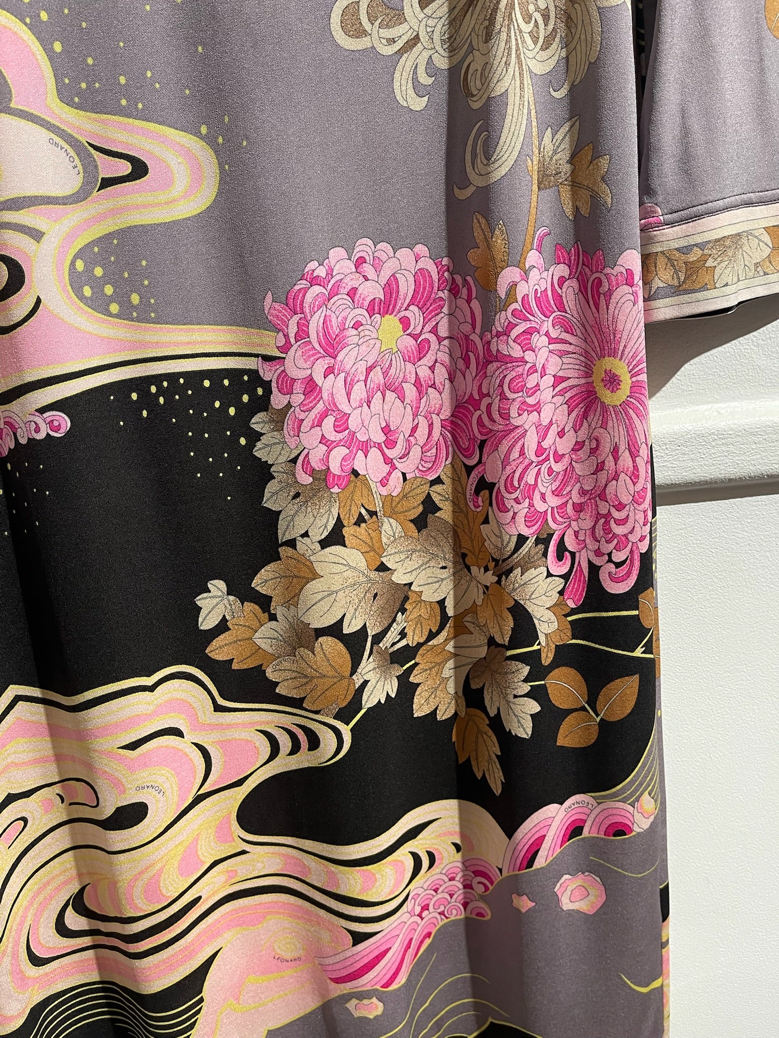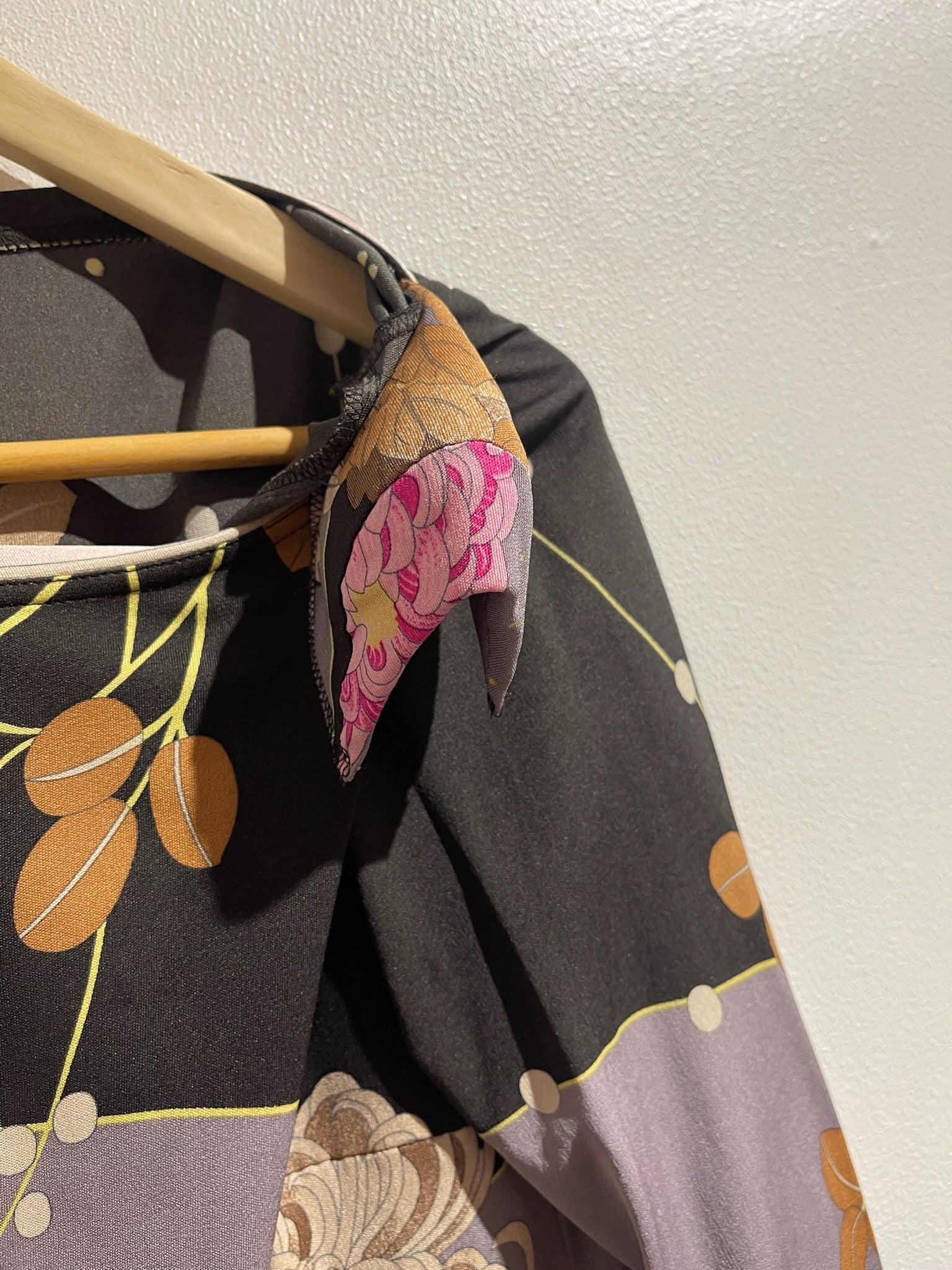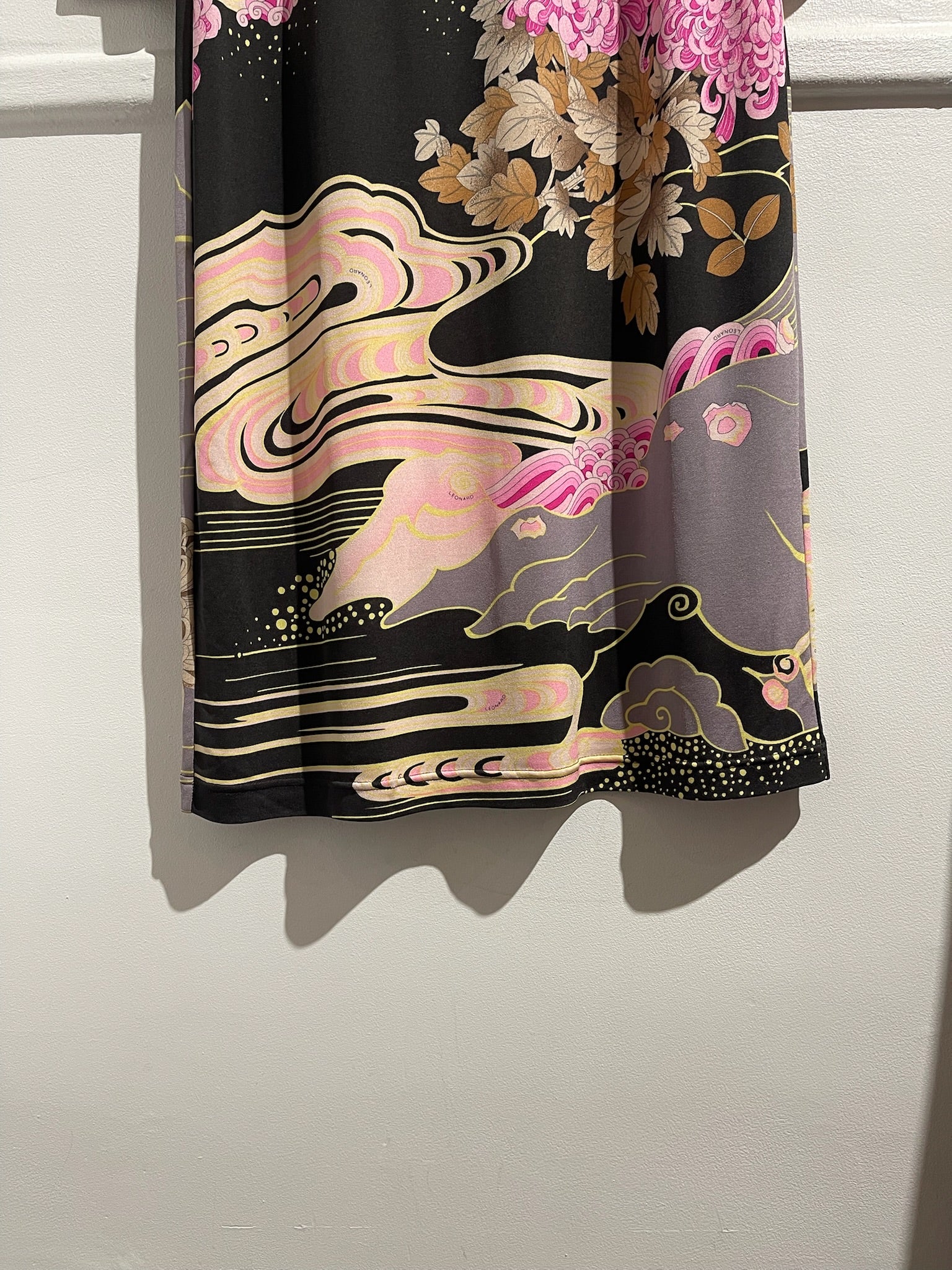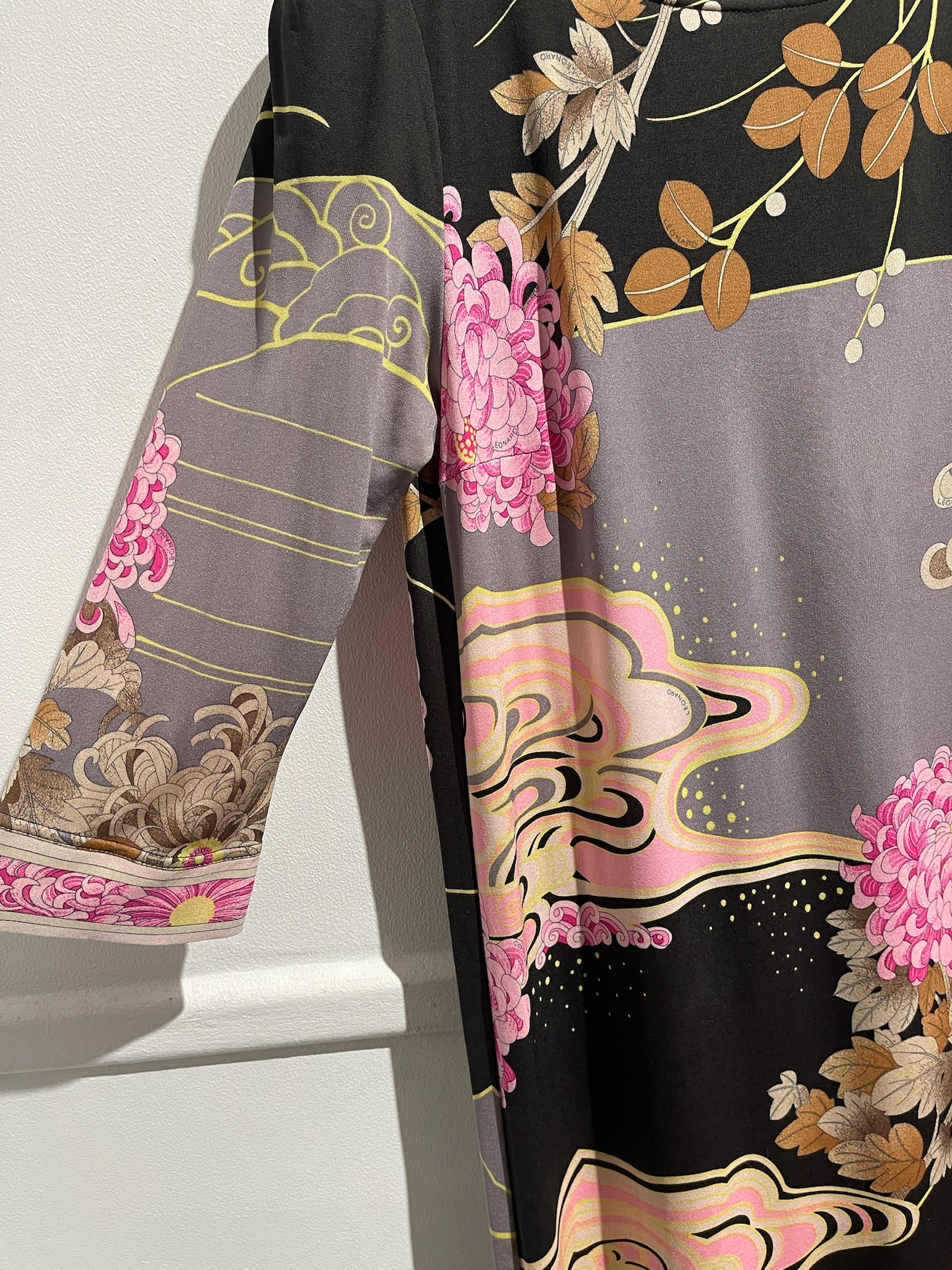 Robe 100% soie imprimée japonais dans les tons rose, noir et gris. Col rond, épaulettes et manches 3/4. Coupe droite et fluide.