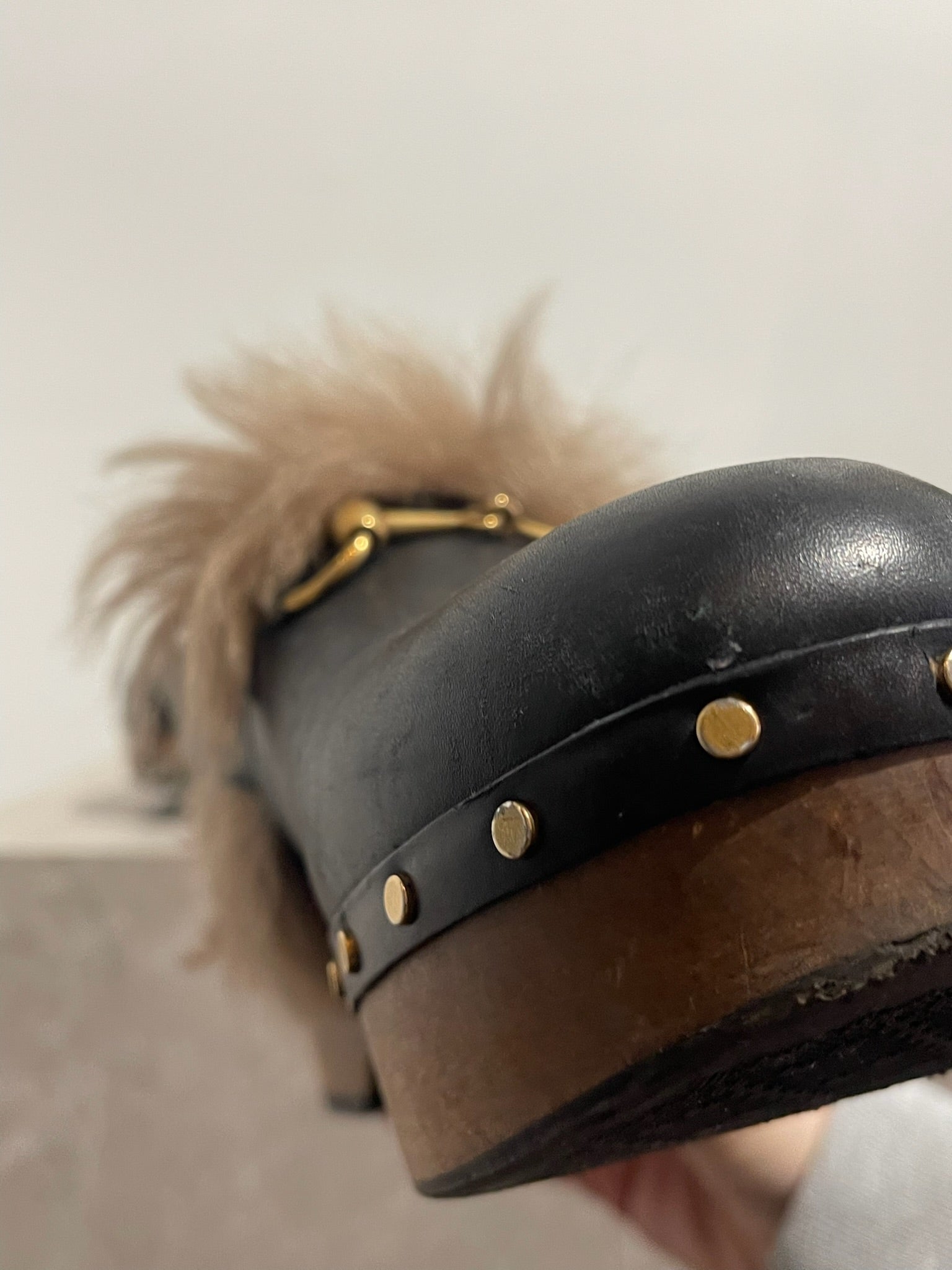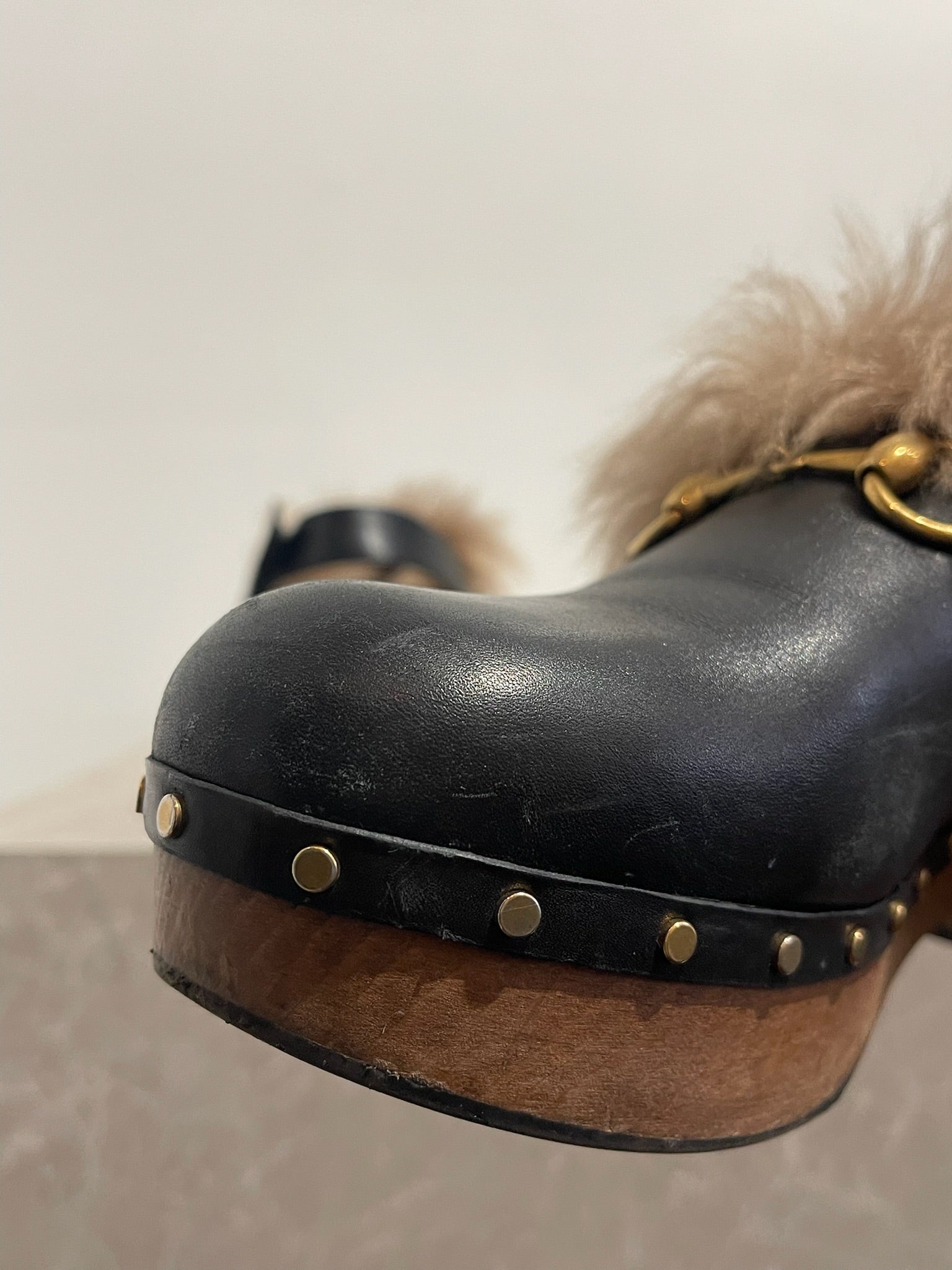 Sabots en cuir noir doublés de fourrure naturelle avec semelles en bois et détail de mors à l'avant. Fermeture par attache à l'arrière.