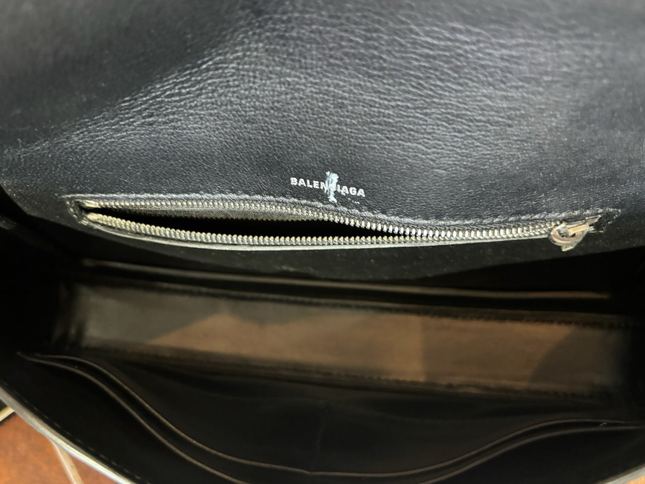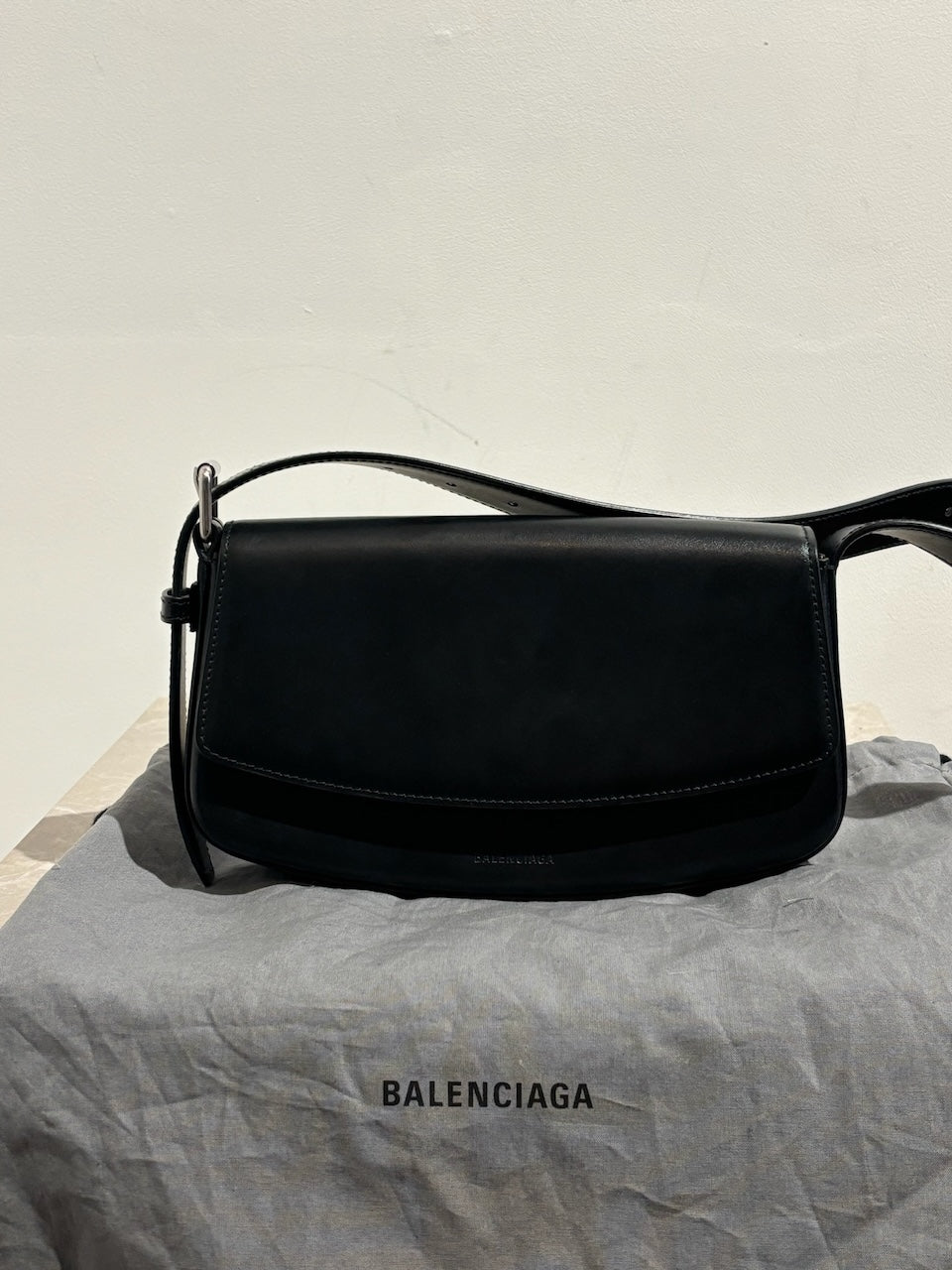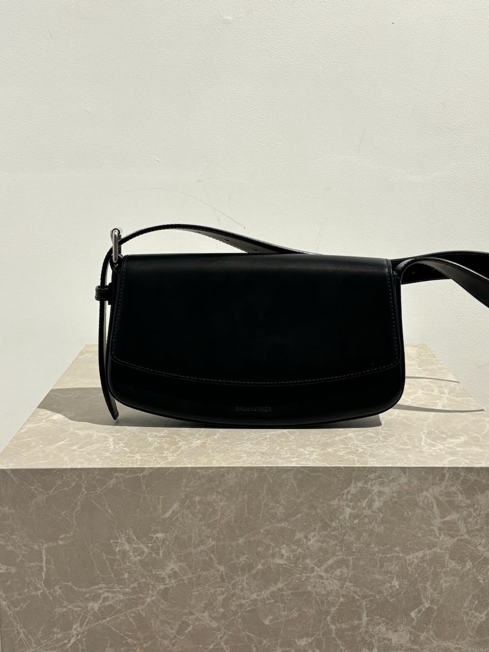 Sac en cuir noir, forme baguette, pour un porté épaule avec fermeture à rabat pression et logo Balenciaga incrusté à l'avant. Anse ajustable. Bijouterie argentée.