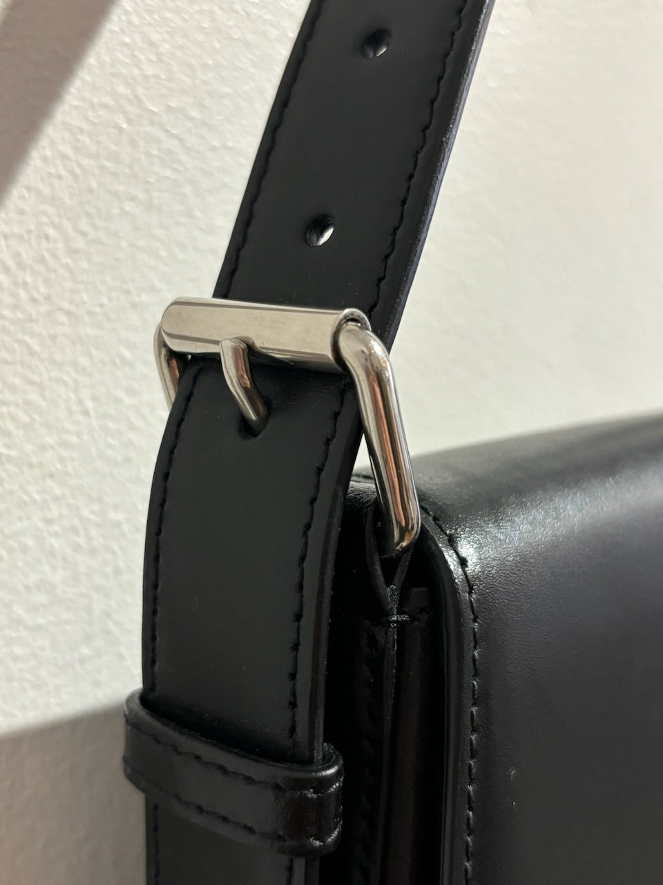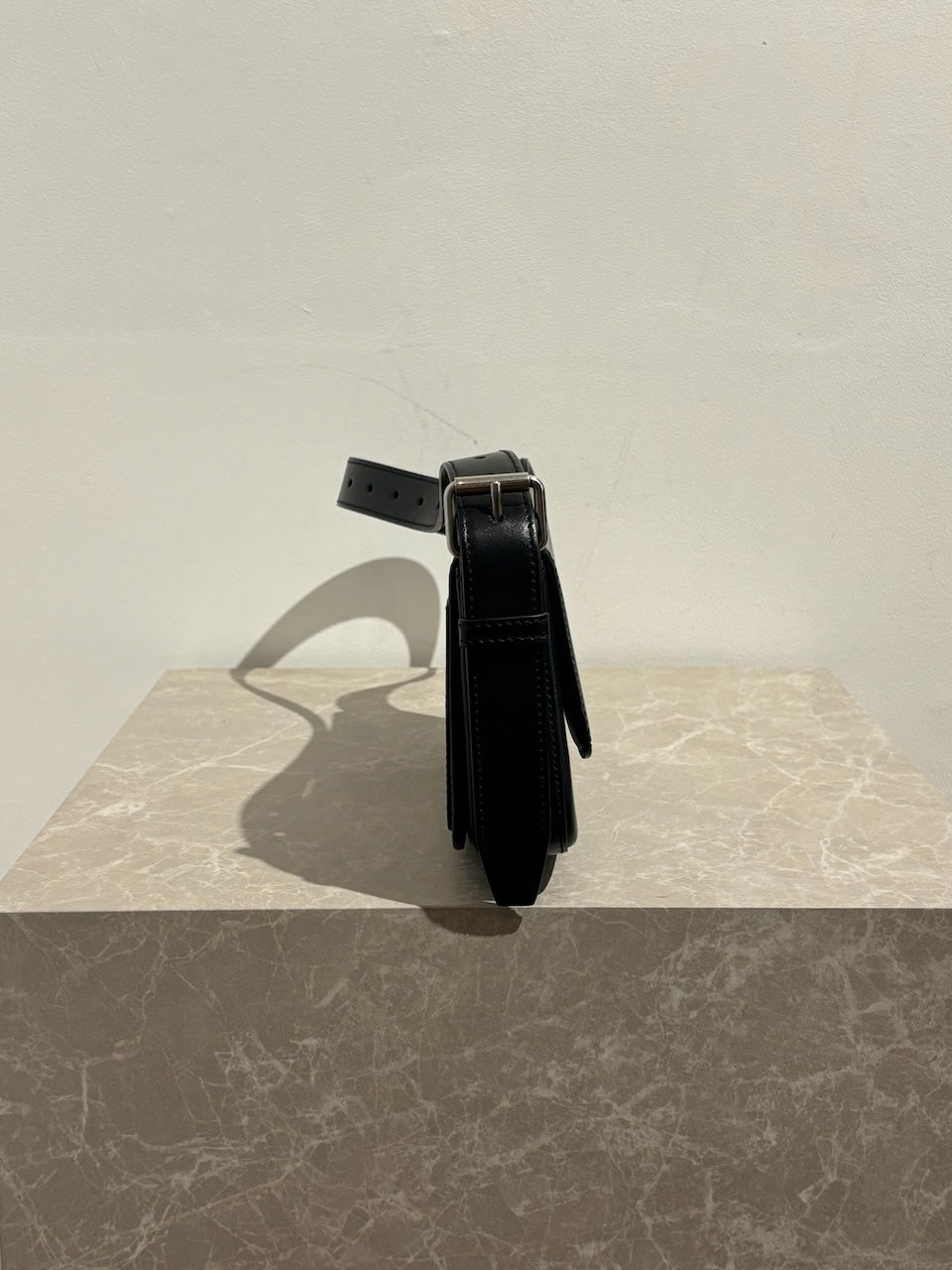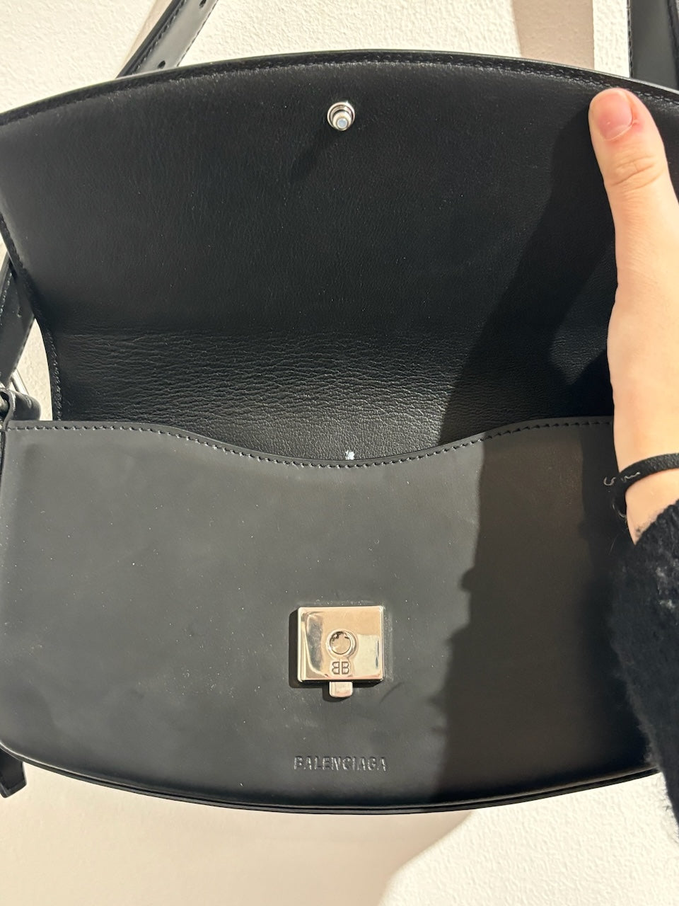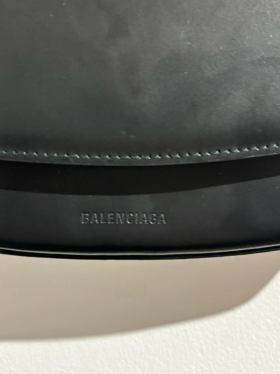 Sac en cuir noir, forme baguette, pour un porté épaule avec fermeture à rabat pression et logo Balenciaga incrusté à l'avant. Anse ajustable. Bijouterie argentée.