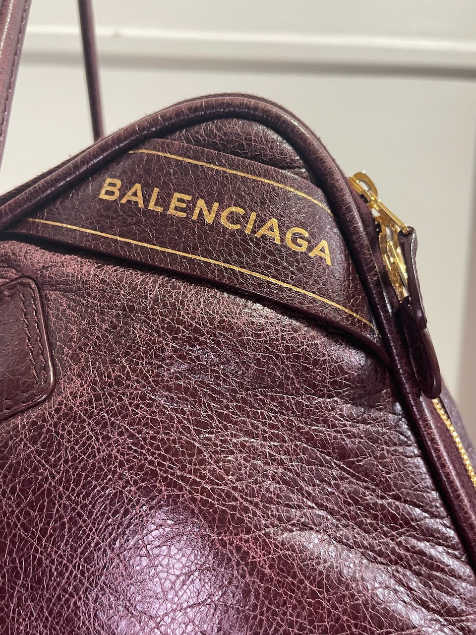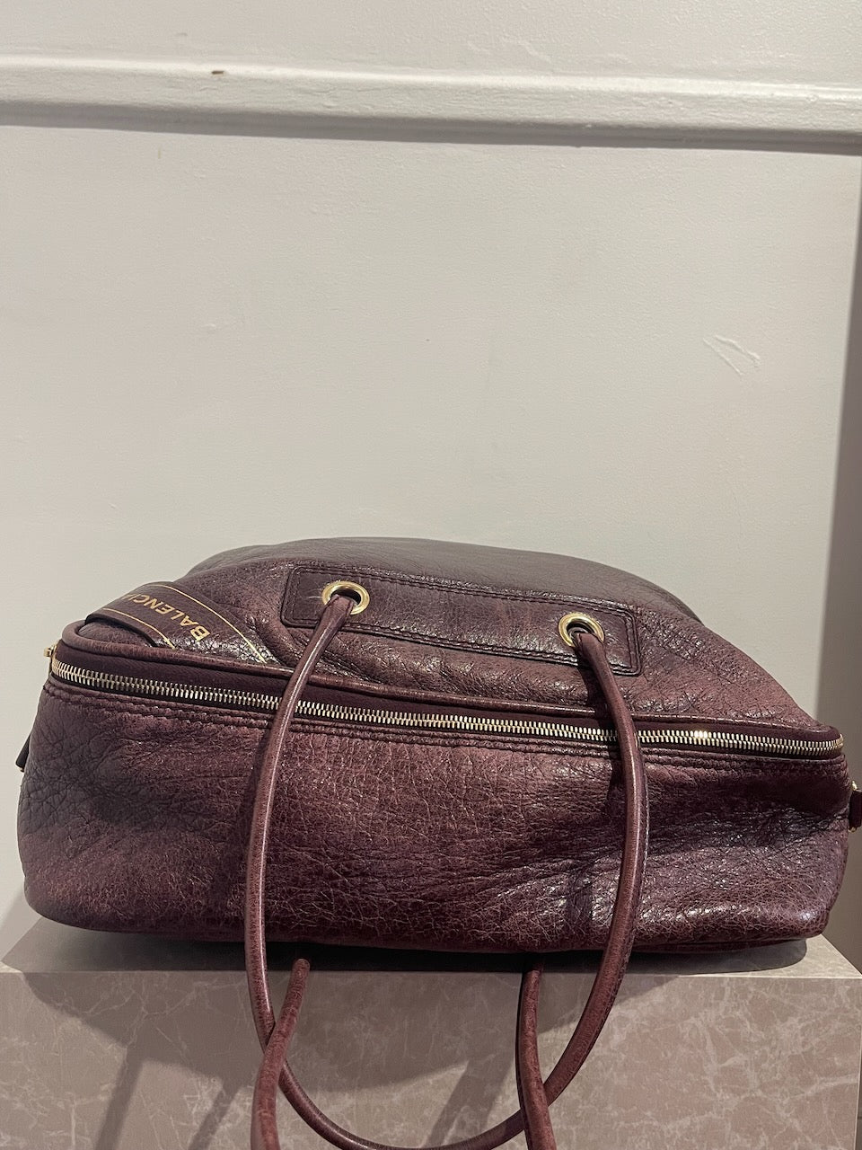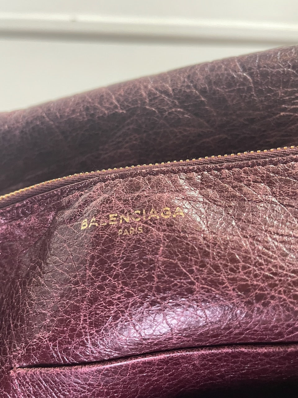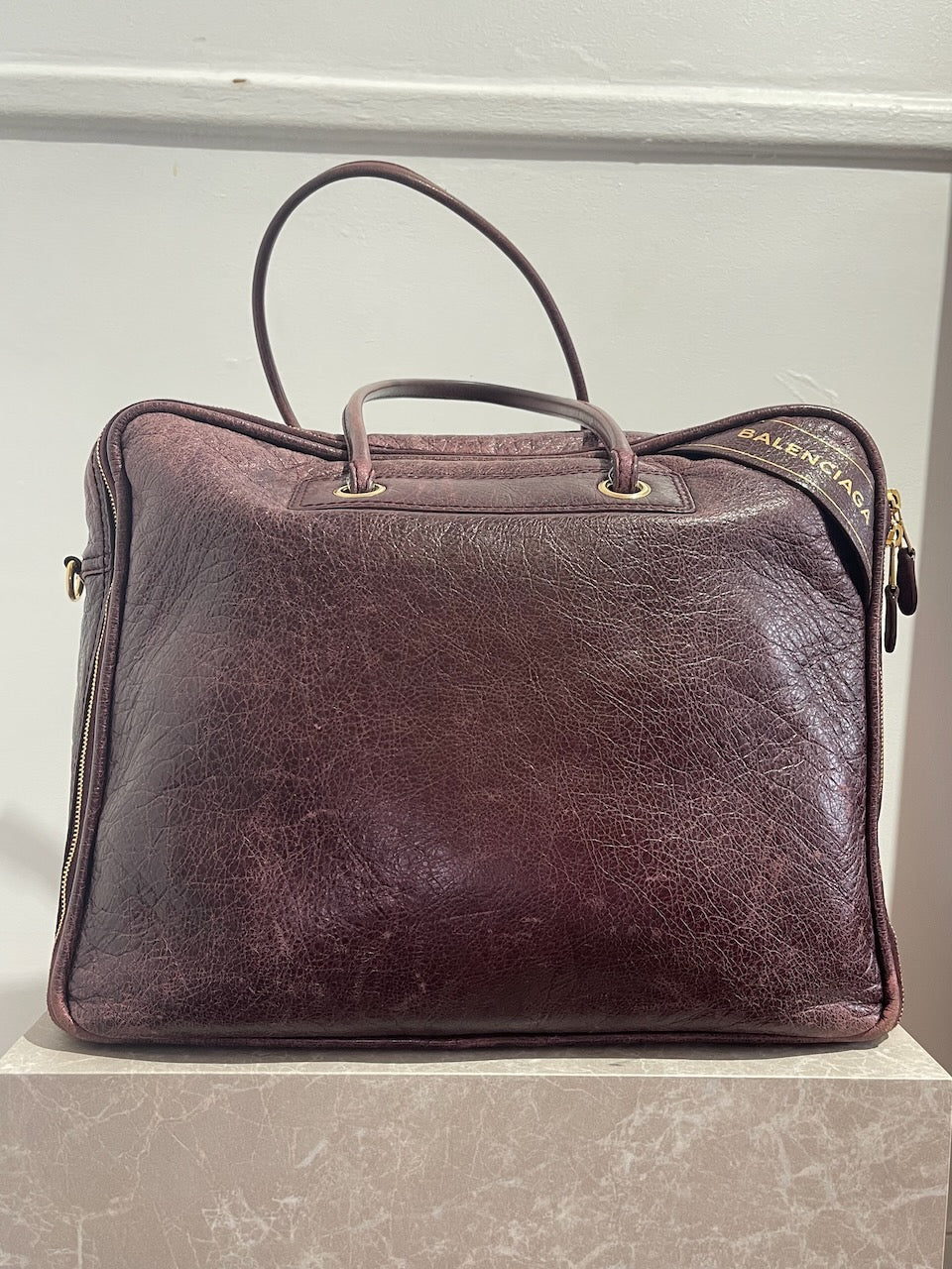 Original sac à main Balenciaga Blanket Square moyen modèle en cuir couleur violet foncé. Garniture en métal doré, double poignée pour un porté épaule ou main. Fermeture zippée. Possibilité de rajouter une anse bandoulière.