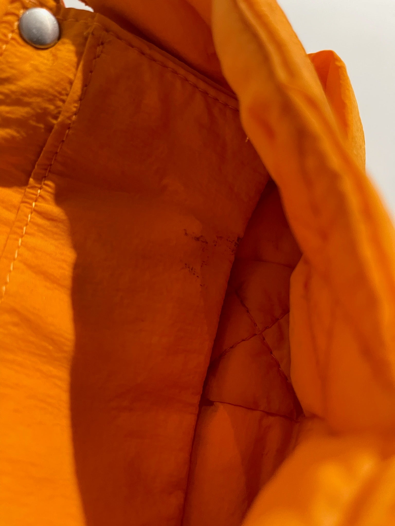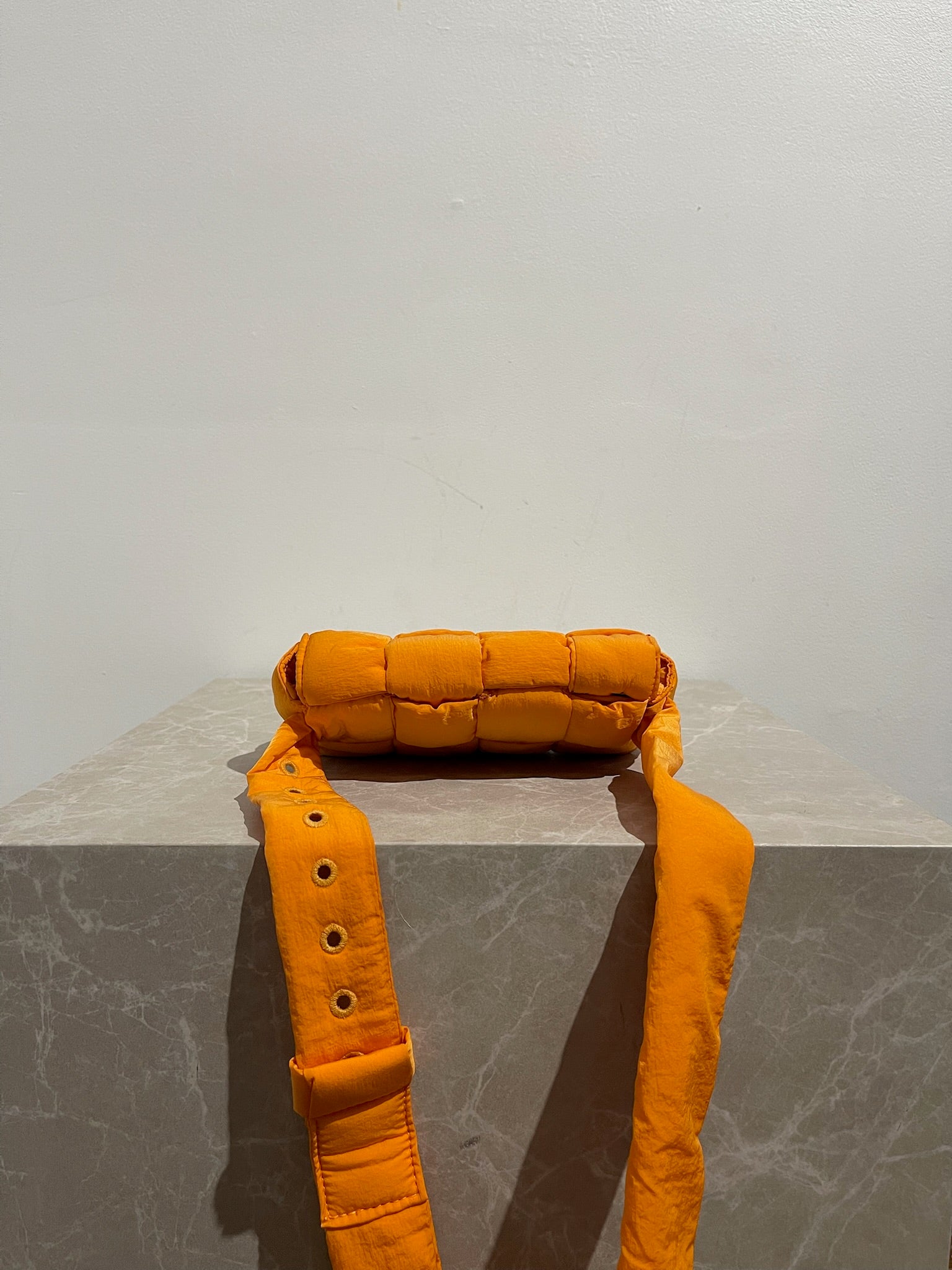 Sac en tissu Intrecciato orange, tressage orthogonal signature avec anse longue ajustable pour un porté bandoulière ou ceinture. Fermeture à rabat magnétique. Poche intérieure plate.
