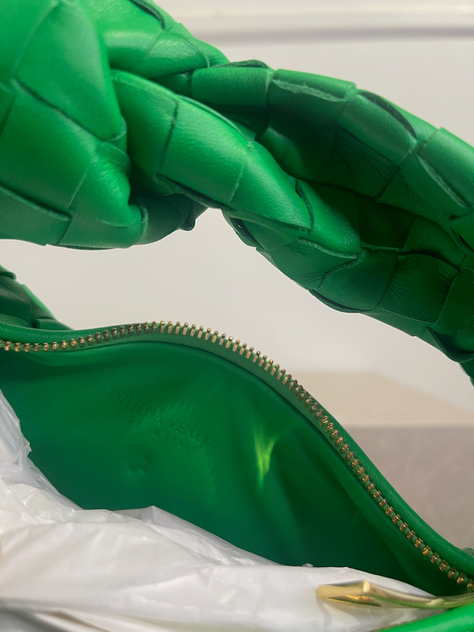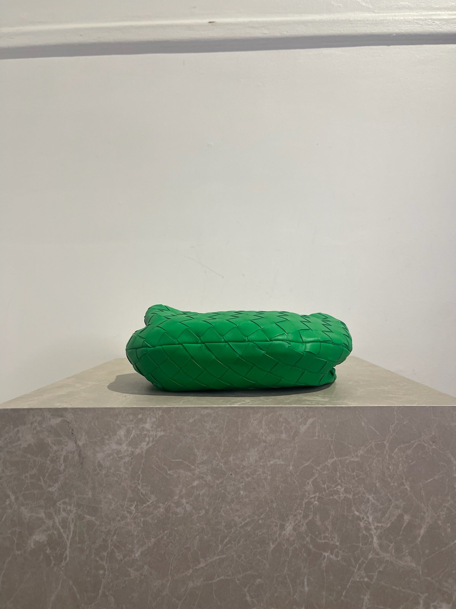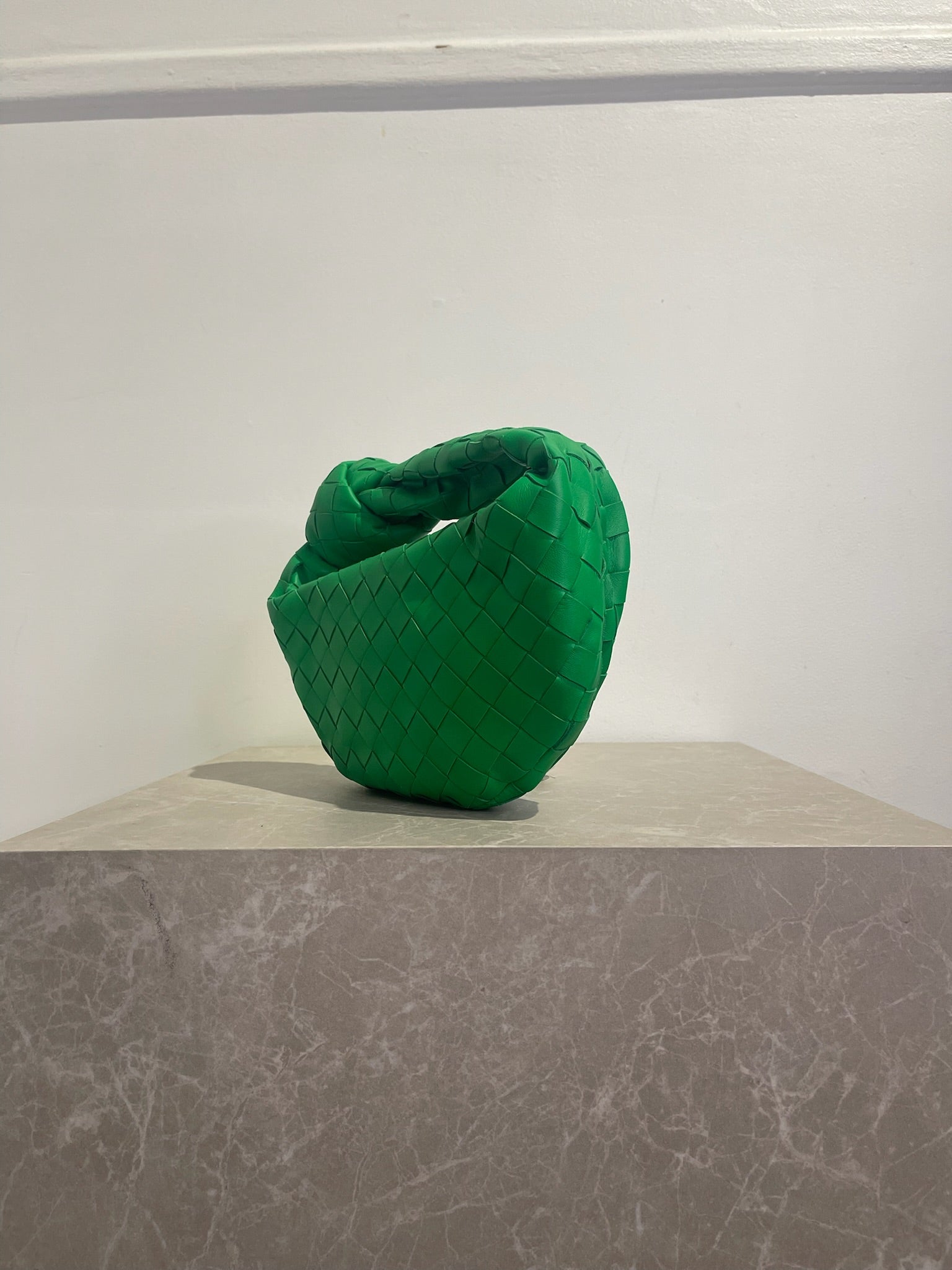 Sac à main en cuir tressé intrecciato vert avec anse à détail noué et fermeture zippée.