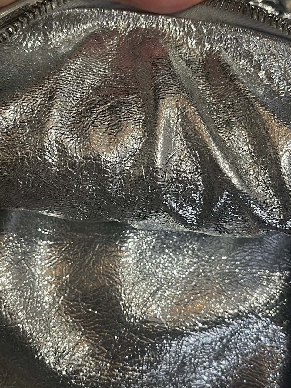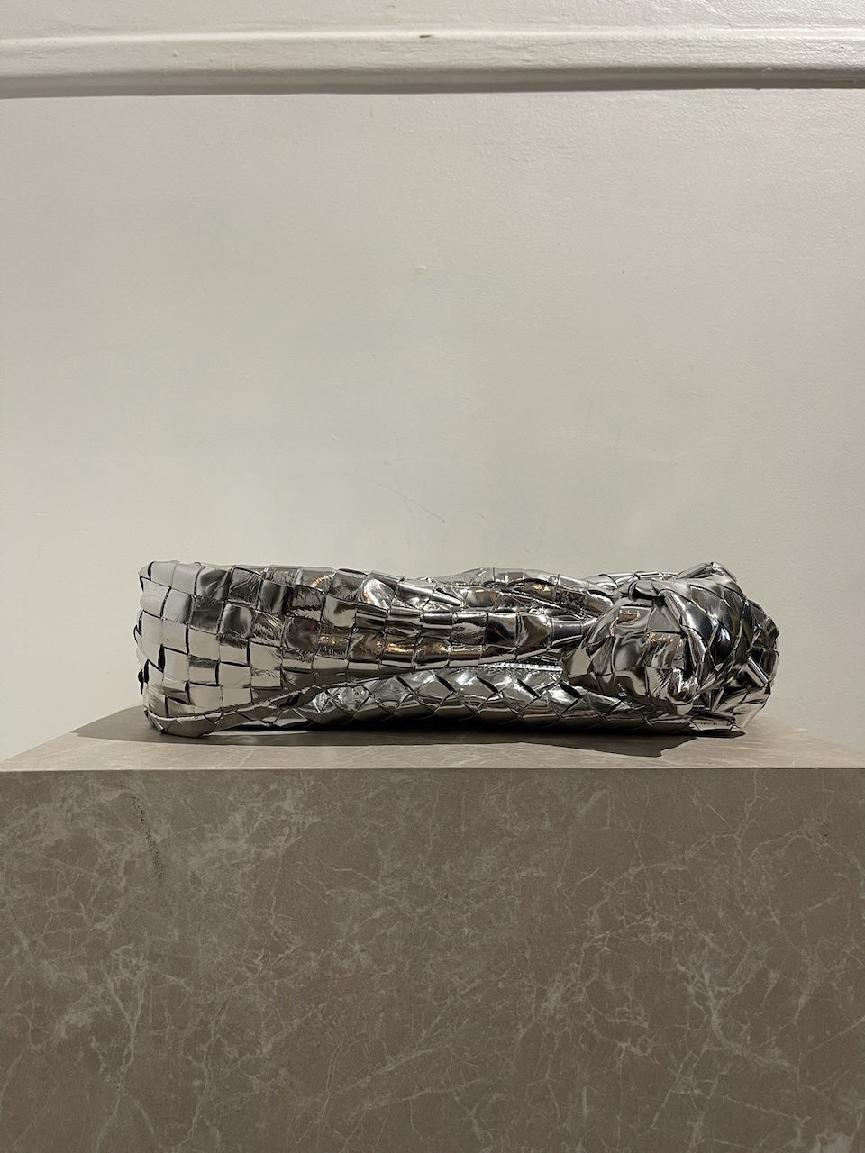 Sac à main en cuir tressé intrecciato argenté avec anse à détail noué et fermeture zippée. Cuir métallisé effet froissé.