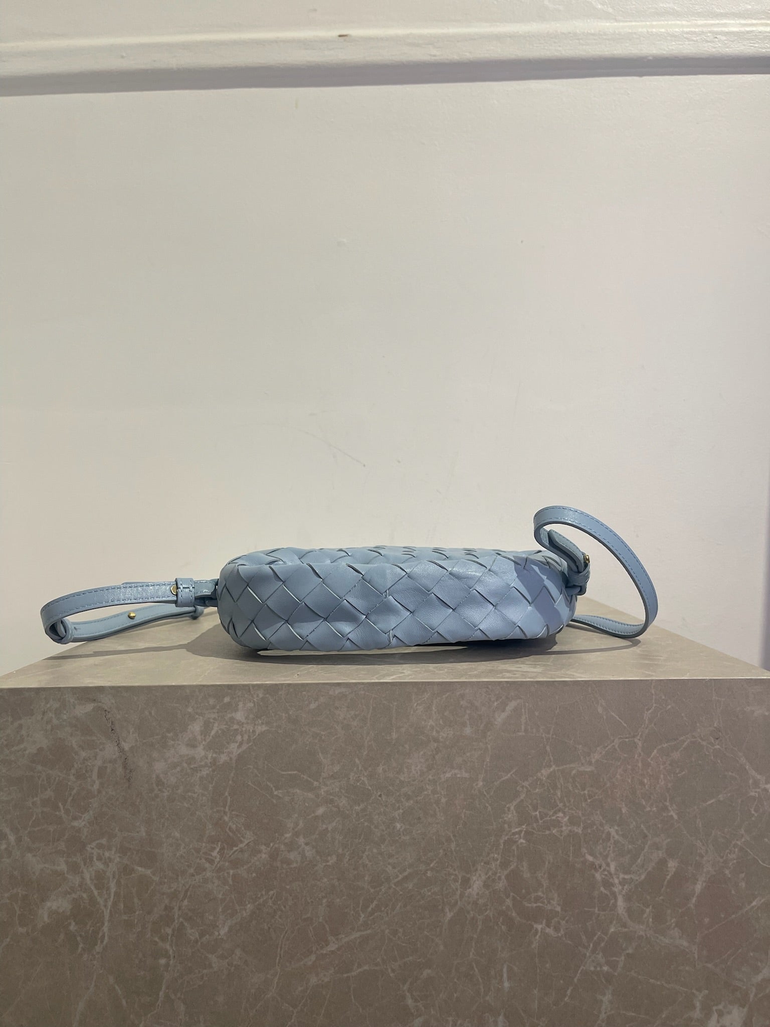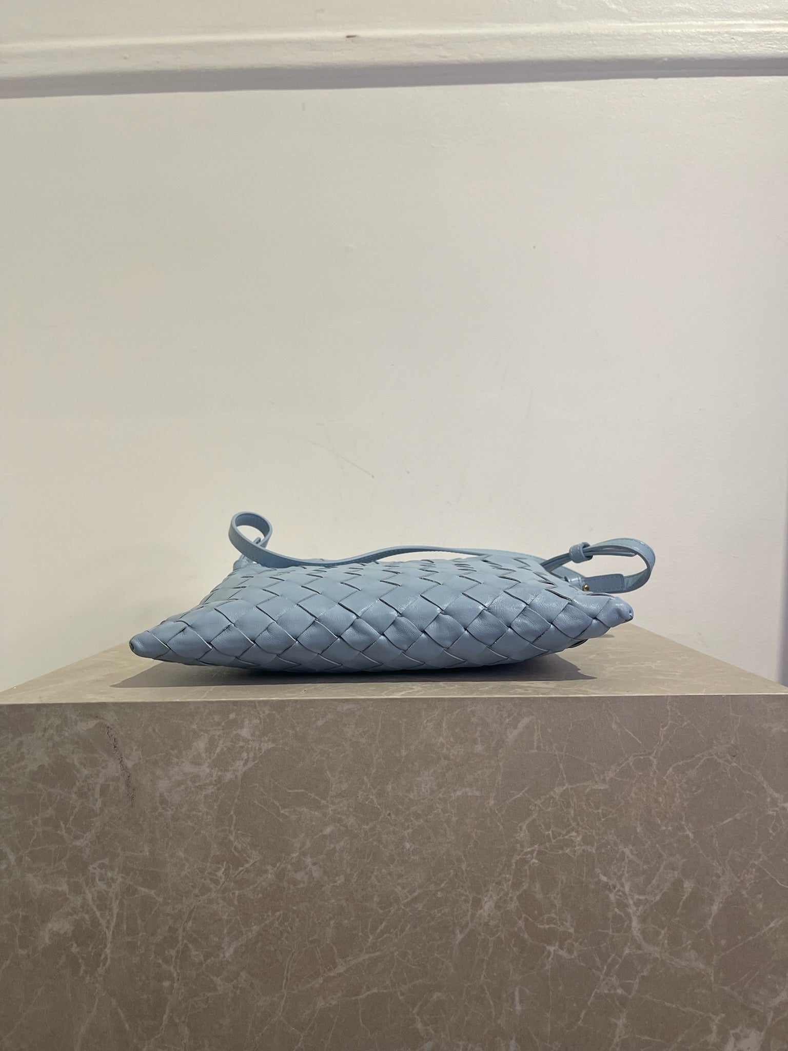 Sac à main en cuir tressé intrecciato bleu ciel avec petite anse sur le dessus pour un porté main et bandoulière réglable et amovible pour un porté crossbody. Fermeture aimantée.