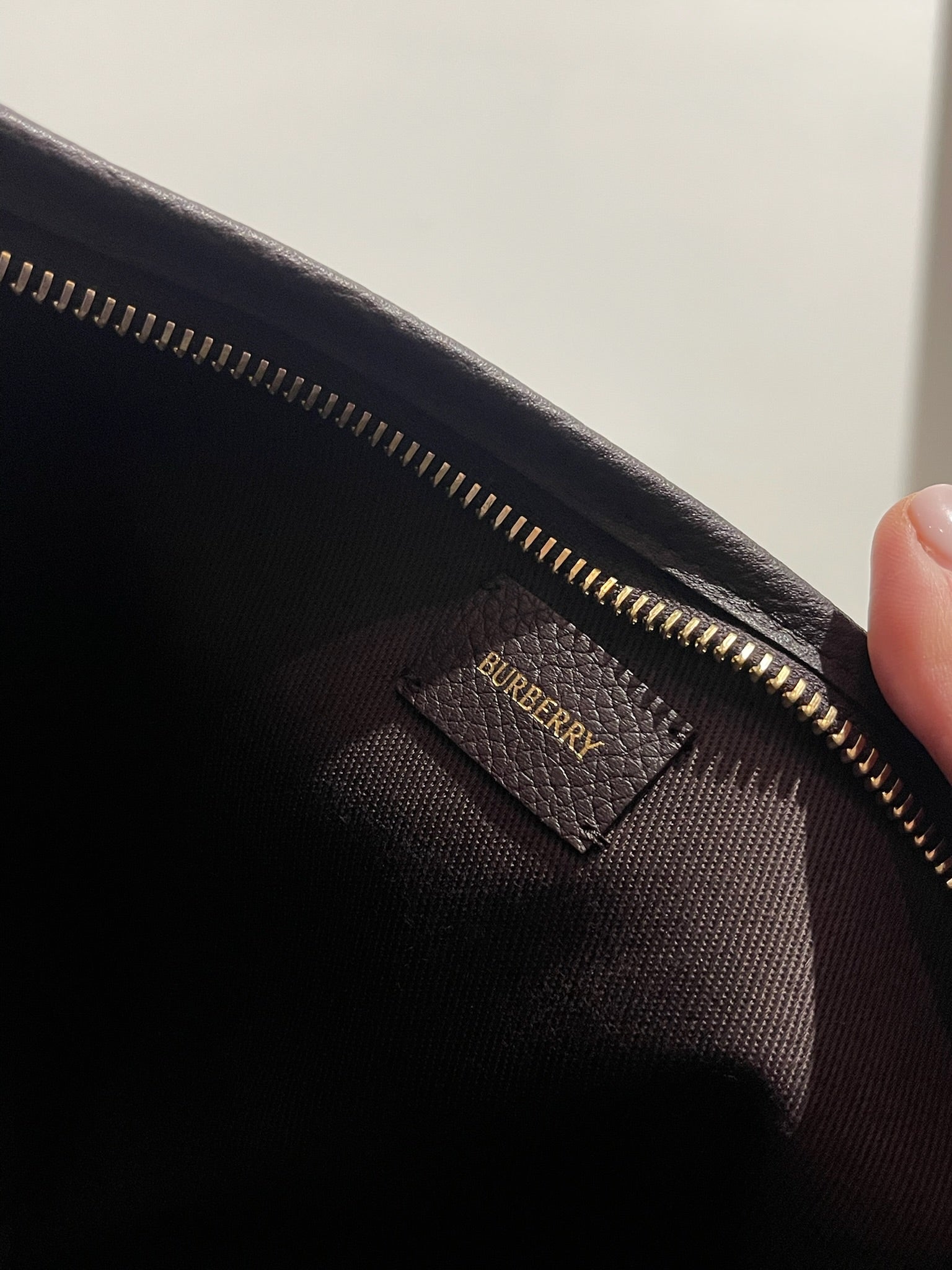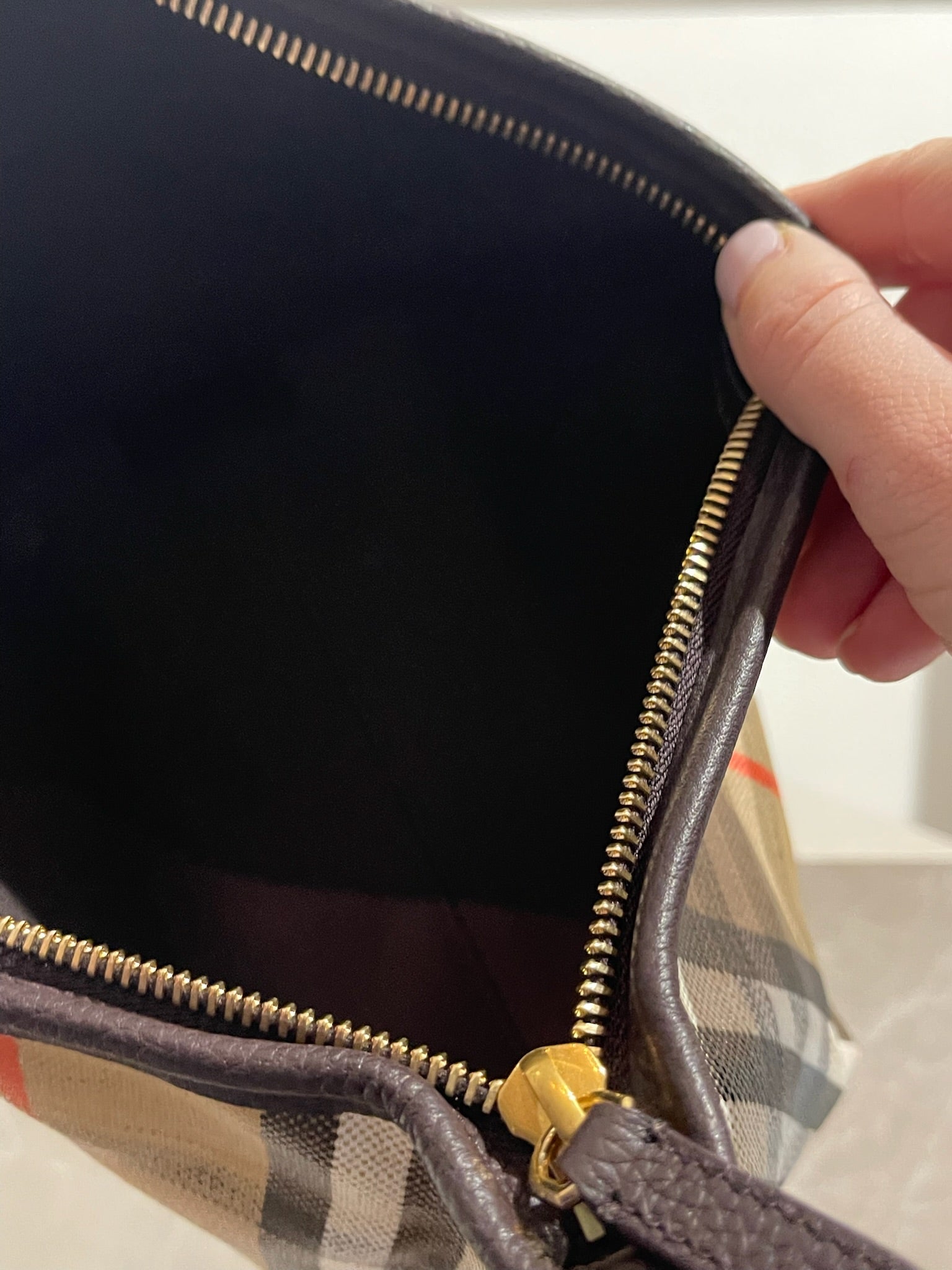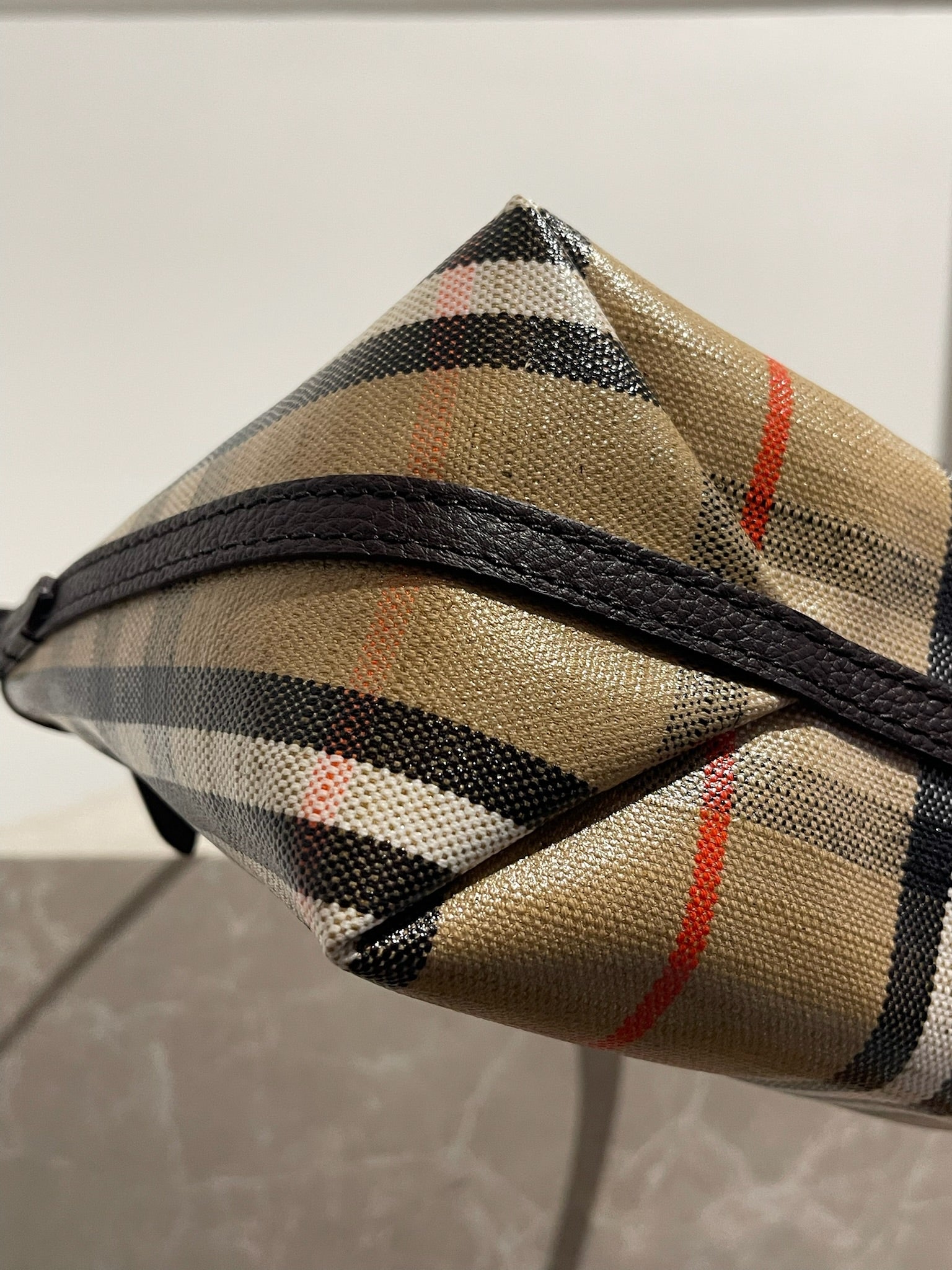 Sac coton et de lin enduit avec garnitures en cuir marron. Imprimé tissage jacquard à carreaux Burberry. Anse principal fine est scellée du cachet Knight. Fermeture zippée.