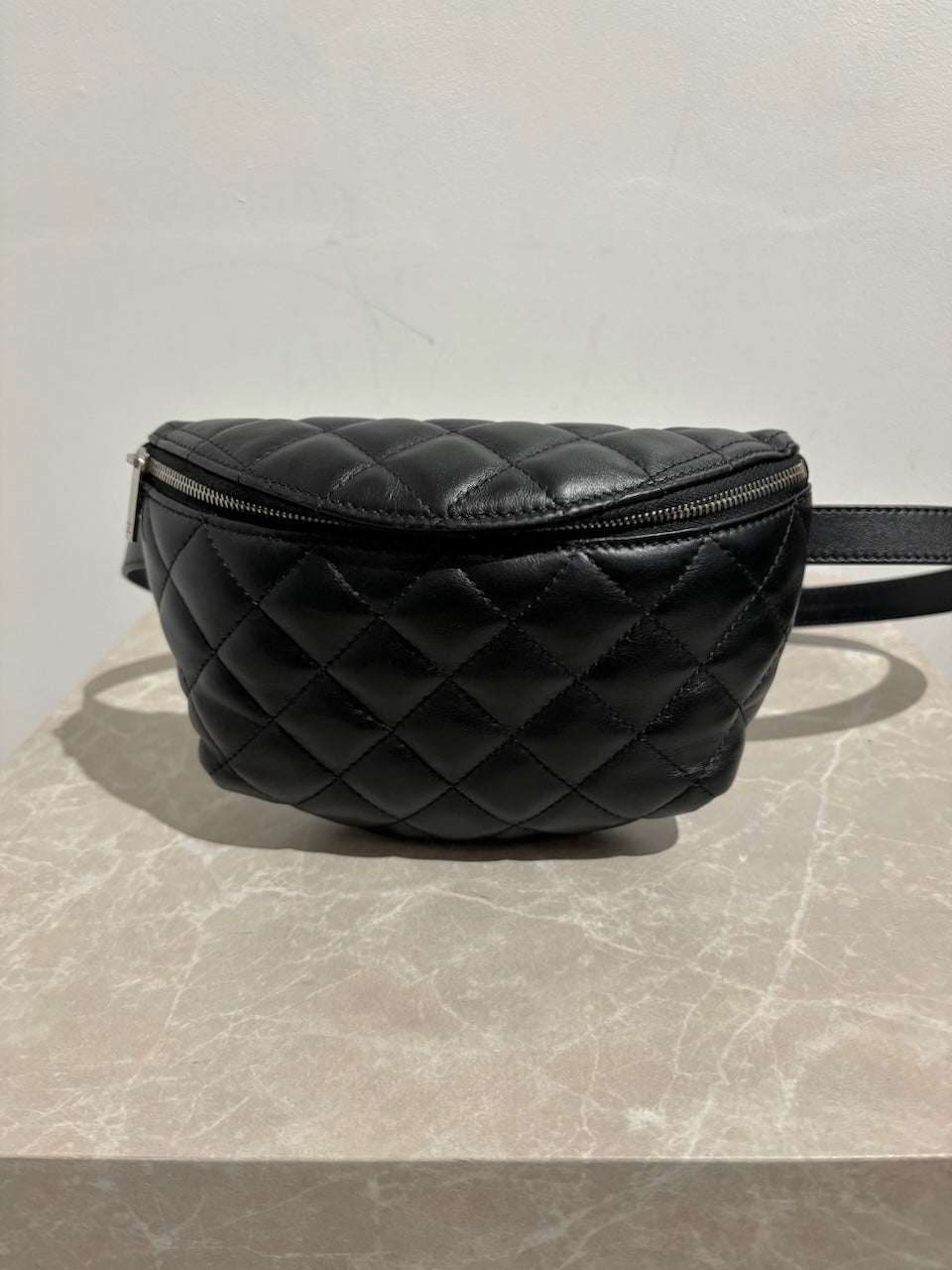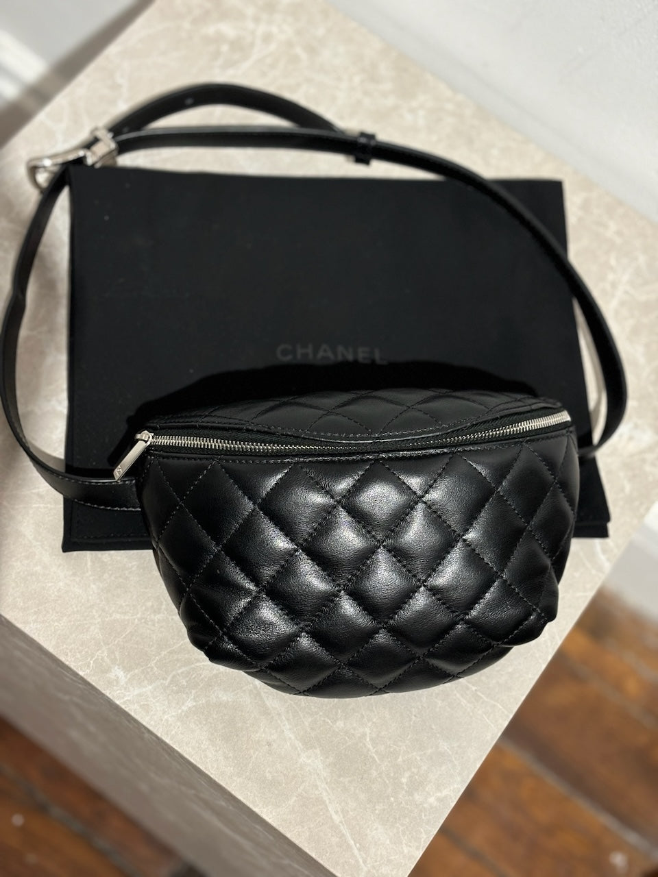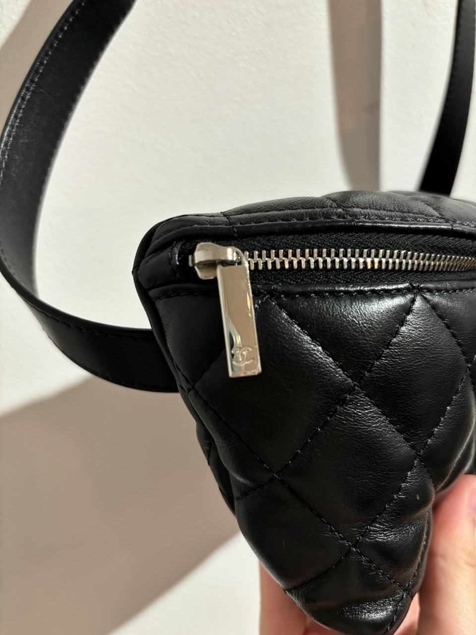 Sac ceinture en cuir matelassé noir avec fermeture zippée, tirette signée CC et Chanel. Ceinture ajustable pour un porté à la taille ou en crossbody.