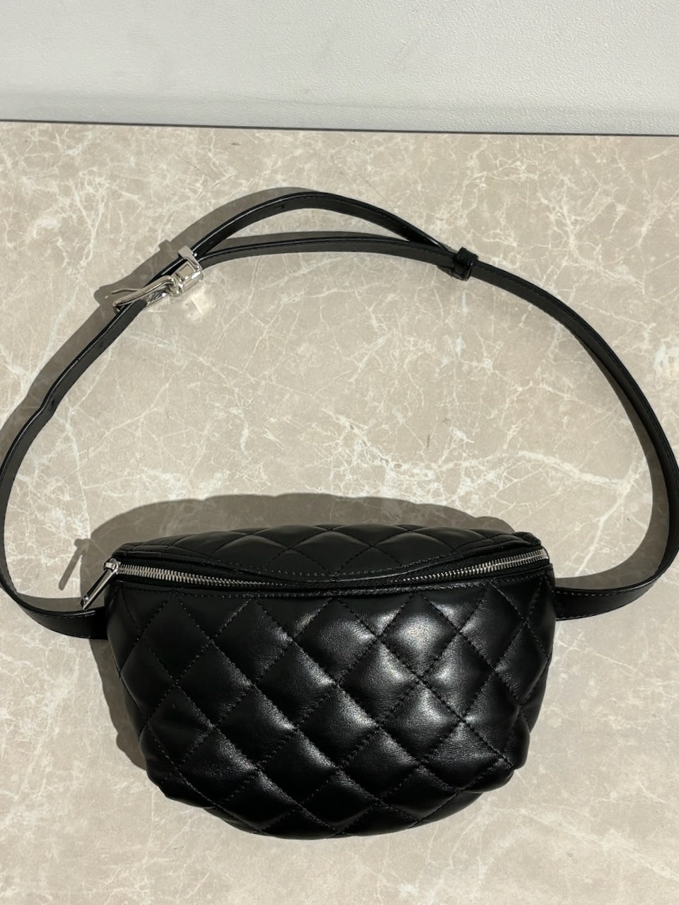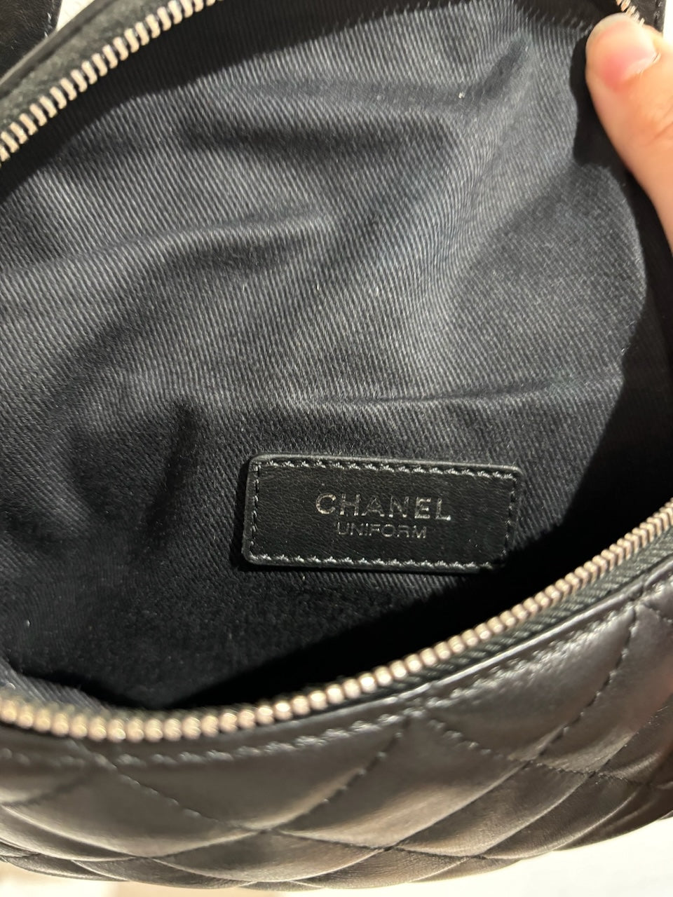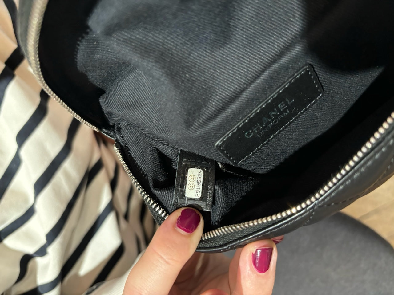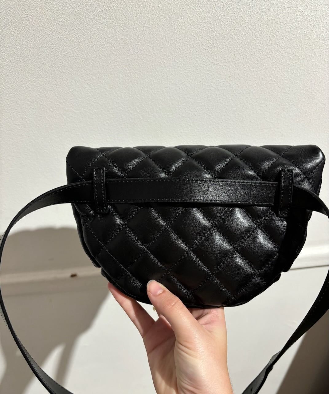 Sac ceinture en cuir matelassé noir avec fermeture zippée, tirette signée CC et Chanel. Ceinture ajustable pour un porté à la taille ou en crossbody.