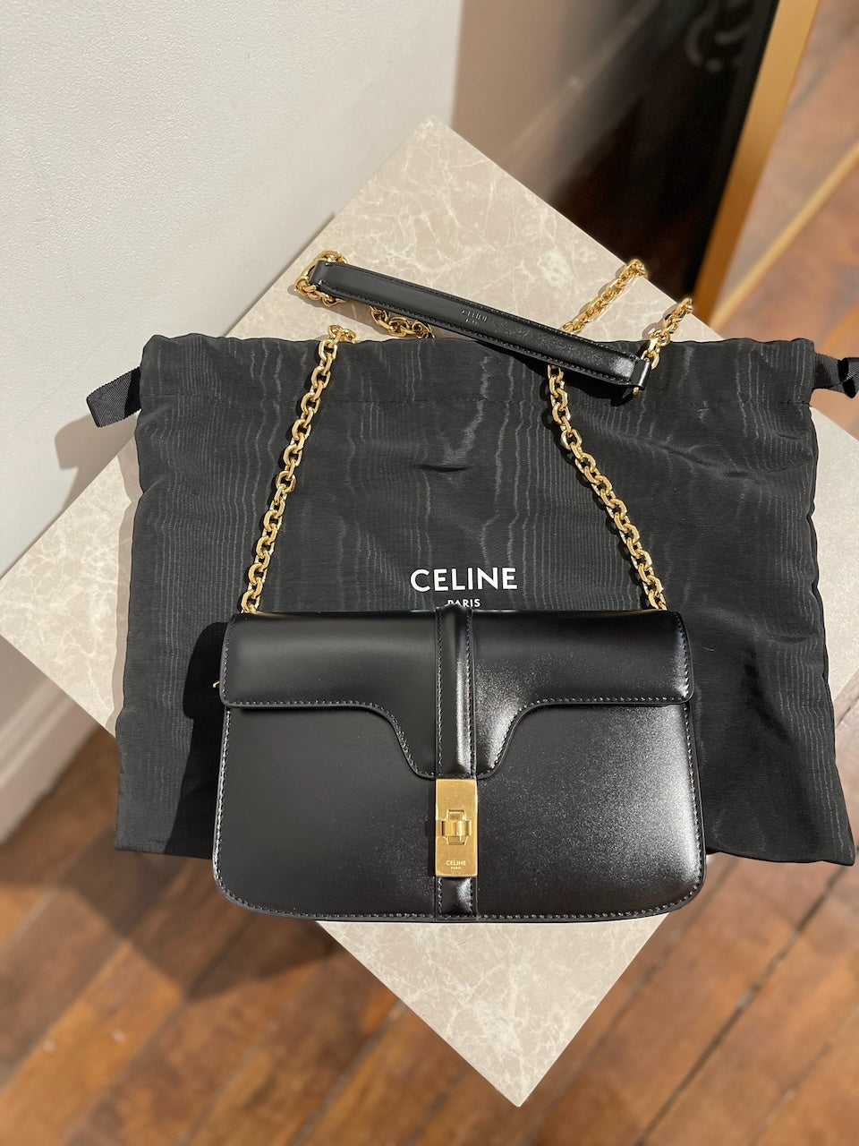 Sac en cuir noir avec fermeture à rabat locket signé Celine et bandoulière chaine et cuir pour un porté épaule ou crossbody. Deux compartiments intérieurs et une poche centrale zippée.