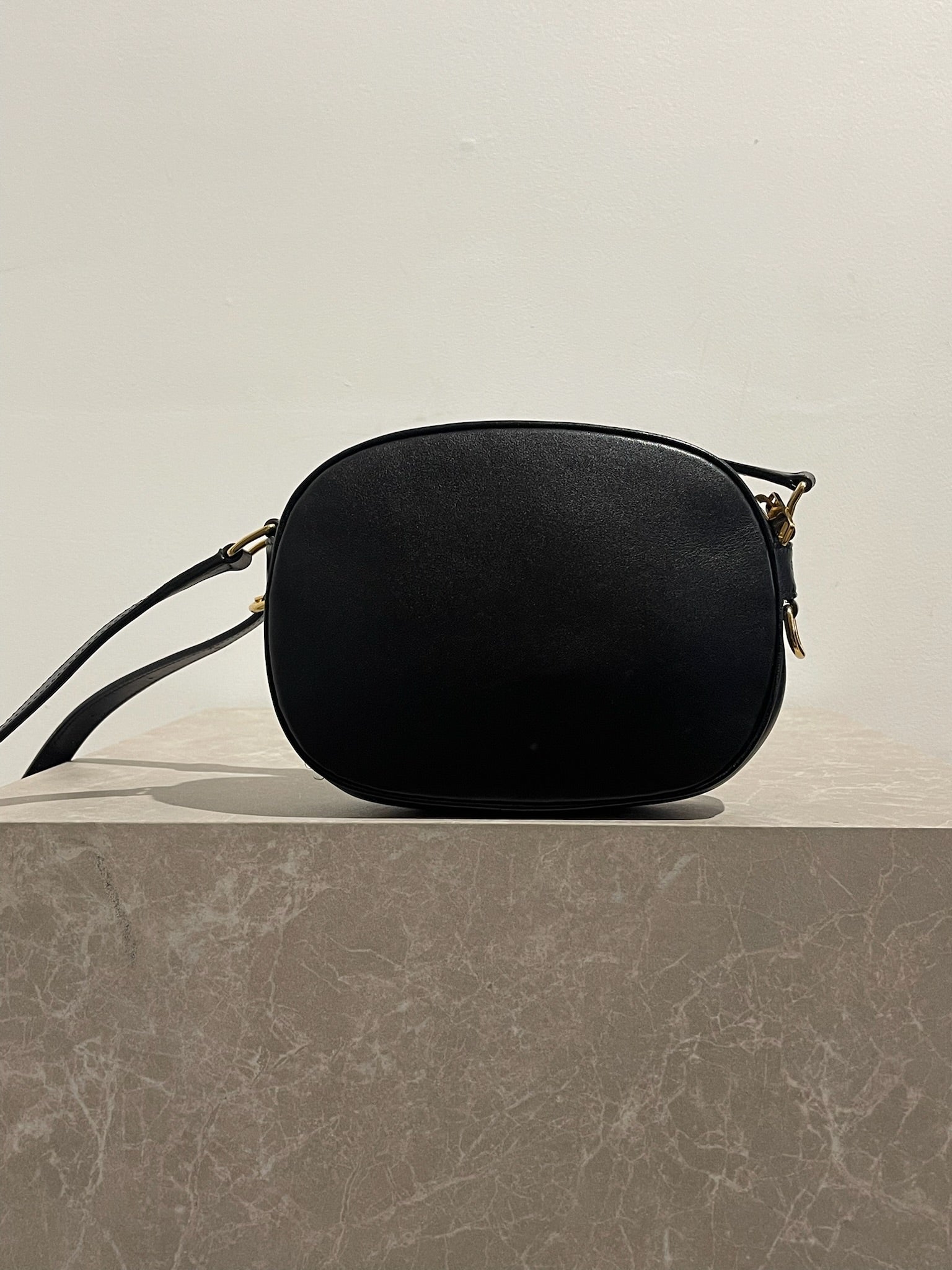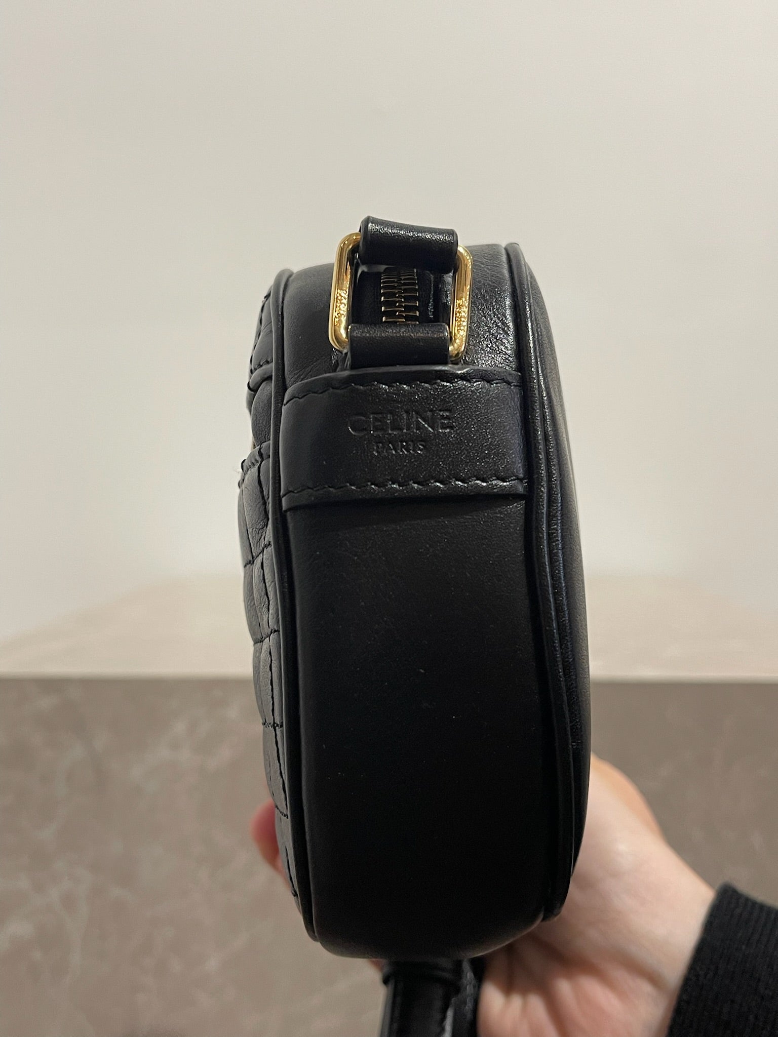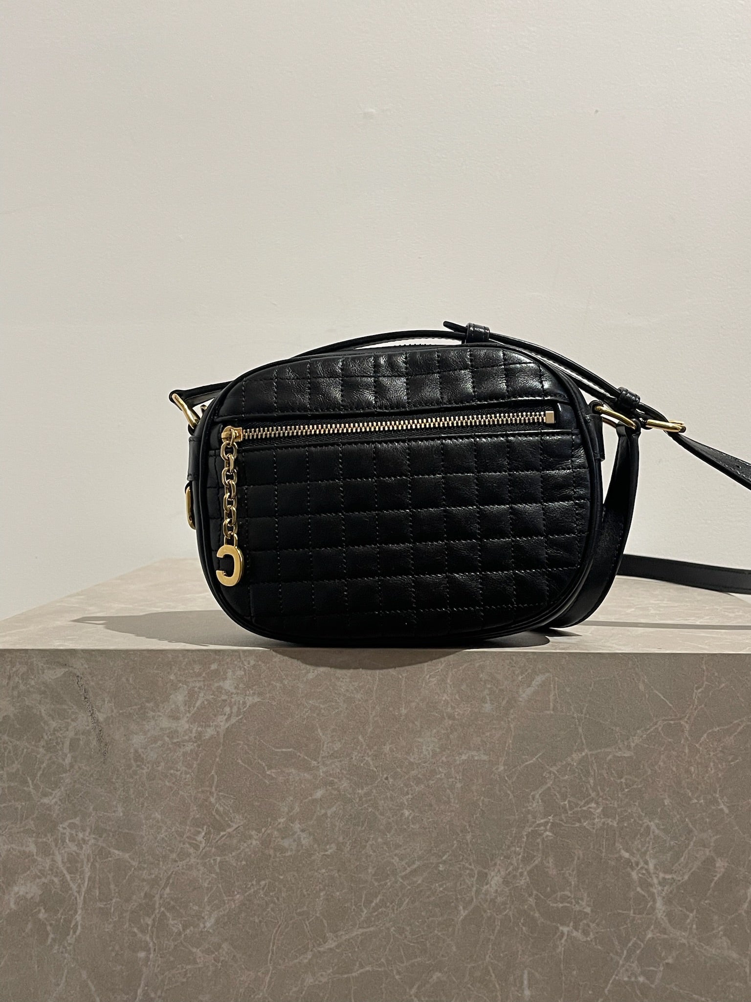 Sac en cuir matelassé noir à l'avant et cuir lisse à l'arrière, avec poche avant orné d'un charm C en métal doré et fermeture zippée. Bandoulière ajustable. Compartiments pour carte à l'intérieur. Bijouterie dorée.
