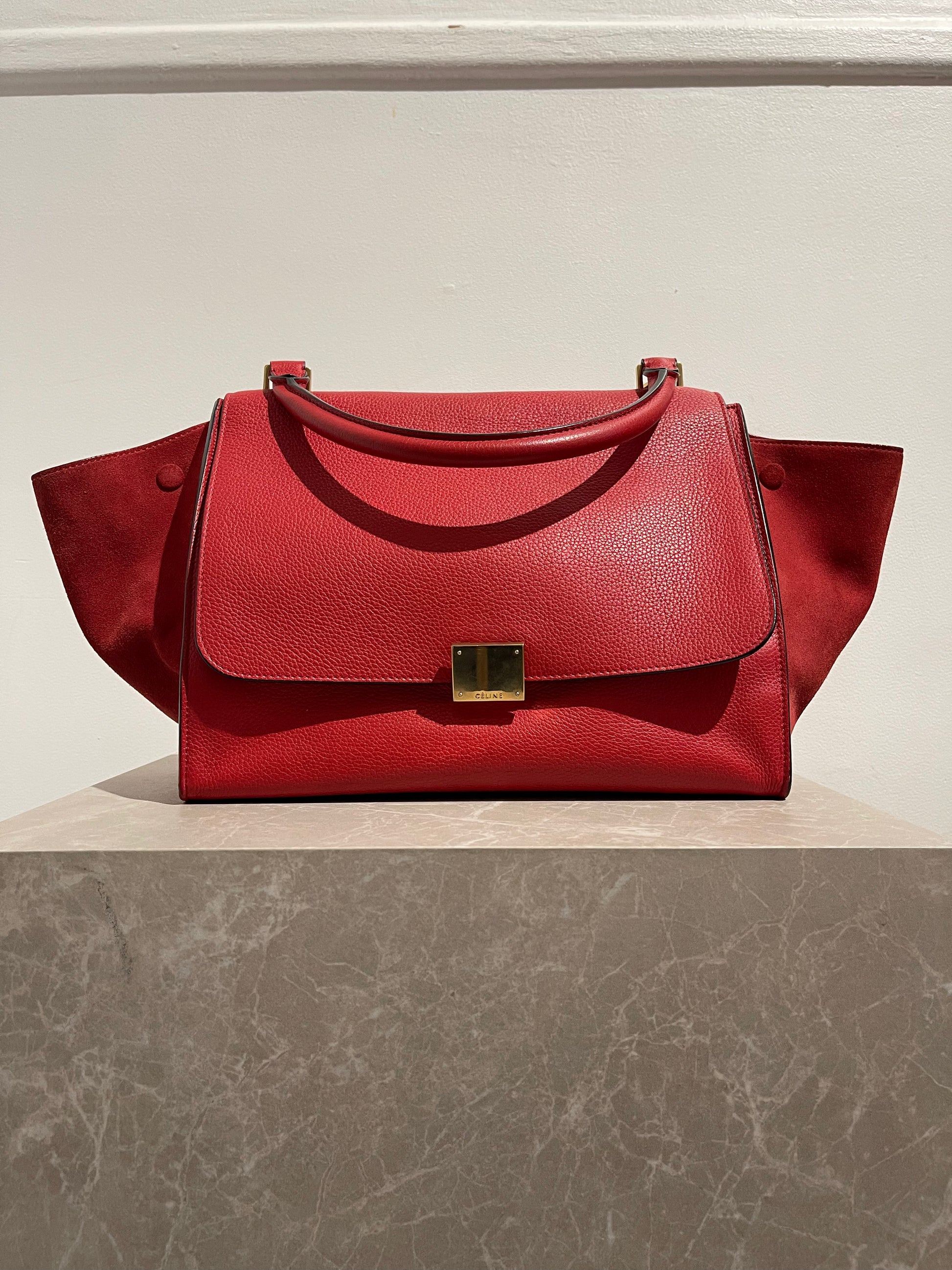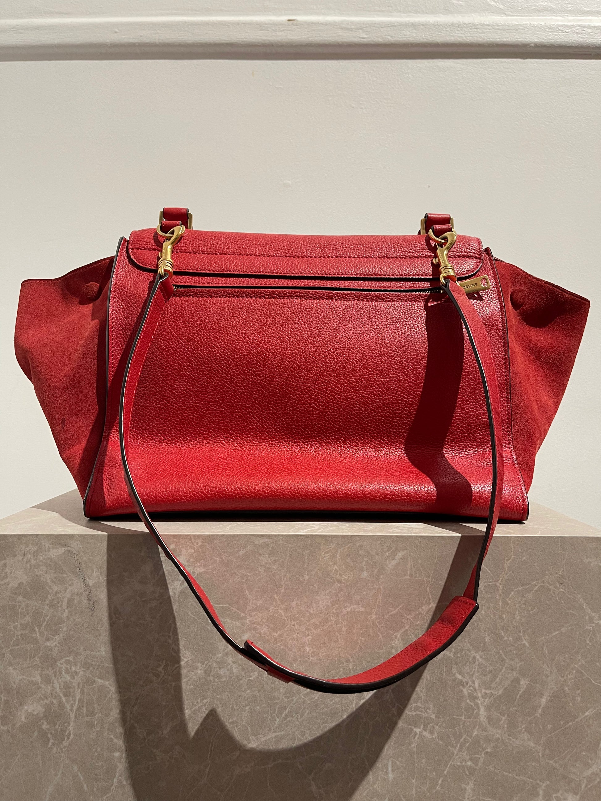 Sac à main en cuir et daim rouge avec fermeture à rabat clip en métal doré signé Celine. Anse sur le dessus pour un porté main et une bandoulière ajustable et amovible pour un porté épaule et crossbody. Grande contenance, poche intérieure.