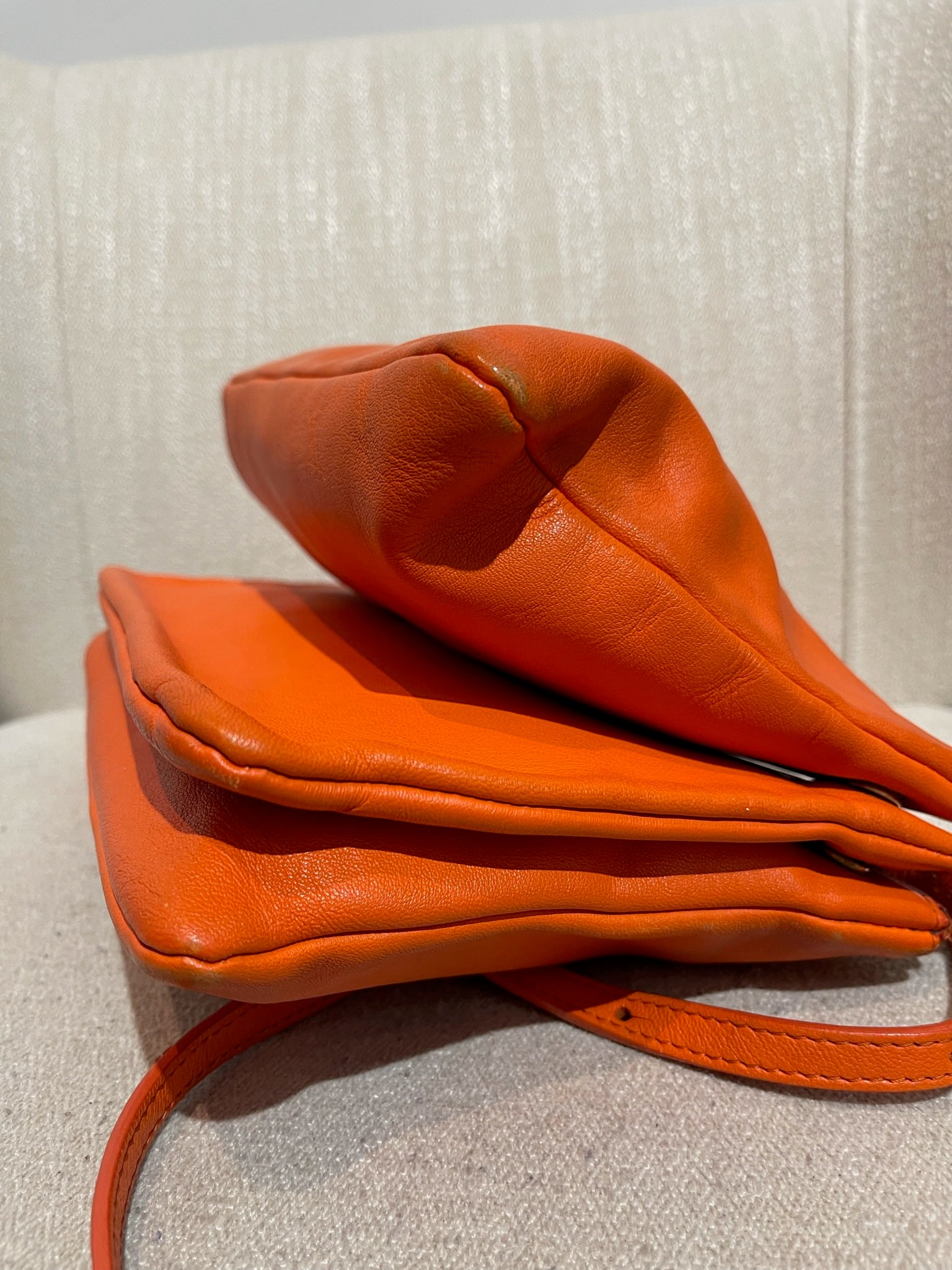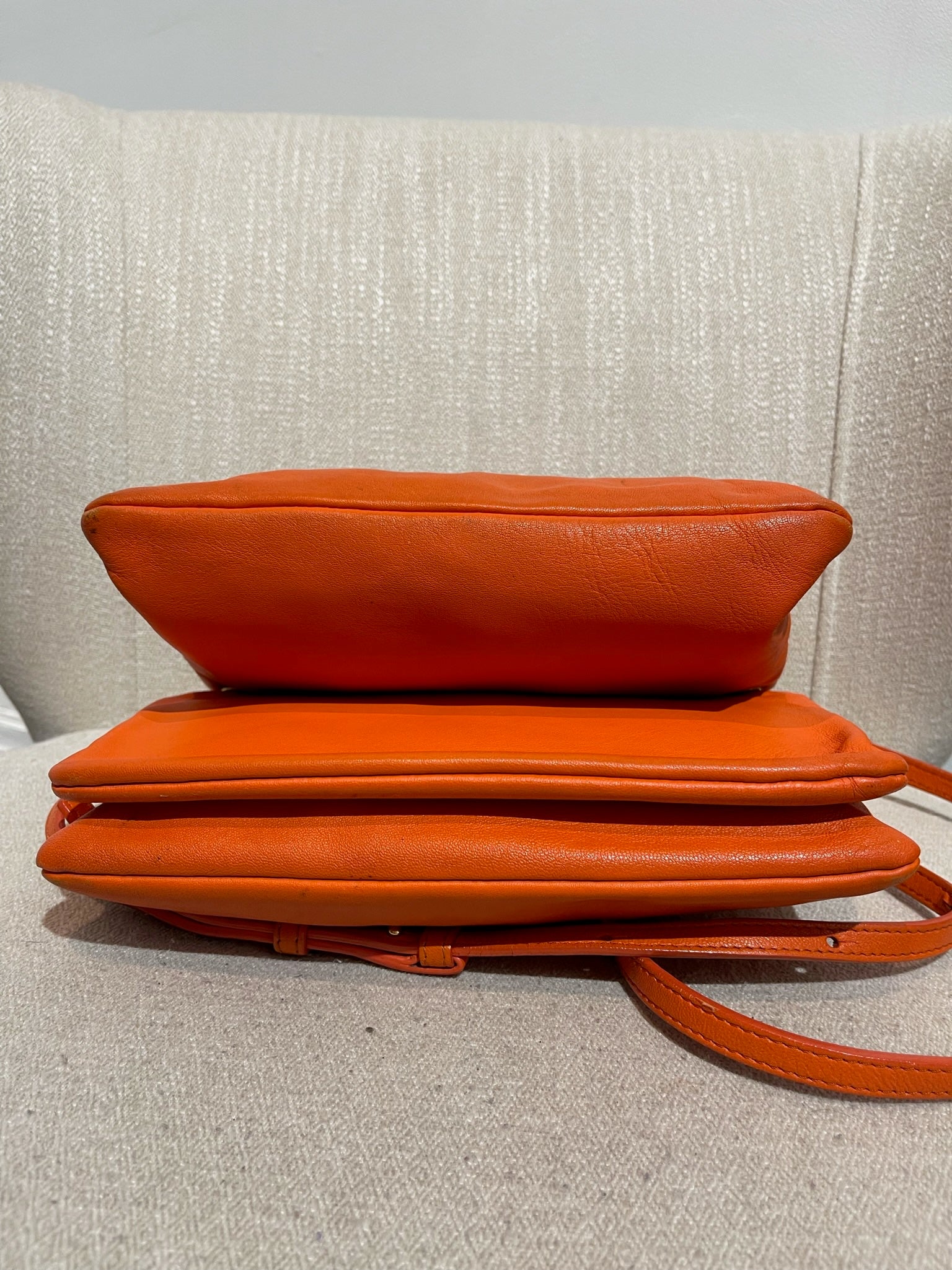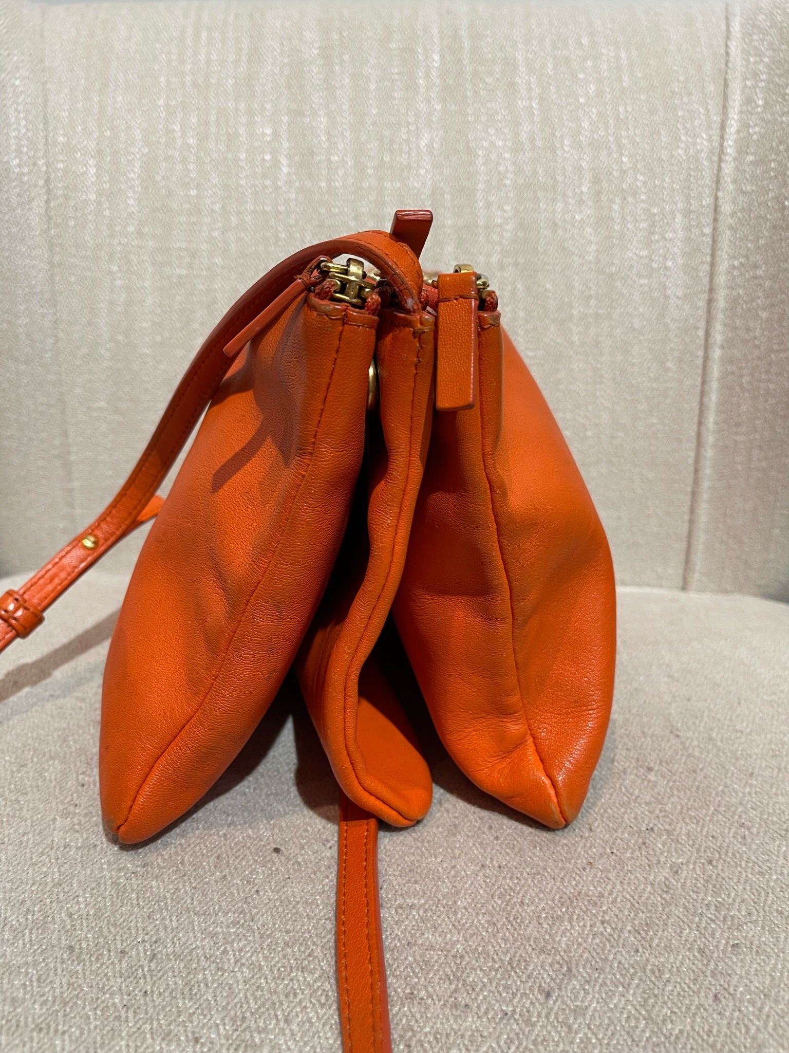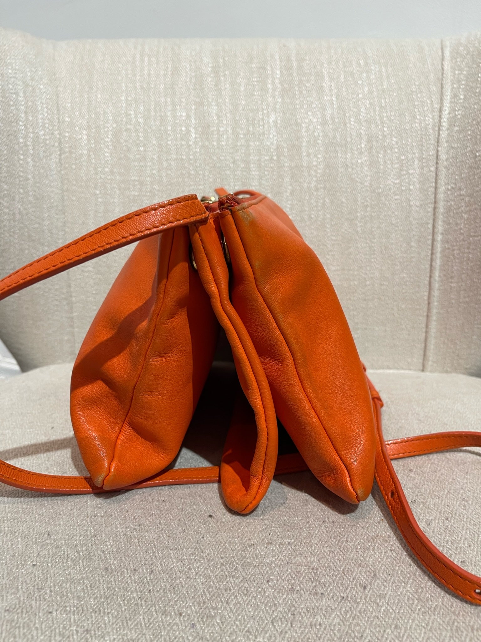 Sac en bandoulière en cuir orange composé de 3 pochettes détachable par des boutons pression. Fermeture zip. Bandoulière ajustable. Bijouterie dorée.