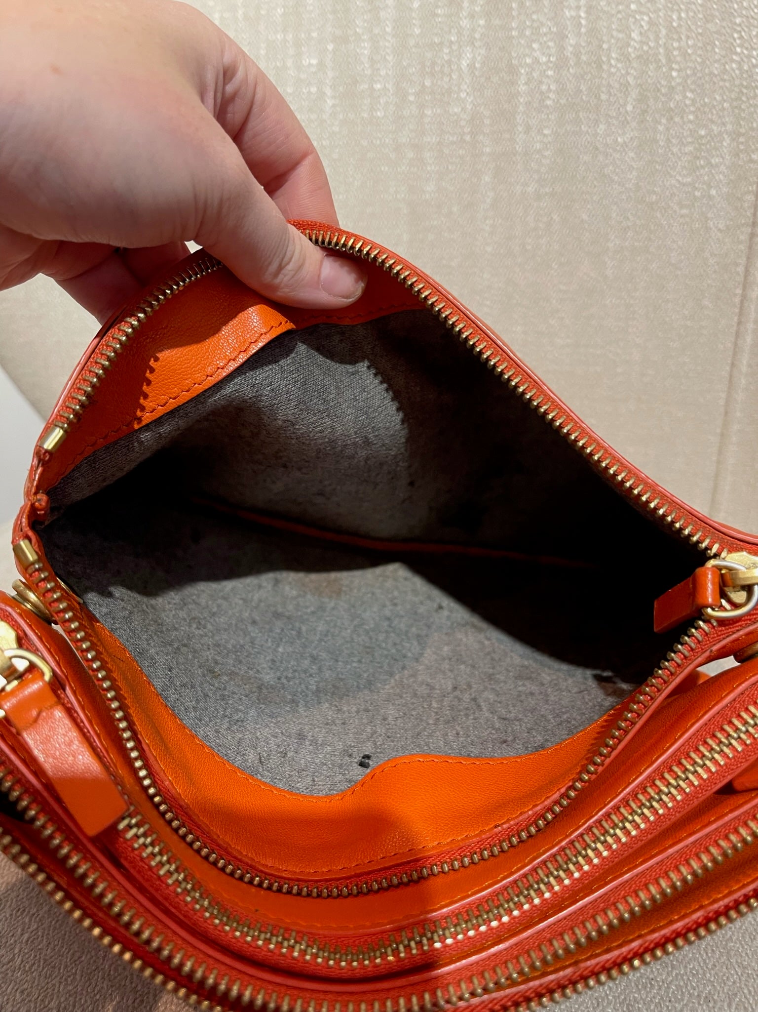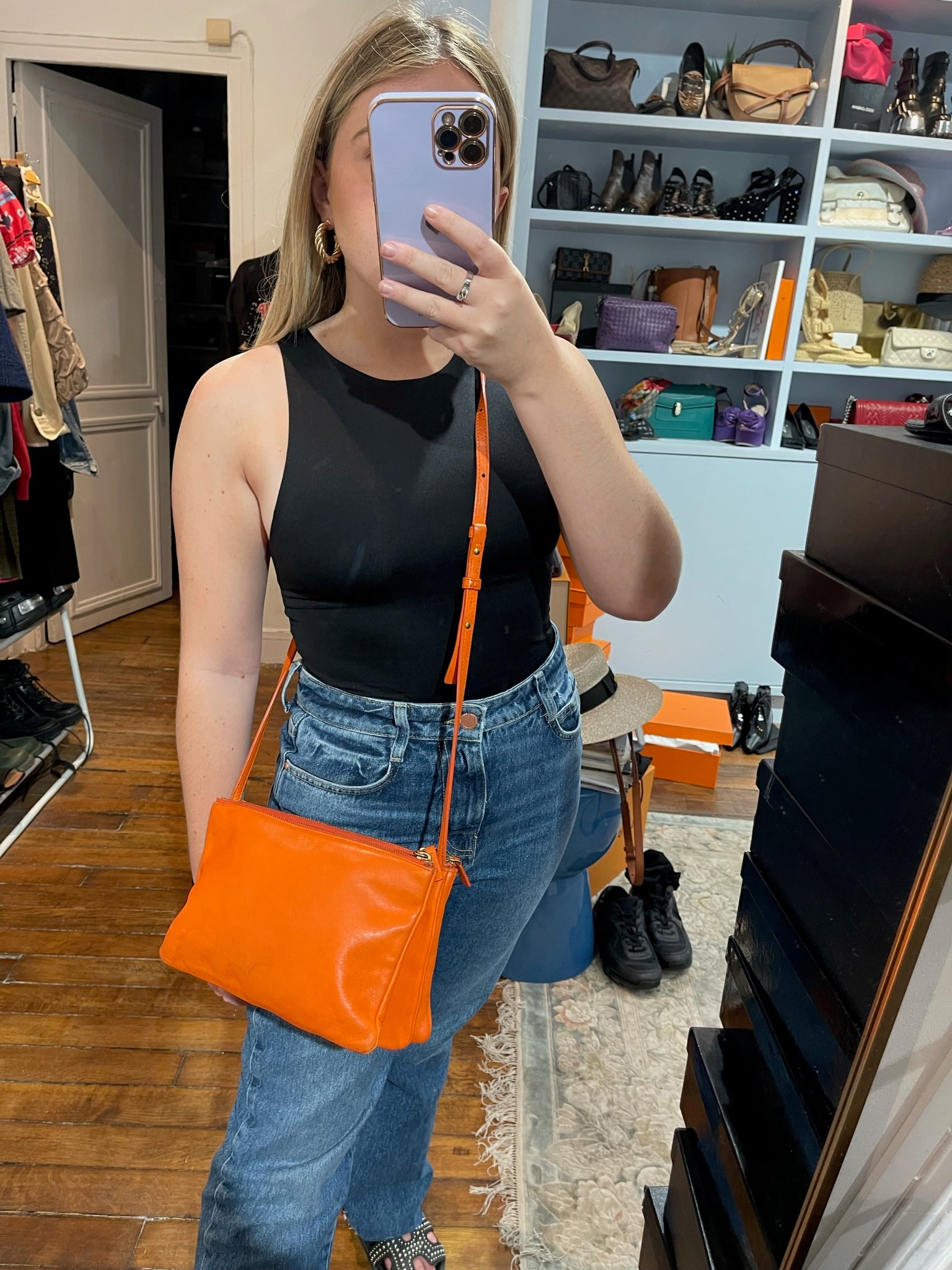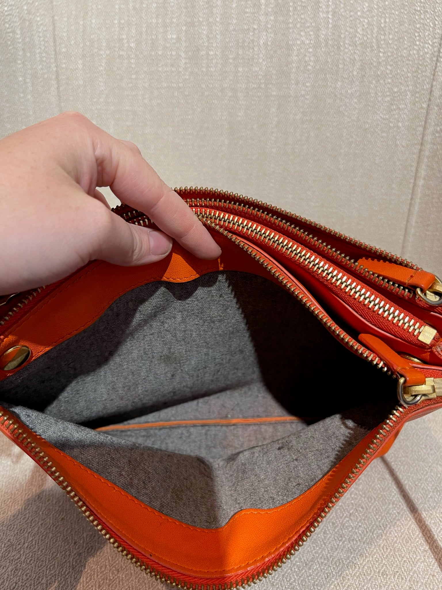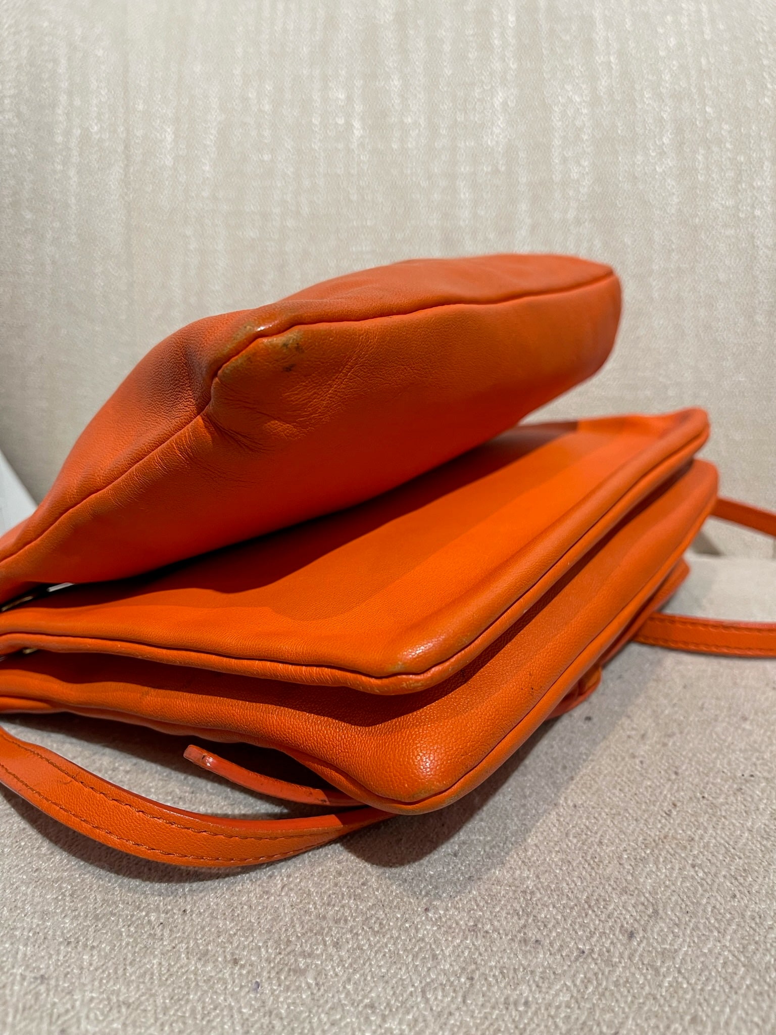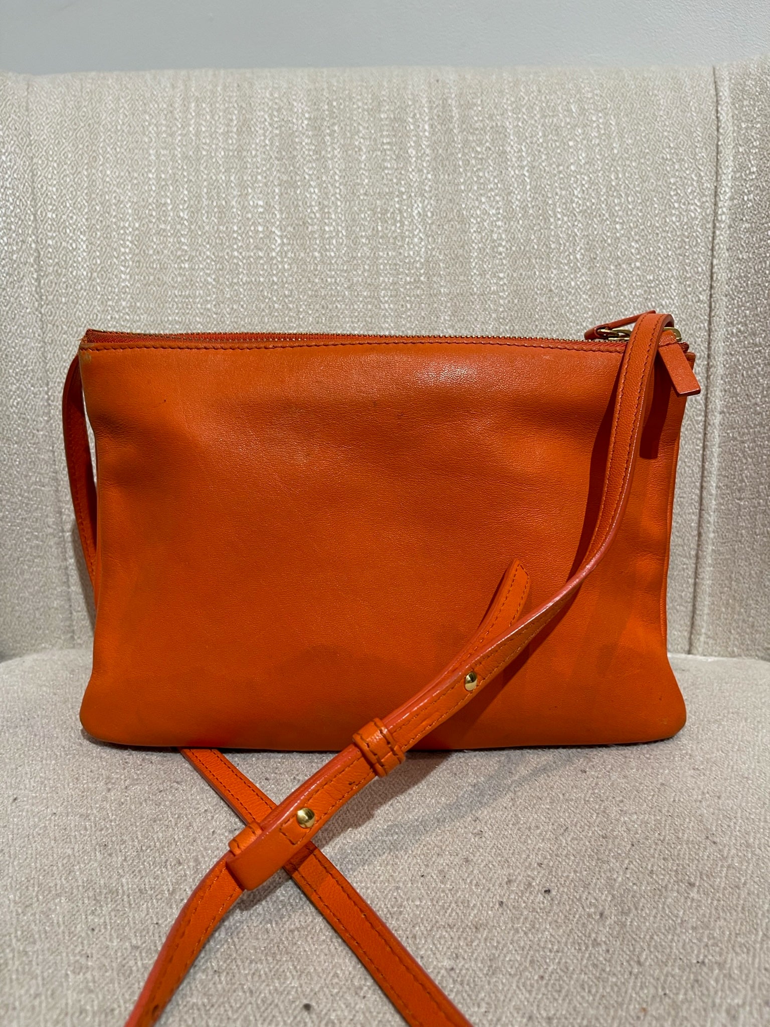 Sac en bandoulière en cuir orange composé de 3 pochettes détachable par des boutons pression. Fermeture zip. Bandoulière ajustable. Bijouterie dorée.