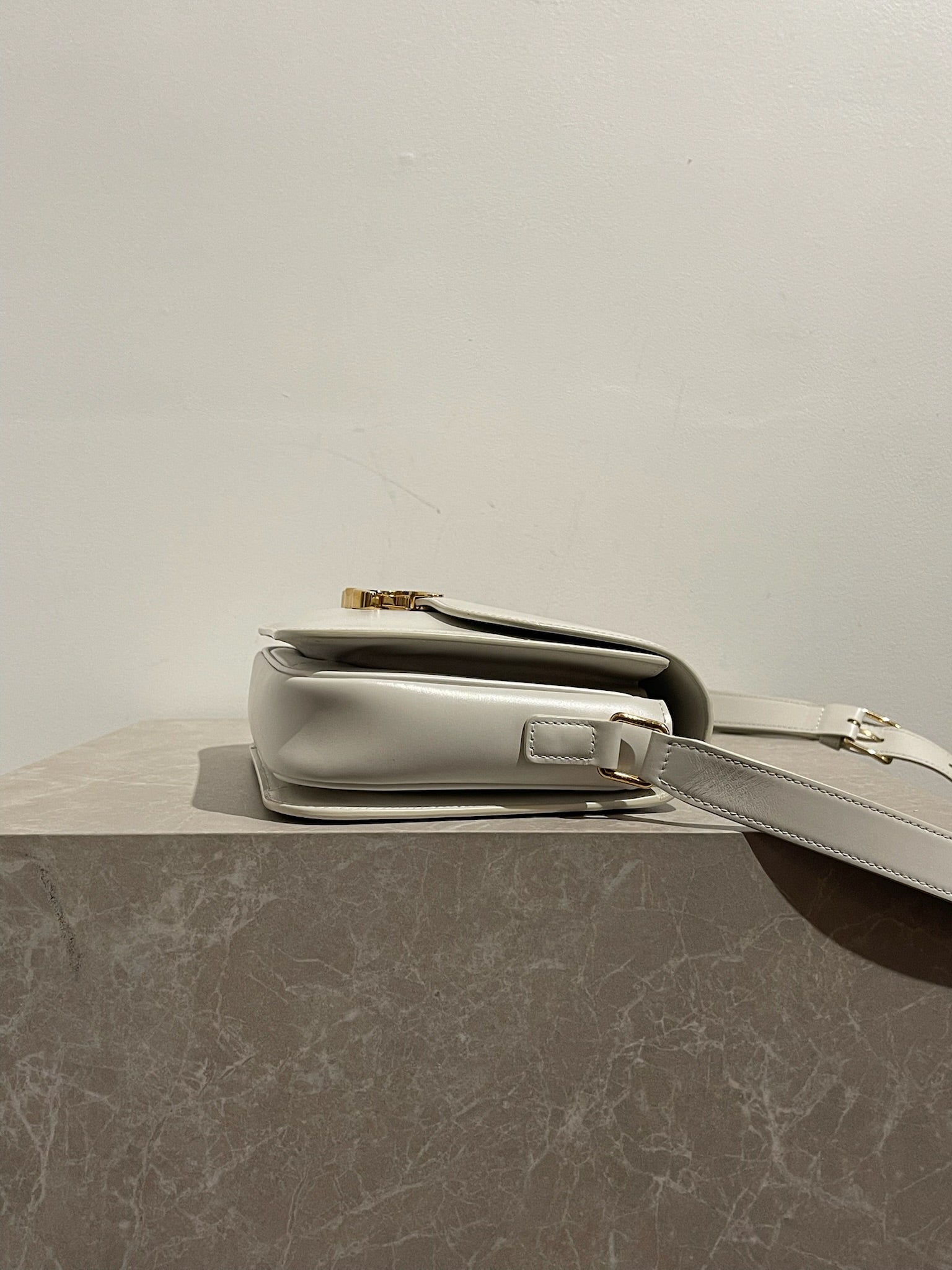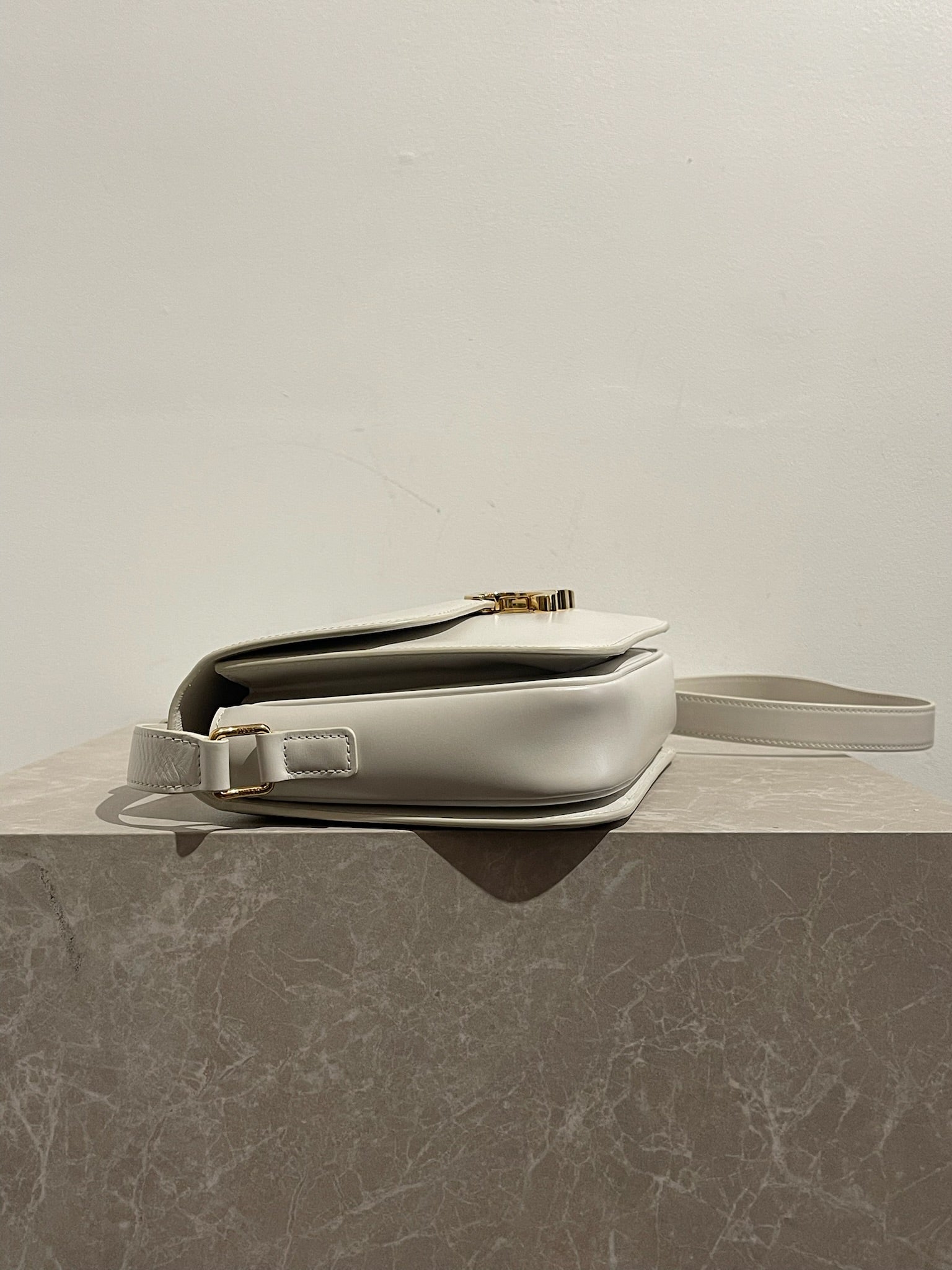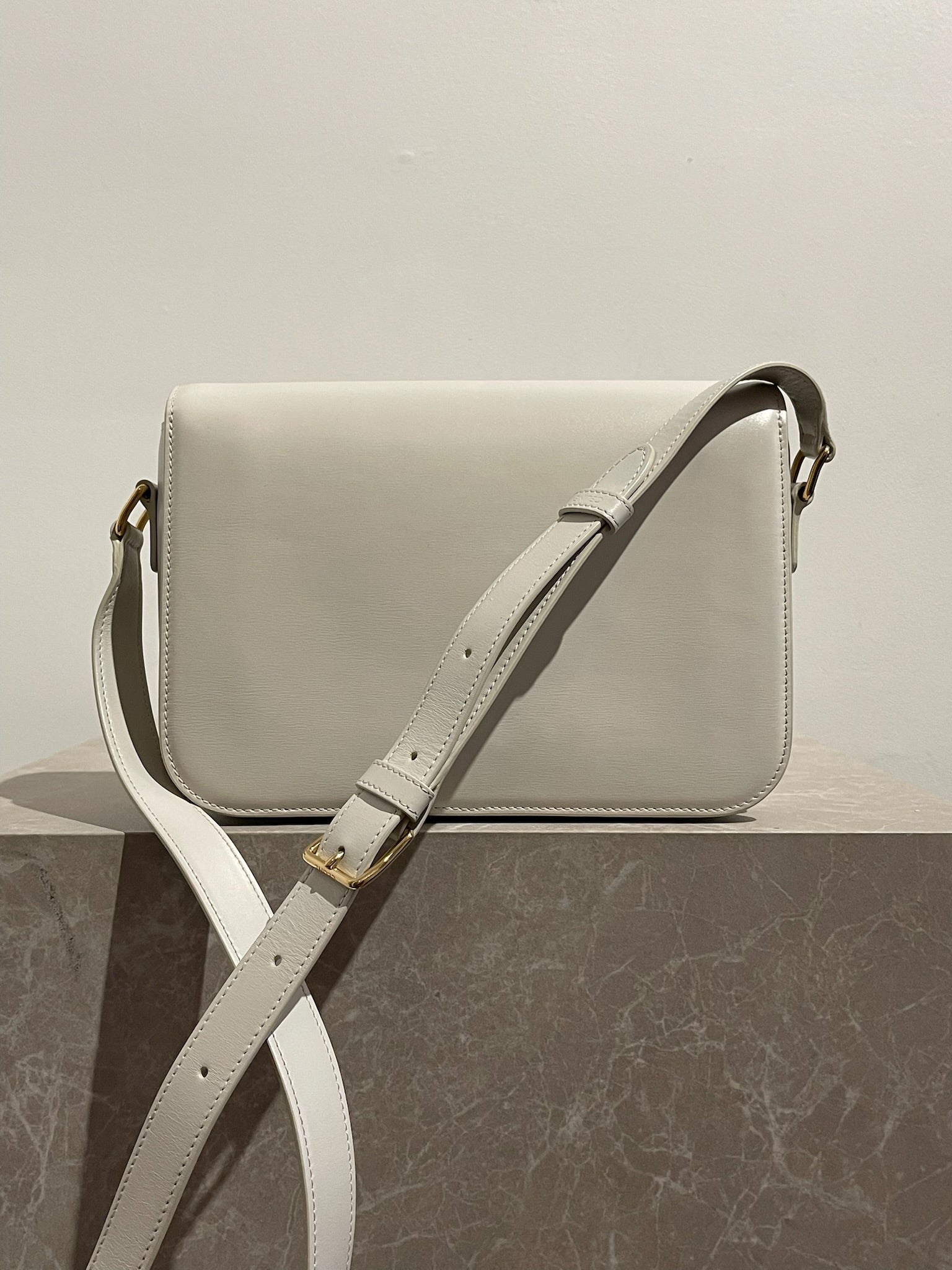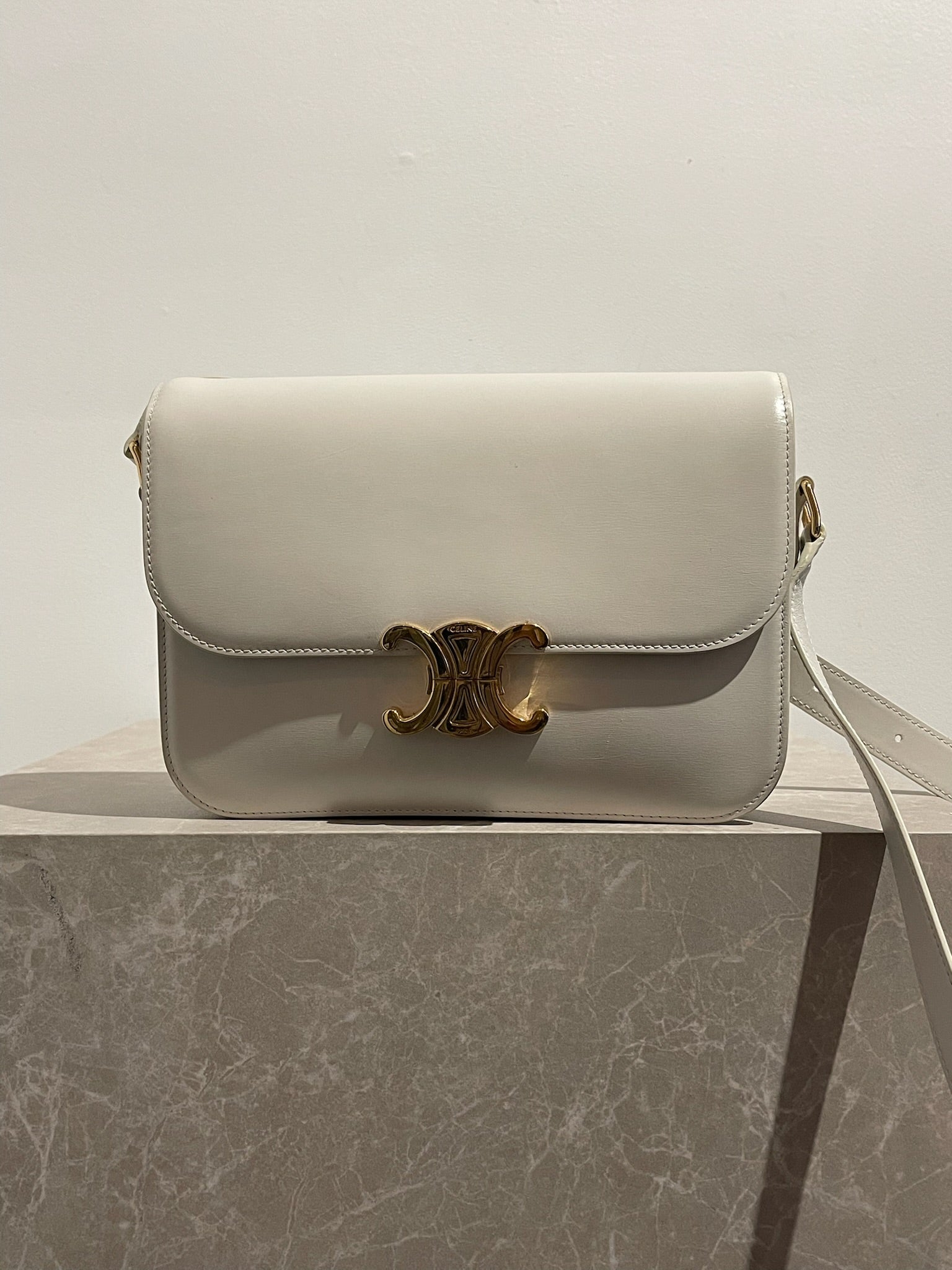 Sac en cuir blanc avec fermeture à rabat orné d'une boucle en métal doré du logo Triomphe. Bandoulière ajustable, compartiments intérieurs et poche intérieur zippée.