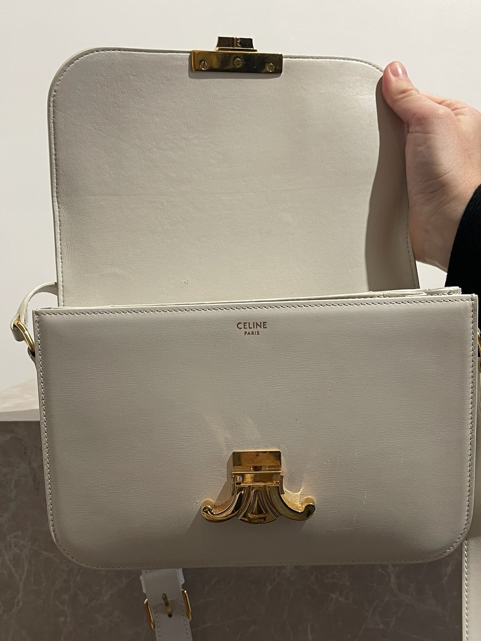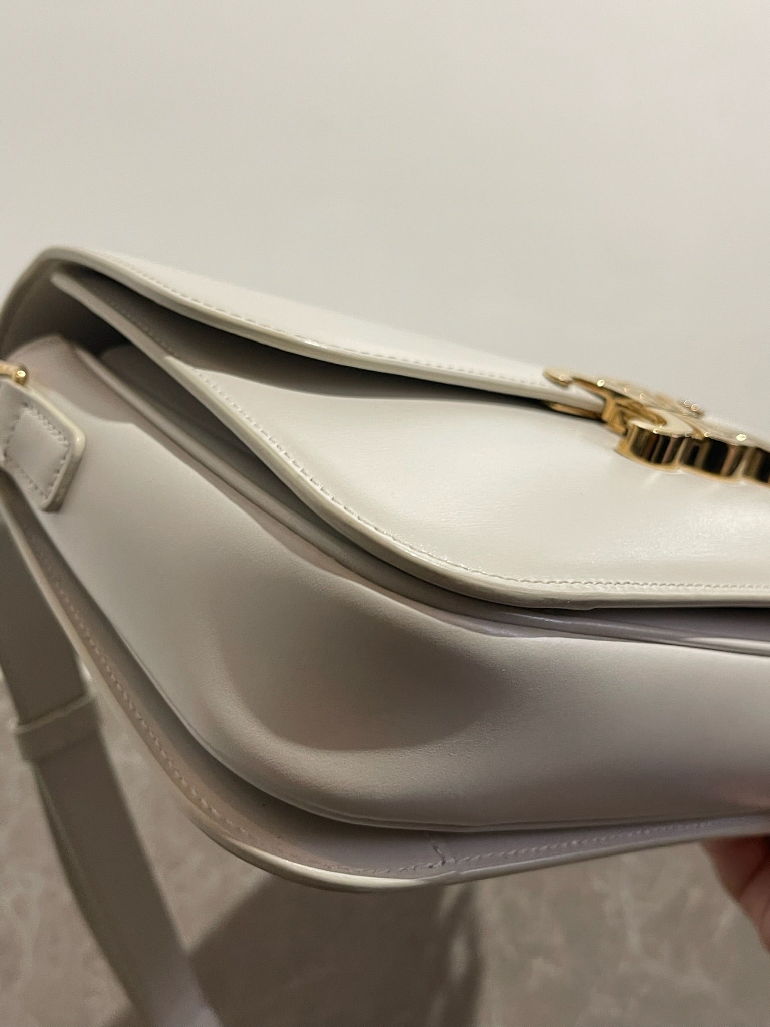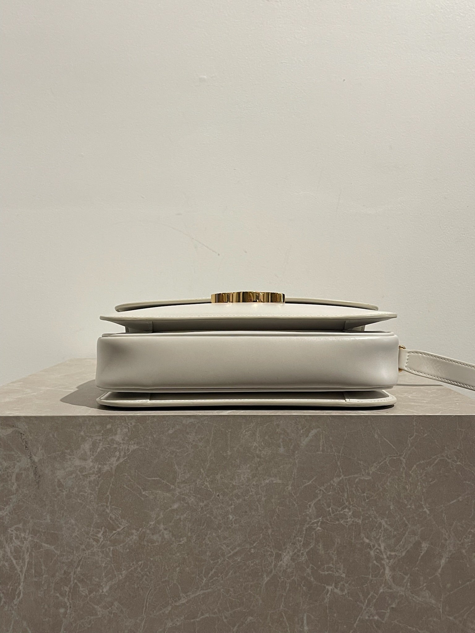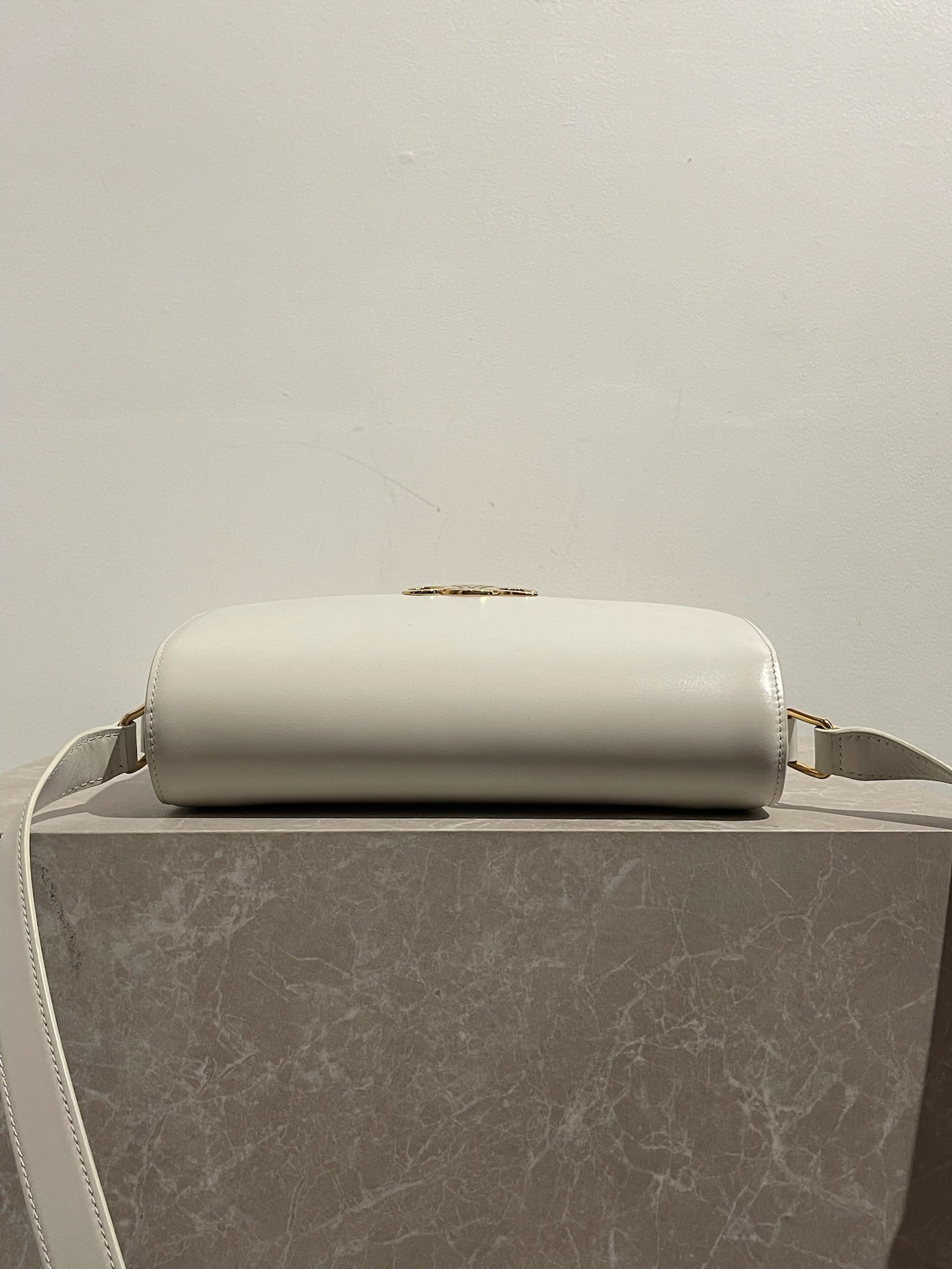 Sac en cuir blanc avec fermeture à rabat orné d'une boucle en métal doré du logo Triomphe. Bandoulière ajustable, compartiments intérieurs et poche intérieur zippée.