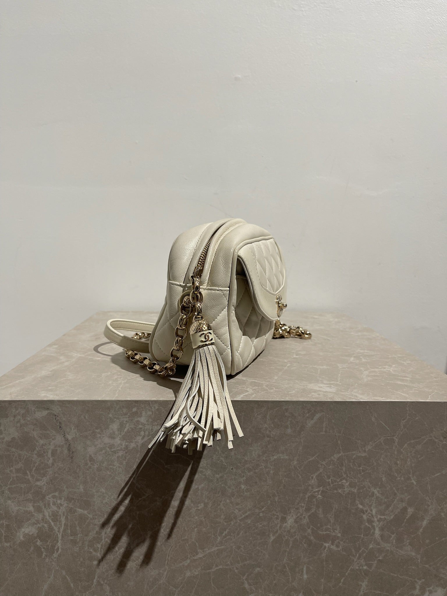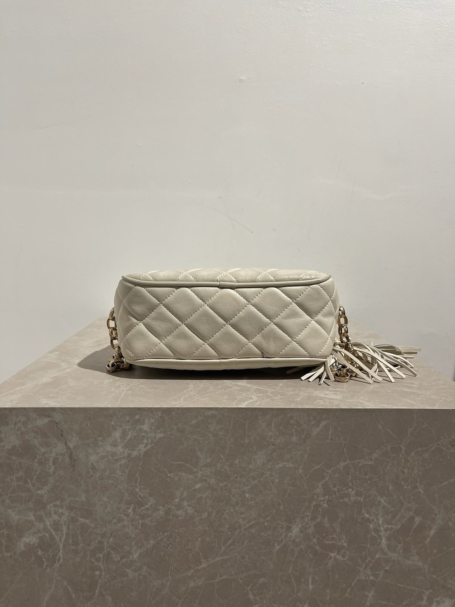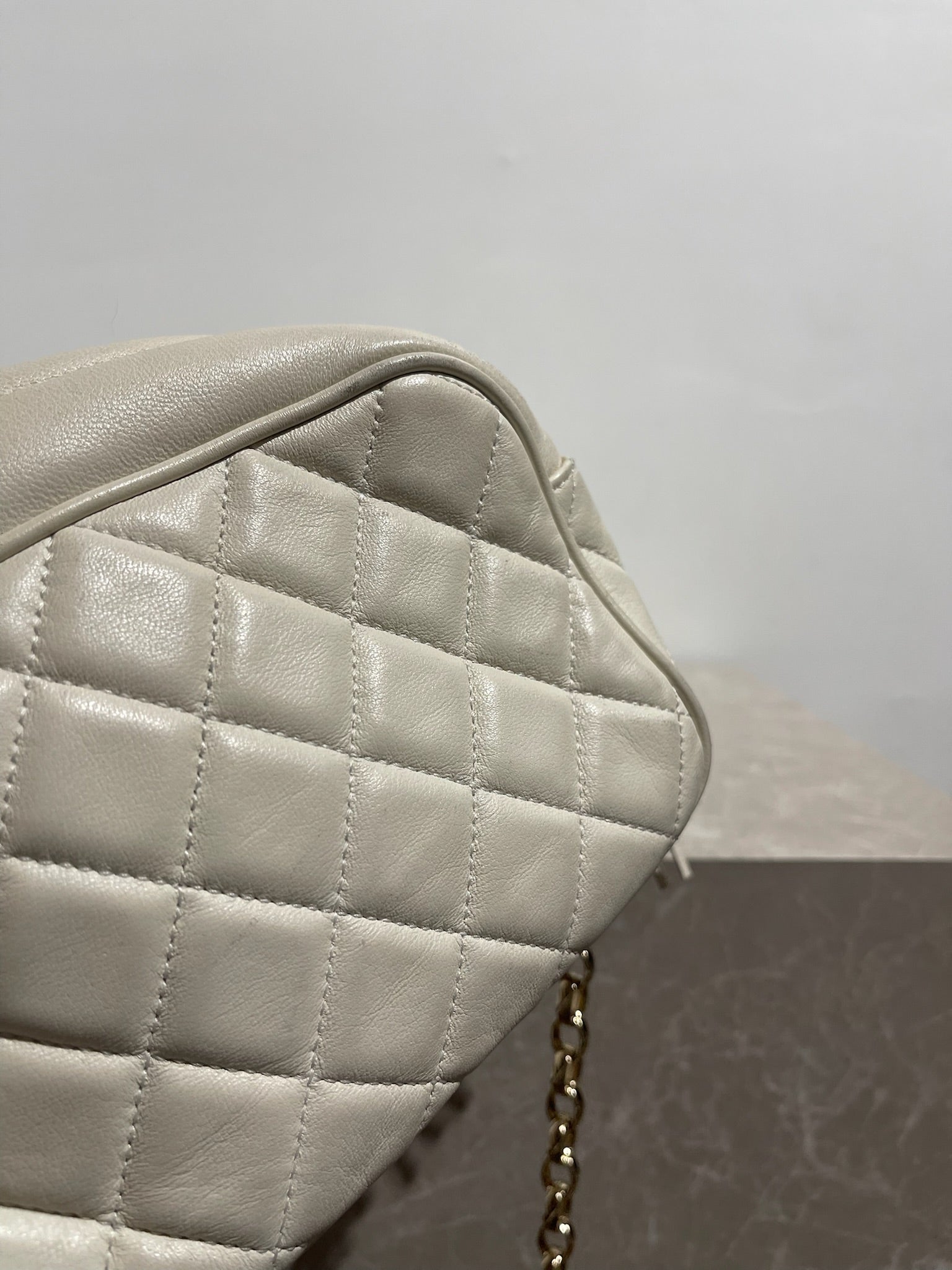 Sac en cuir matelassé écru avec fermeture zippée et poche à rabat avant ornée d'un fermoir CC en métal doré. Bandoulière en chaine et cuir pour un porté à l'épaule ou croisé. Charm pompon signé Chanel sur fermeture. Poche intérieure à zip et poche plate.