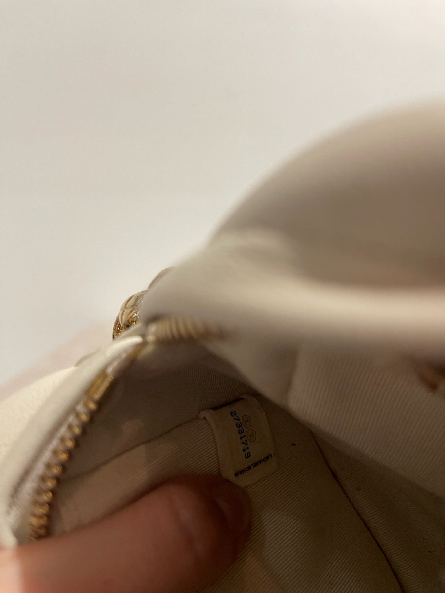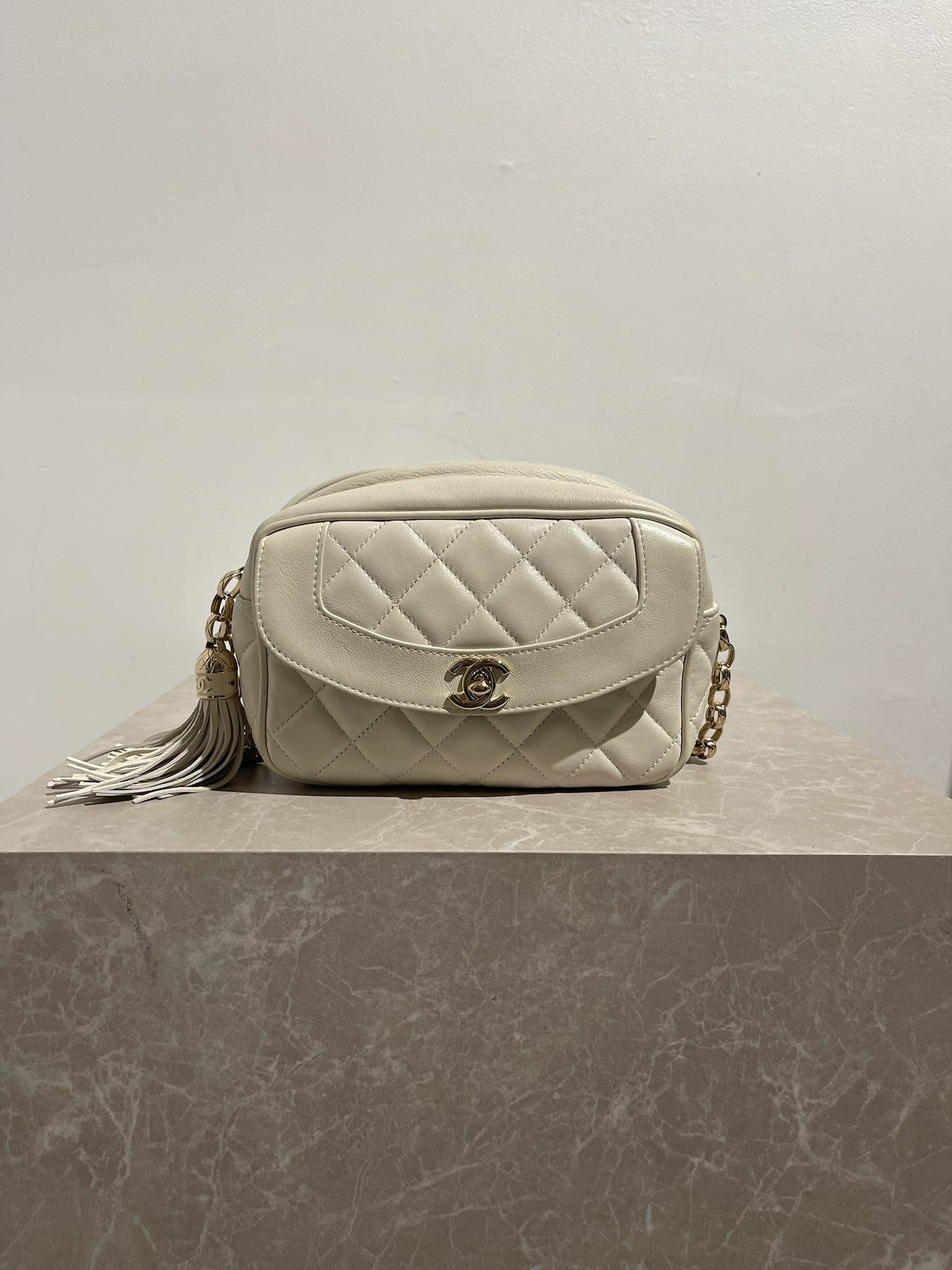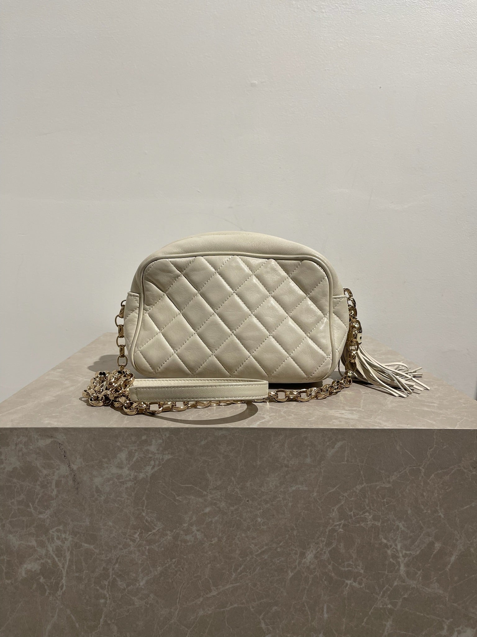Sac en cuir matelassé écru avec fermeture zippée et poche à rabat avant ornée d'un fermoir CC en métal doré. Bandoulière en chaine et cuir pour un porté à l'épaule ou croisé. Charm pompon signé Chanel sur fermeture. Poche intérieure à zip et poche plate.