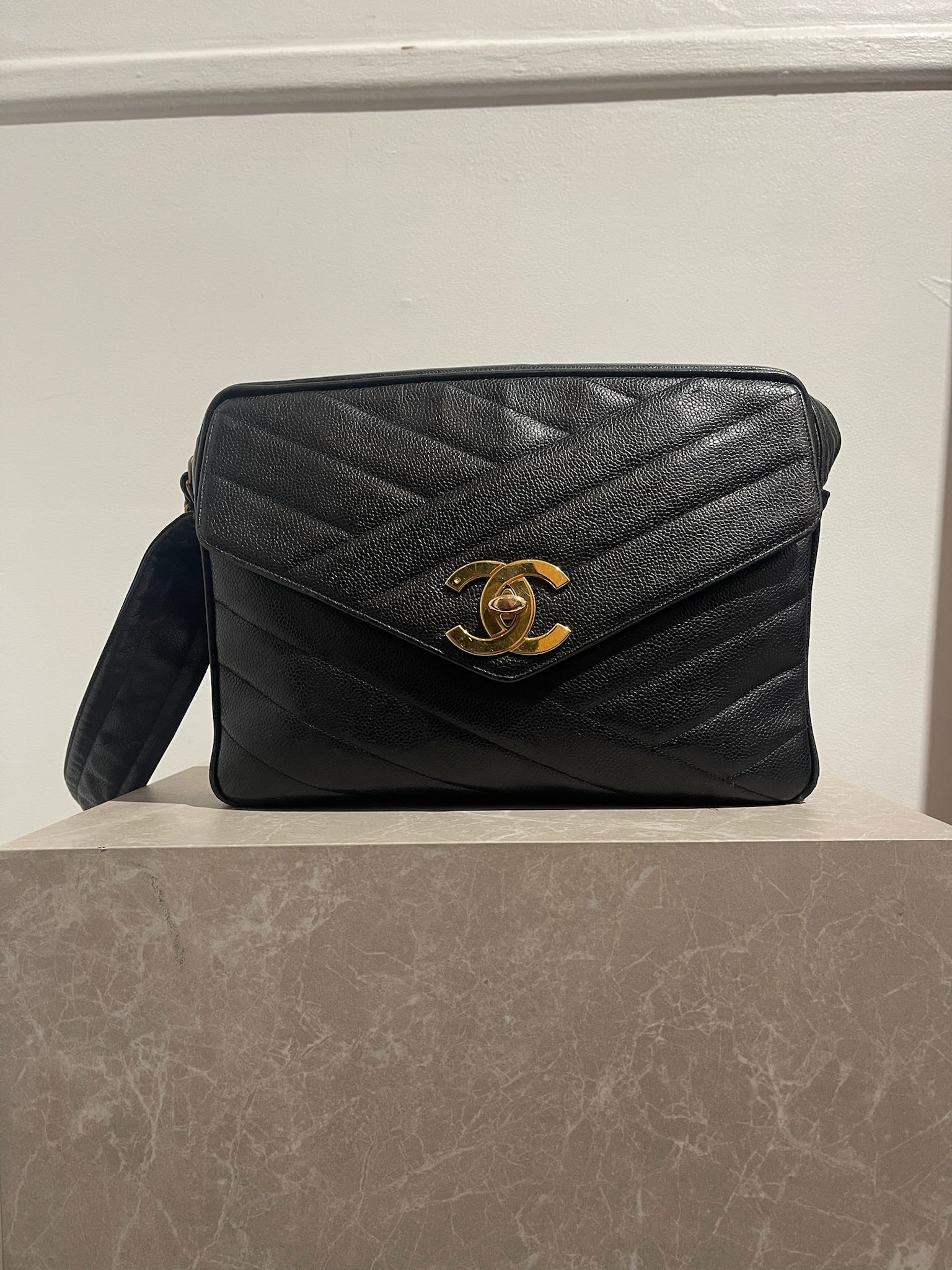 Sac à bandoulière en cuir caviar chevron noir avec poche avant à rabat ornée du fermoir CC en métal doré. Fermeture zippée avec tirette avec pompon signé Chanel. Bandoulière épaisse en cuir (5,5 cm de largueur).
