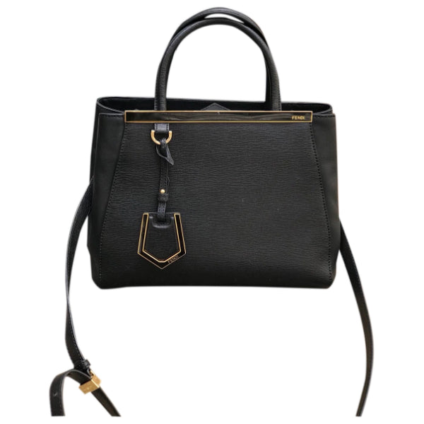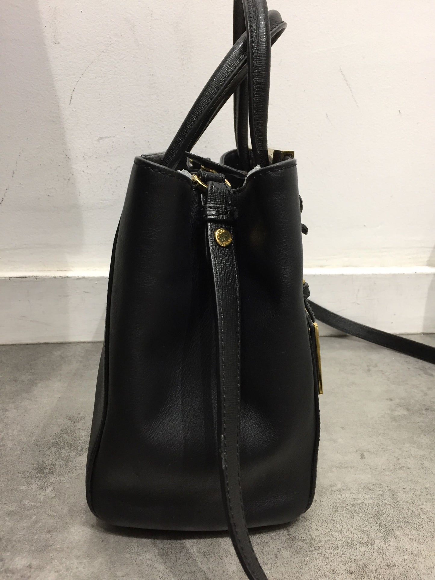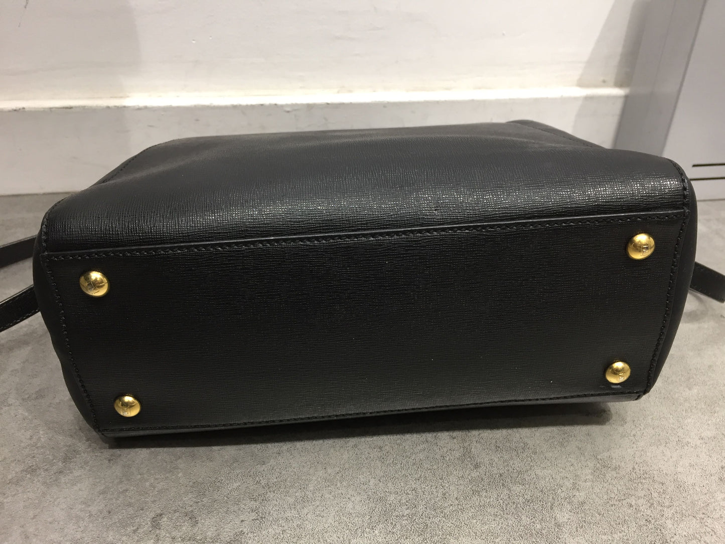 Petit cabas en cuir noir avec fermeture boutonnée et double poignée.