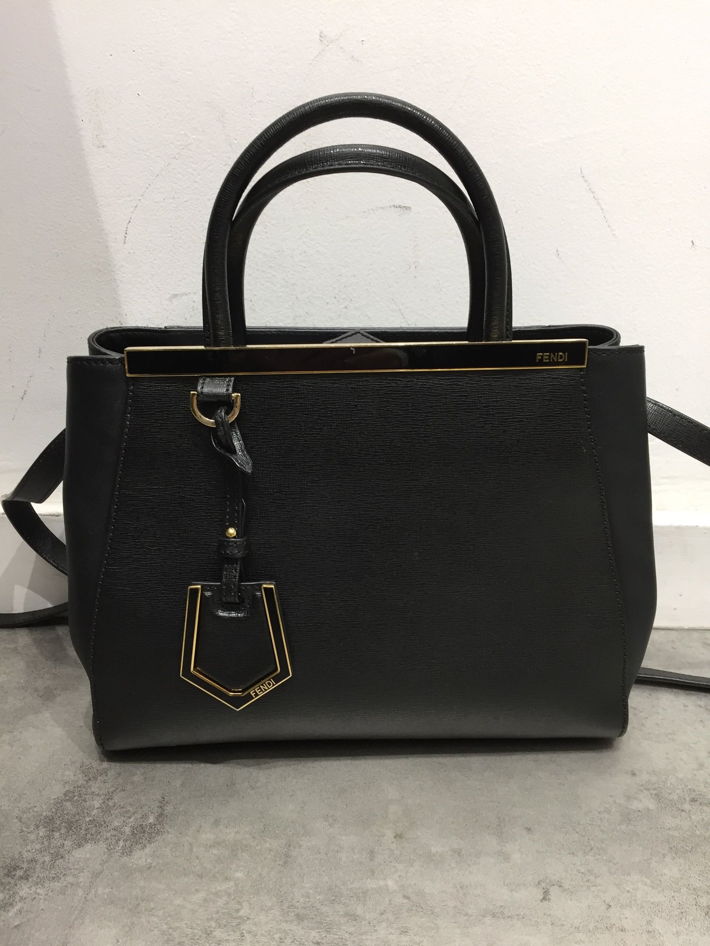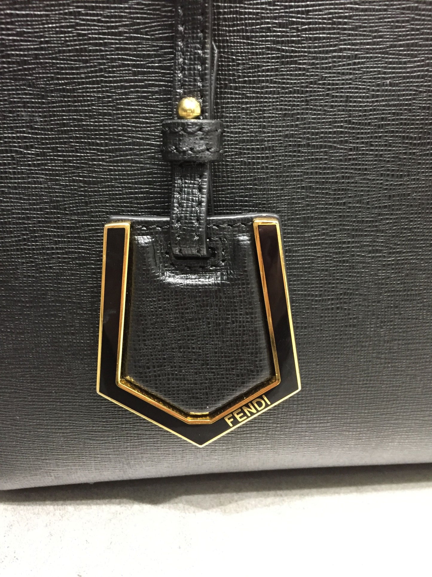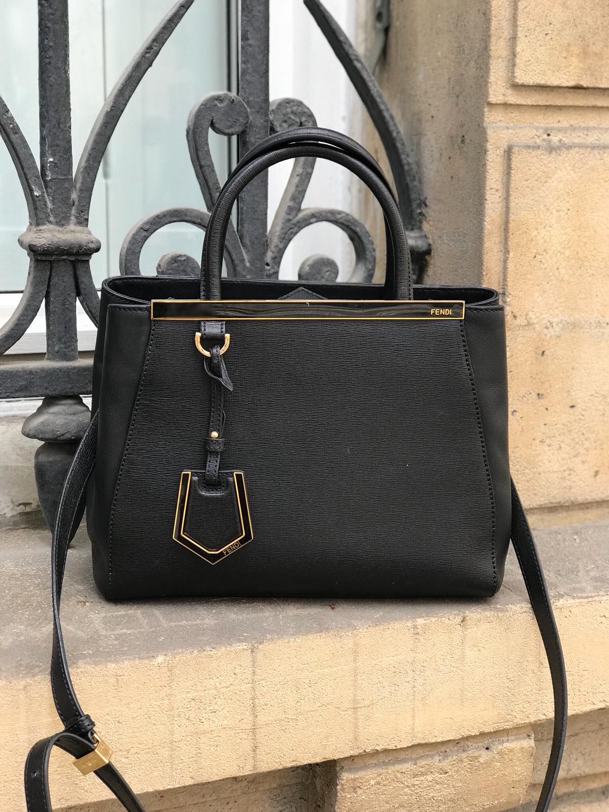 Petit cabas en cuir noir avec fermeture boutonnée et double poignée.