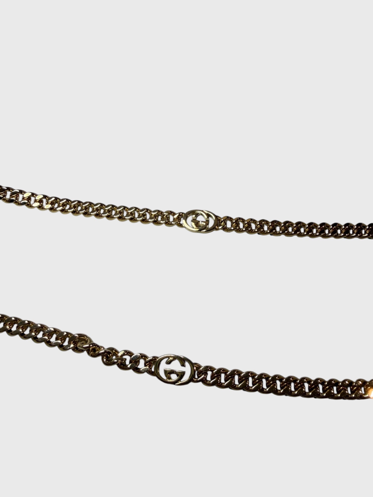 Sac en cuir bleu irisé avec fermeture à rabat orné du mors signature de la maison Gucci. Bandoulière amovible en chaine avec logo GG. Bijouterie dorée. Intérieur avec une fente pour cartes.