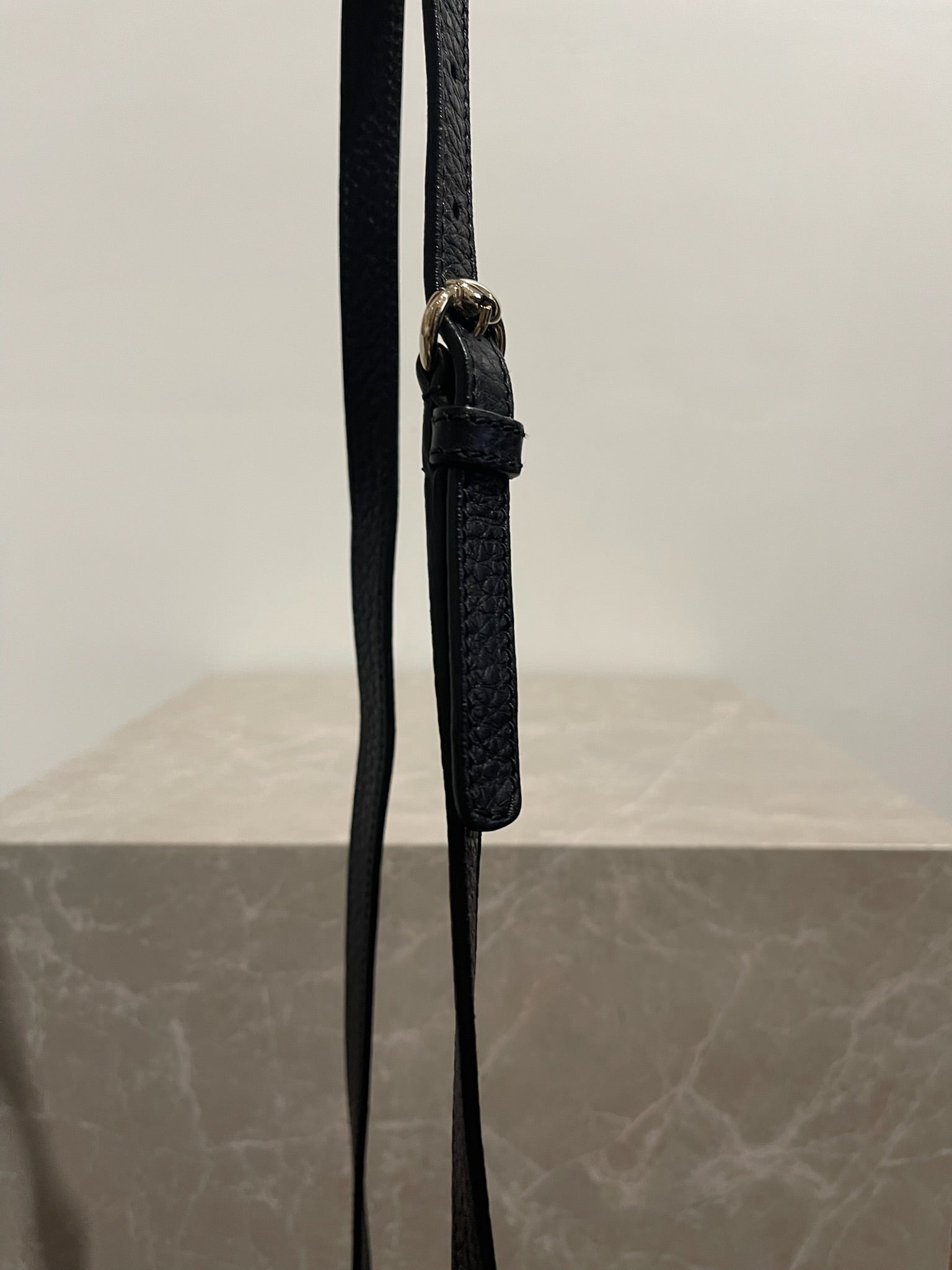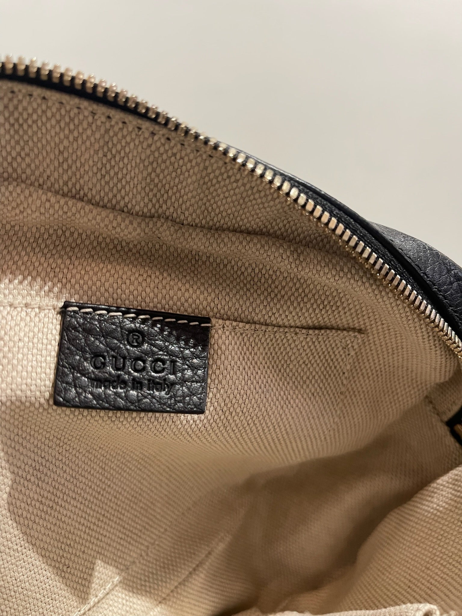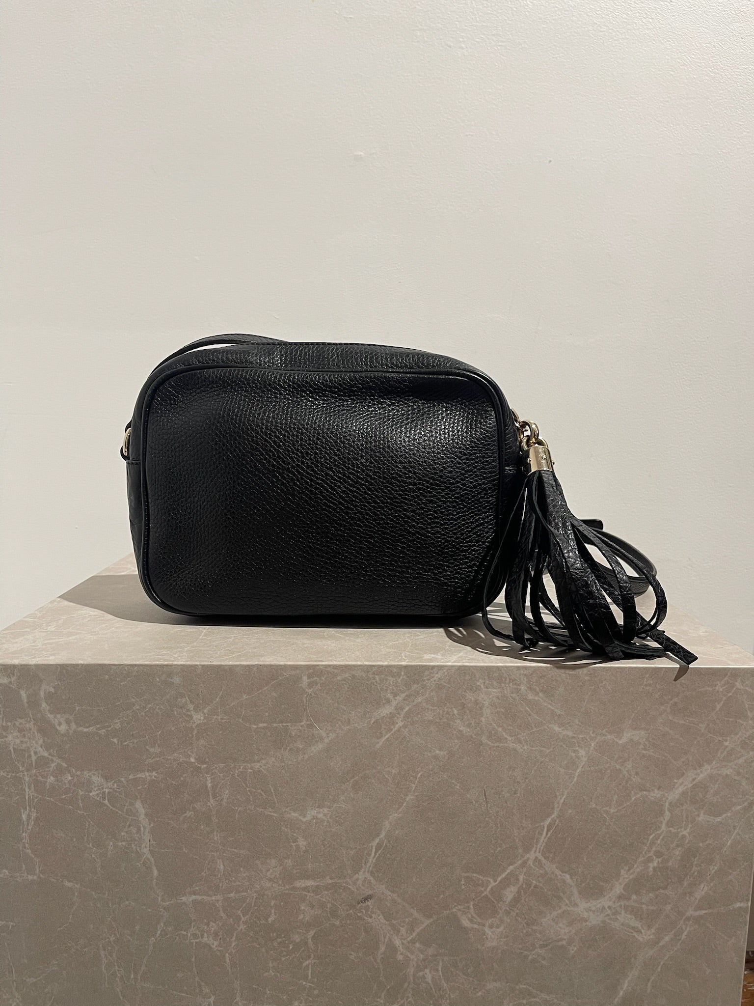 Sac à main en cuir noir avec logo GG brodé à l'avant, bandoulière réglable pour un porté épaule ou crossbody et fermeture zippée avec pompon.