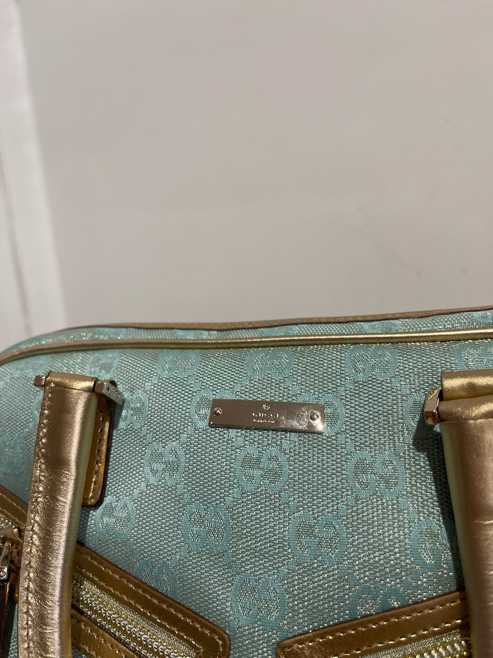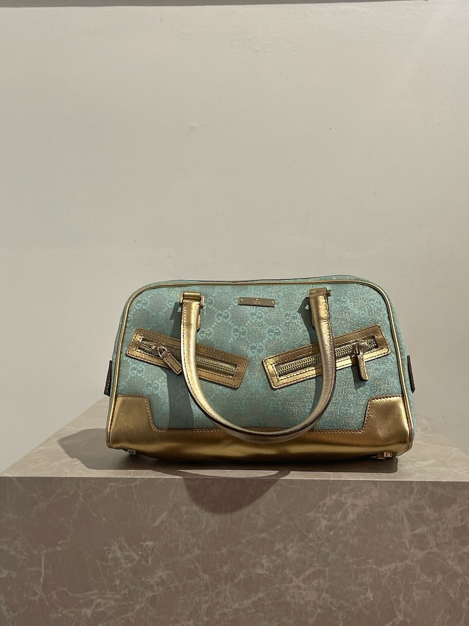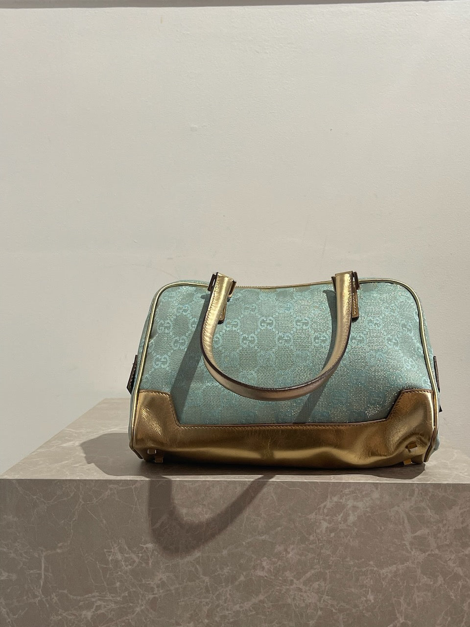 Petit sac bowling vintage en toile imprimé suprême GG métallisé bleu/ vert turquoise avec empiècements en cuir doré. Orné d'une plaque signée Gucci sur le devant. Deux anses pour un porté main. Il comporte deux petites poches extérieures et une poche intérieure zippée pratique, encastrée dans la doublure en nylon doré.