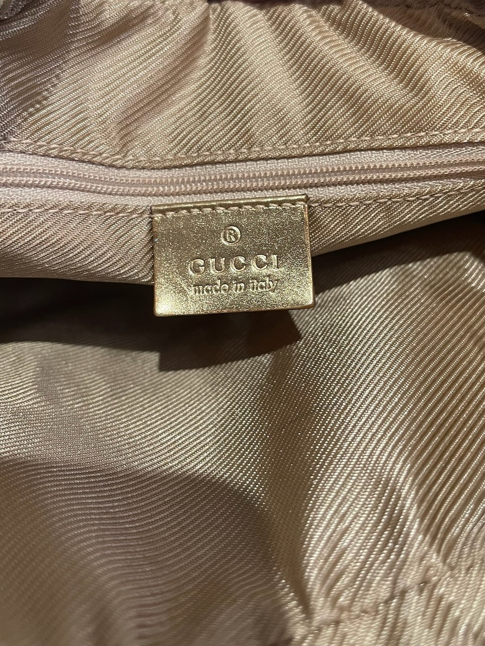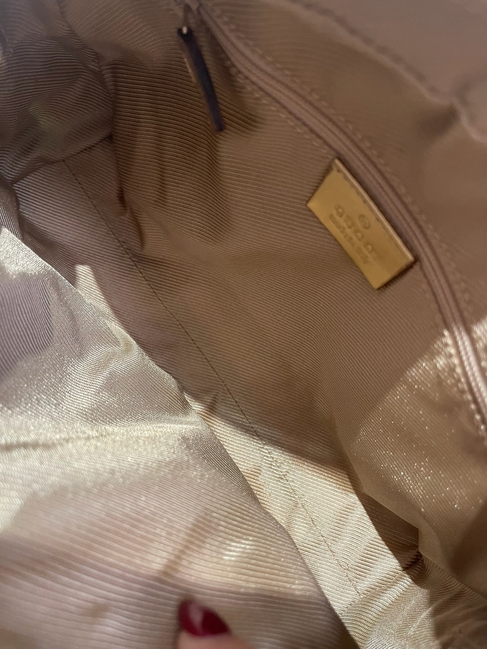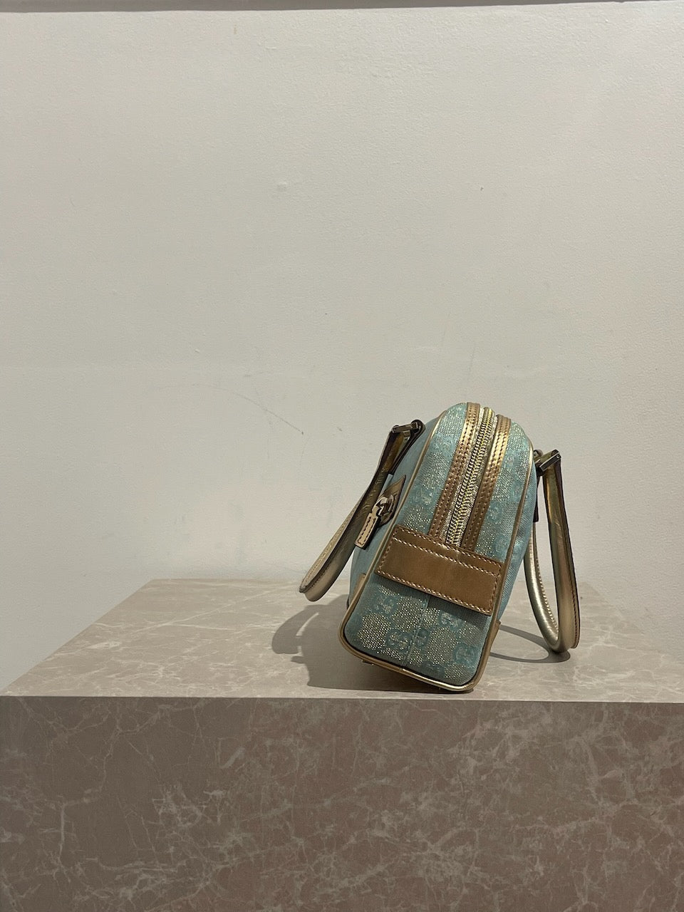 Petit sac bowling vintage en toile imprimé suprême GG métallisé bleu/ vert turquoise avec empiècements en cuir doré. Orné d'une plaque signée Gucci sur le devant. Deux anses pour un porté main. Il comporte deux petites poches extérieures et une poche intérieure zippée pratique, encastrée dans la doublure en nylon doré.