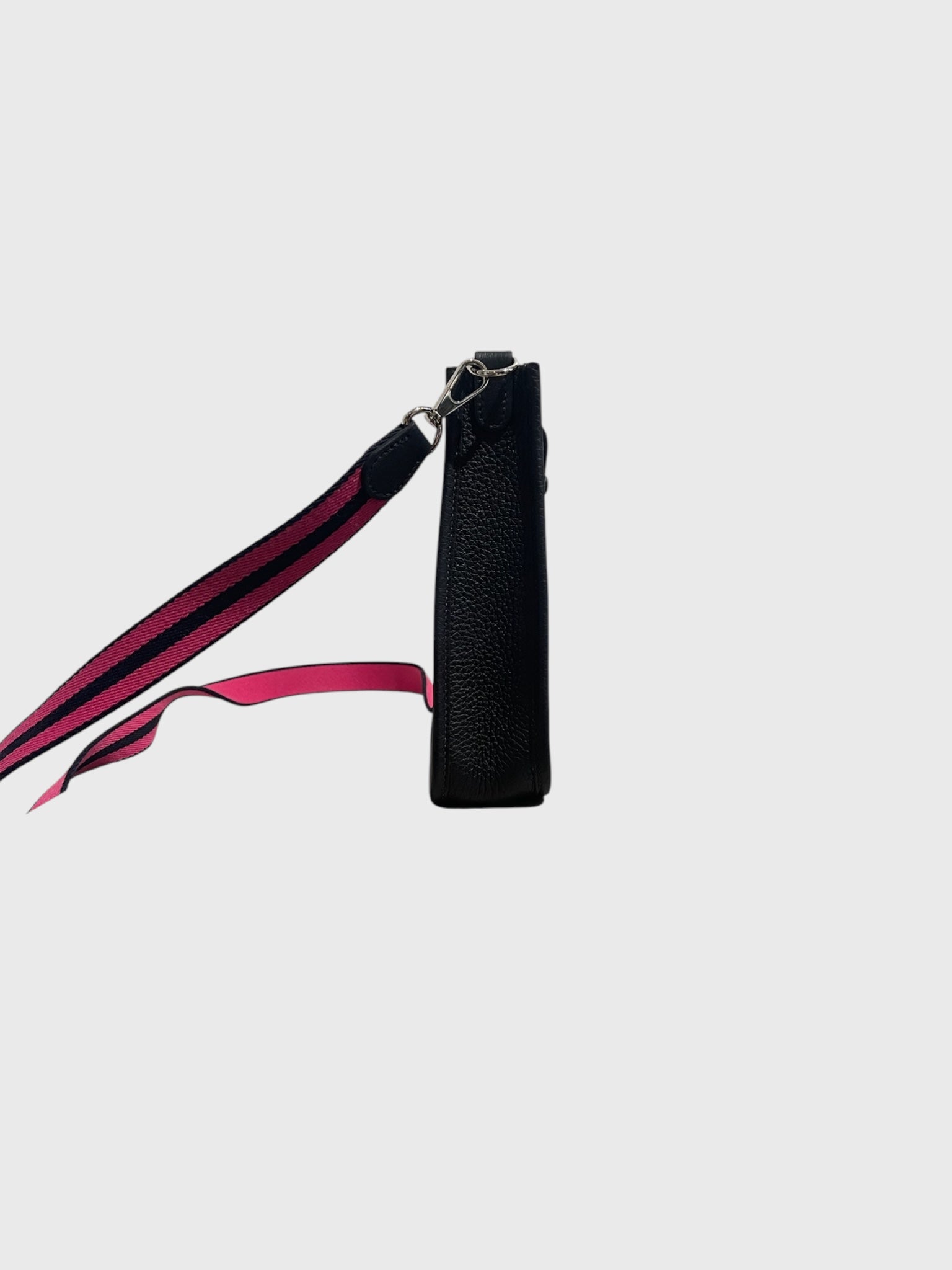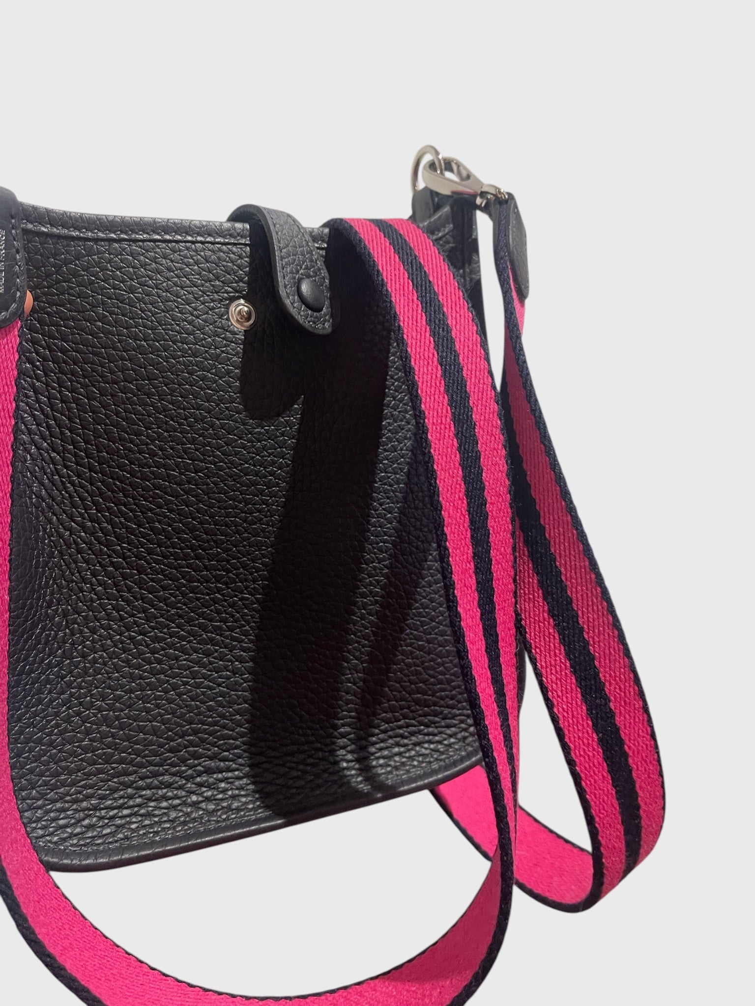 Sac en cuir taurillon Clémence bleu indigo avec logo H perforé à l'avant, fermeture par bouton-pression avec lien en cuir. Bandoulière amovible en toile rayée rose et bleu marine. Bijouterie palladium argenté.