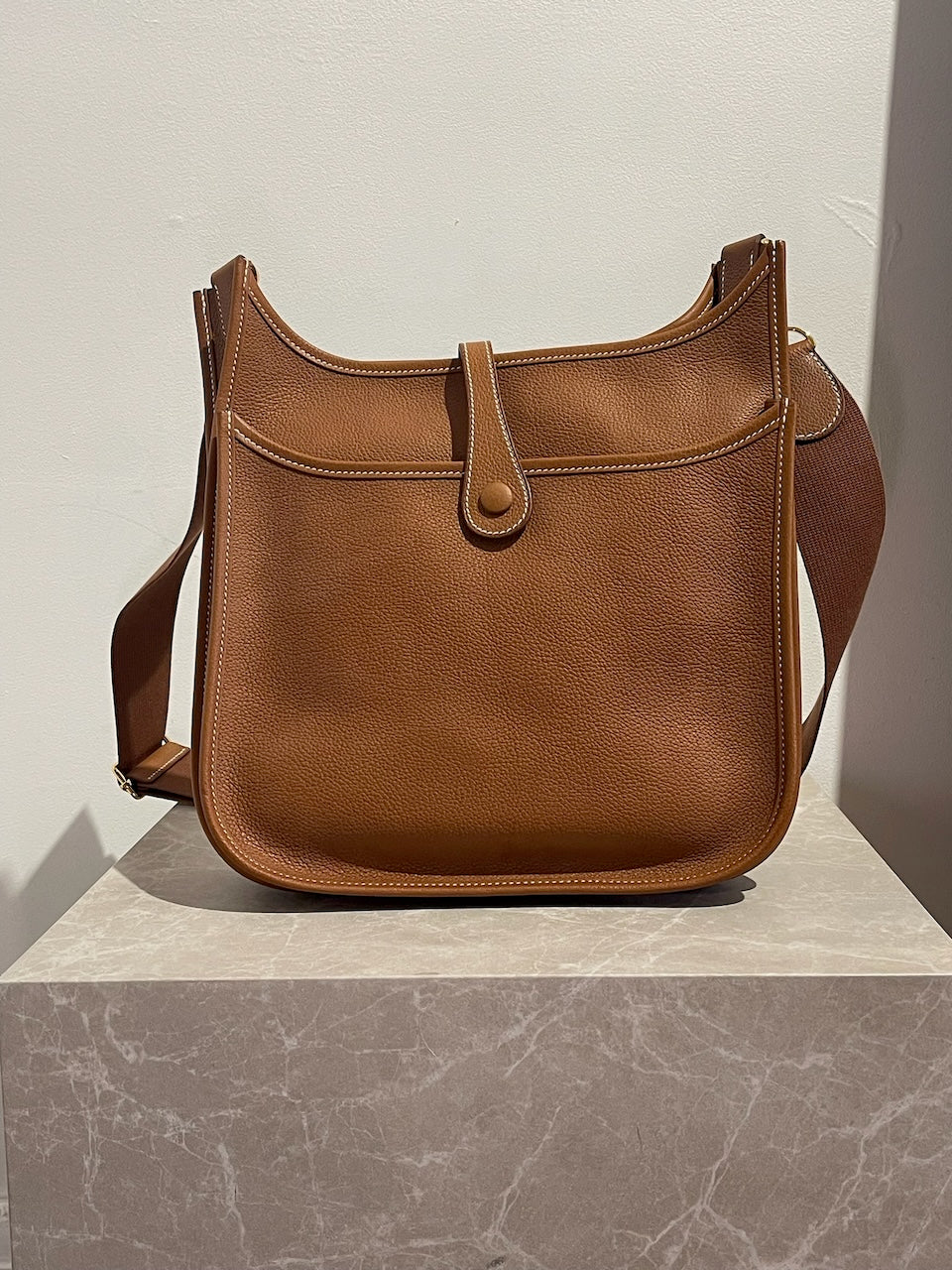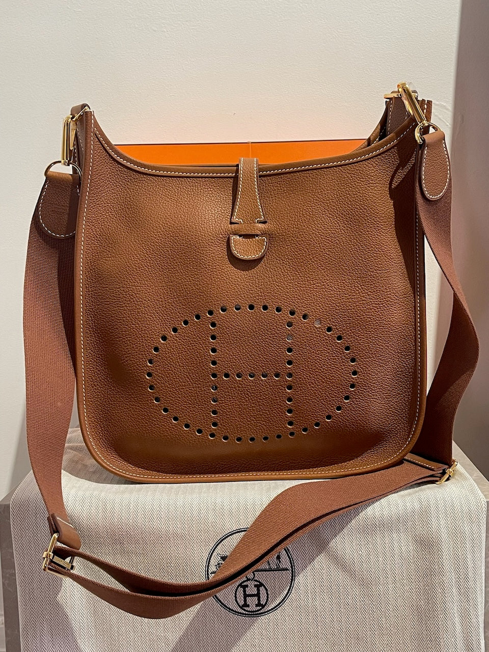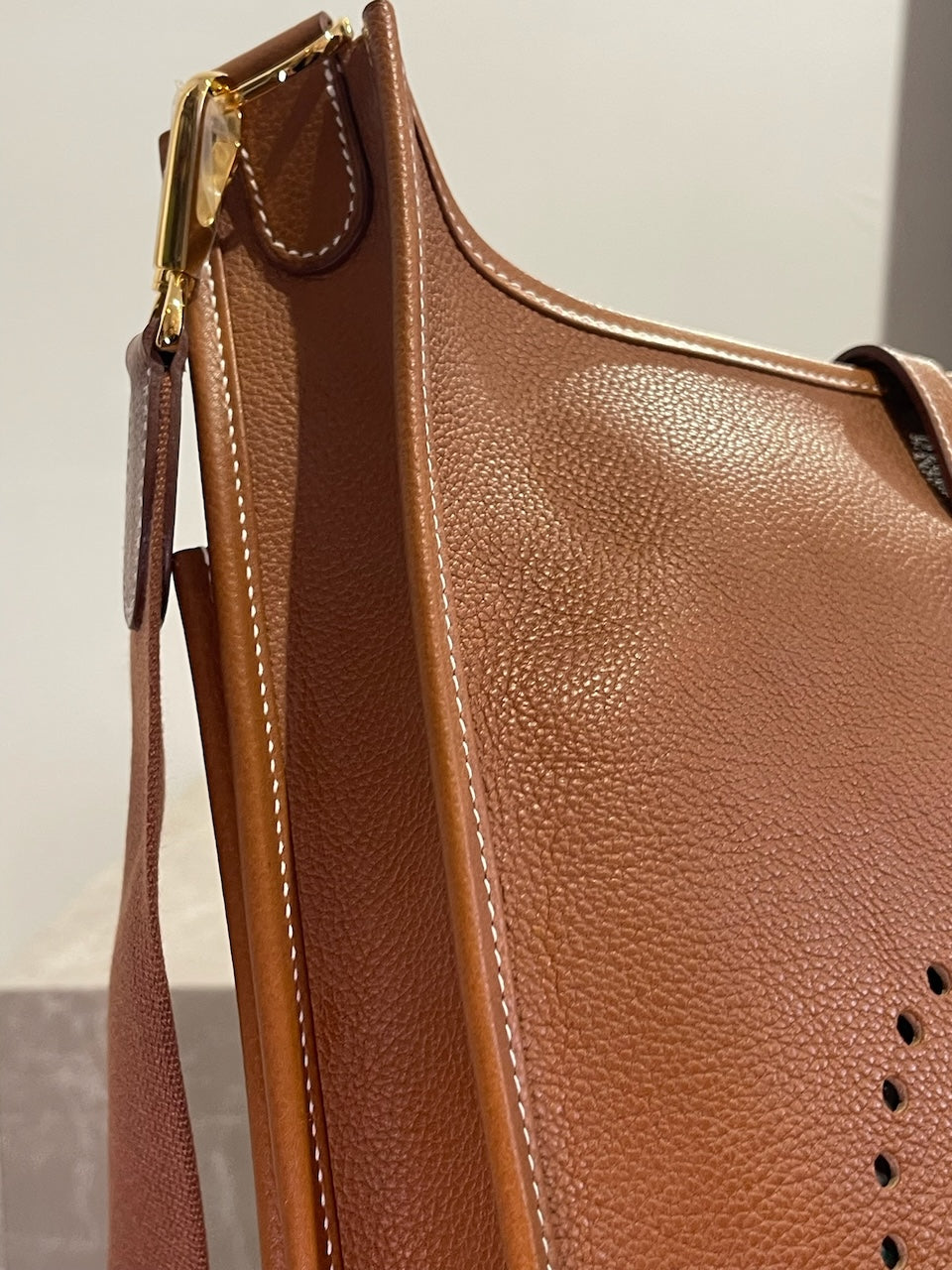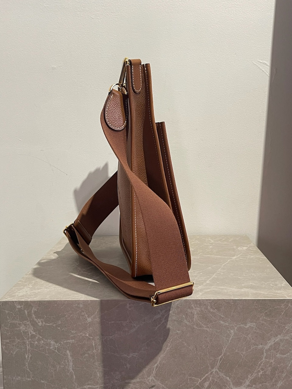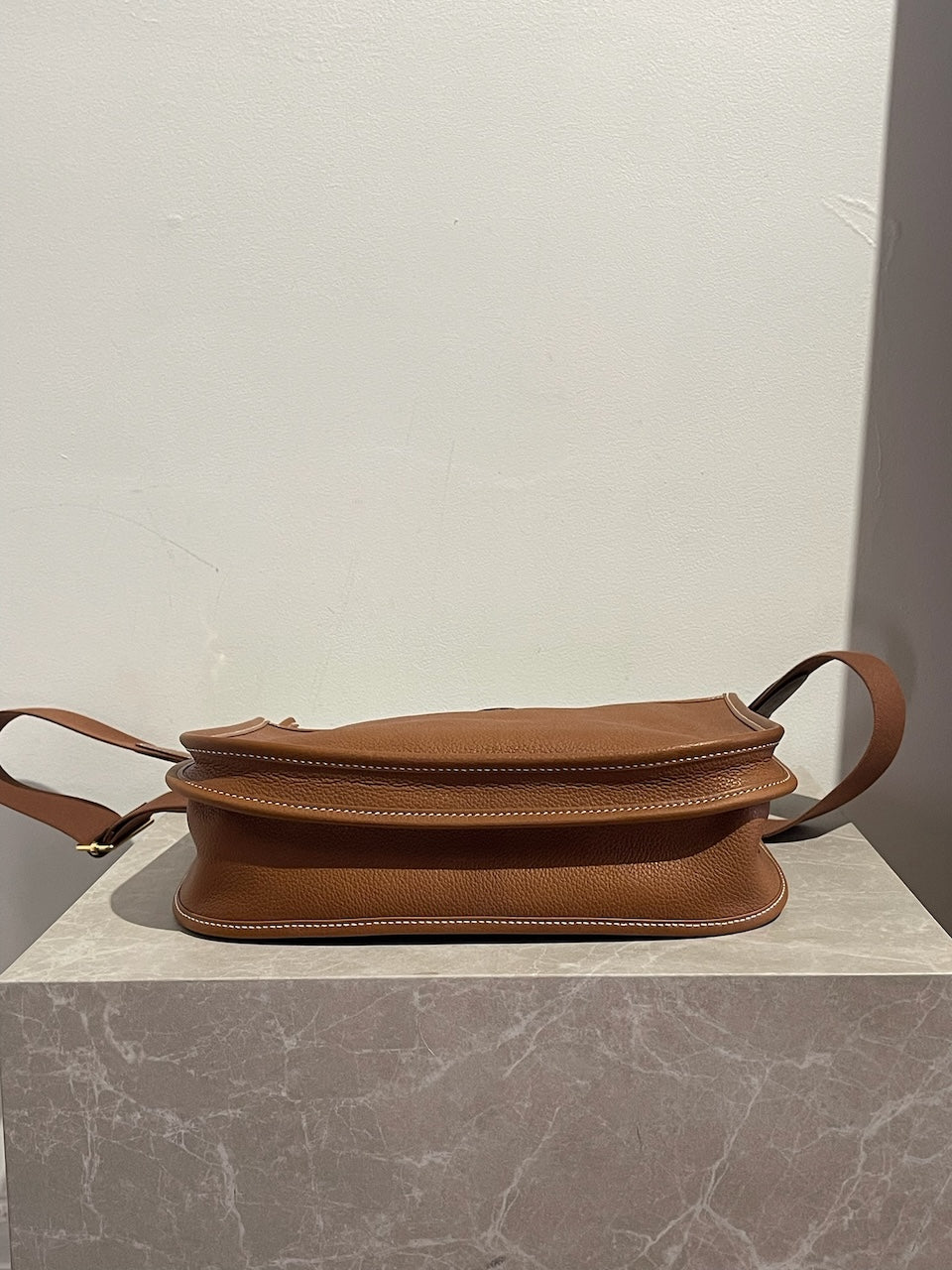 Sac à bandoulière en cuir Barenia Faubourg gold orné du H perforé, bandoulière ajustable en toile et fermeture par bouton. Poche plate. Finitions en métal doré. Intérieur en daim.