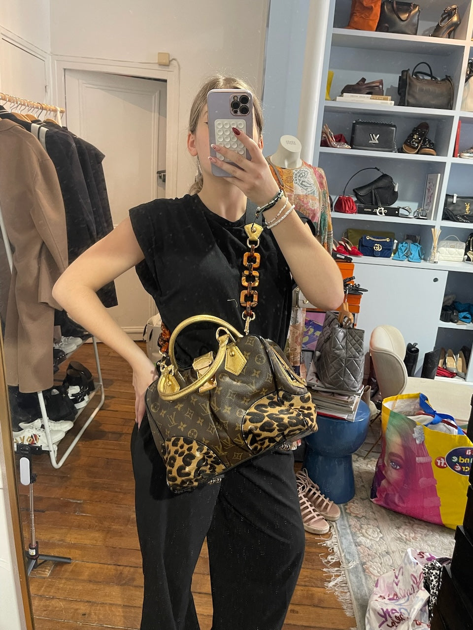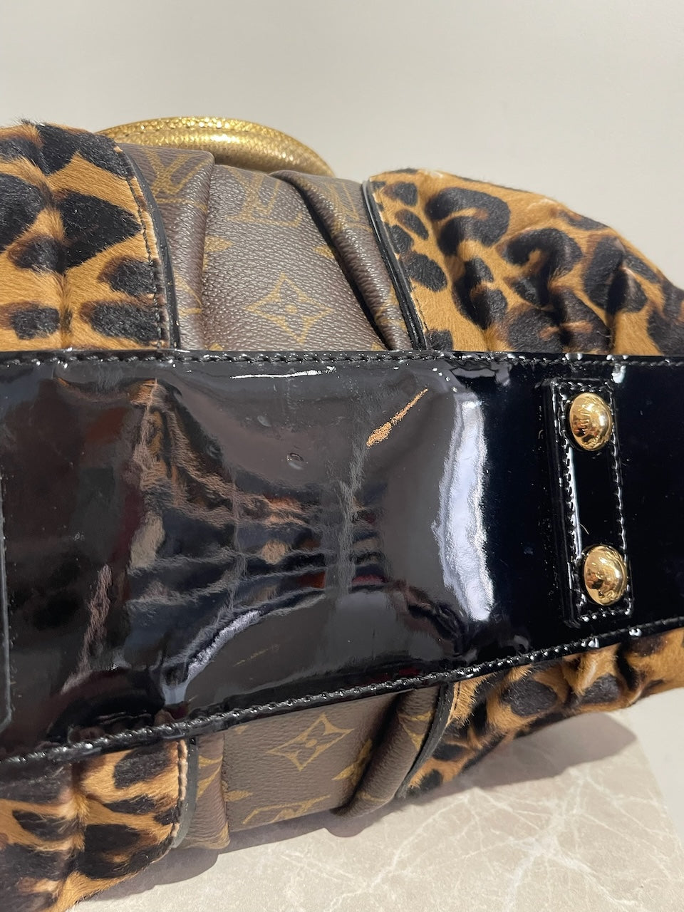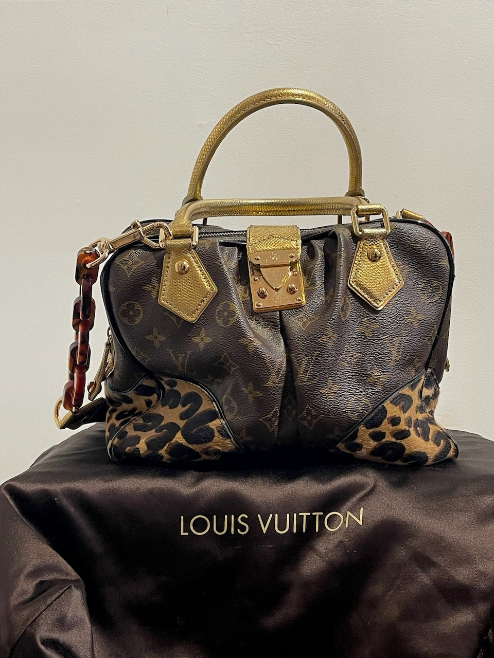 Sac à main en toile monogram marron, poulain imprimé léopard et cuir exotique doré avec double anse sur le dessus et fermeture zippée et clip signé Louis Vuitton. Bandoulière amovible en émail, cuir et toile pour un porté épaule ou crossbody. Poche intérieure plate.