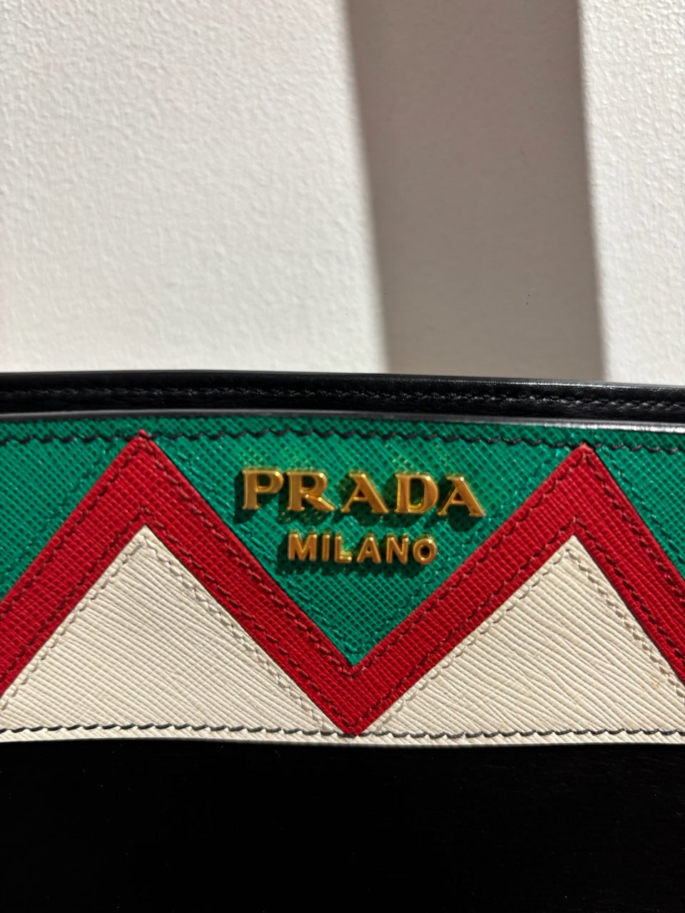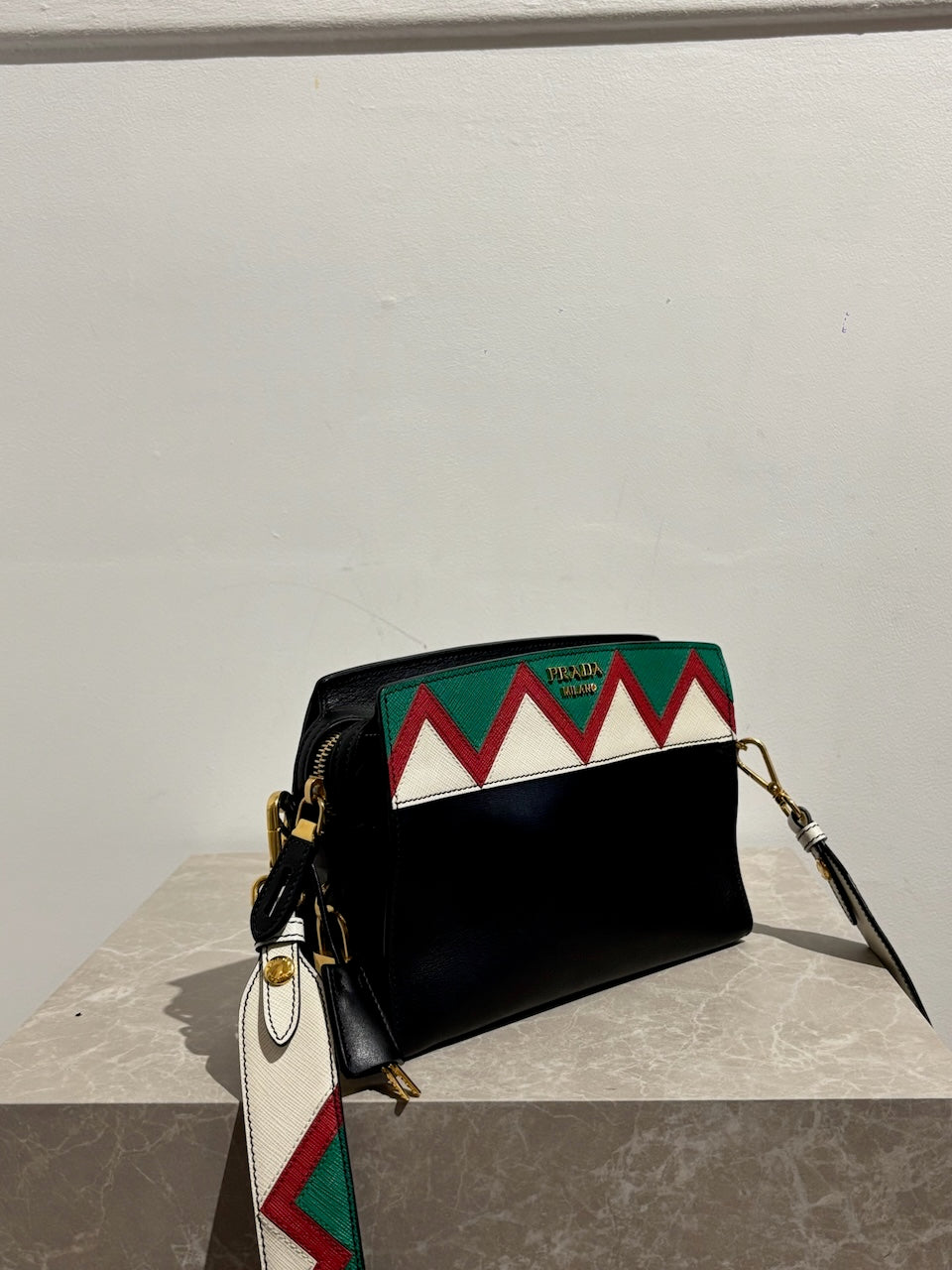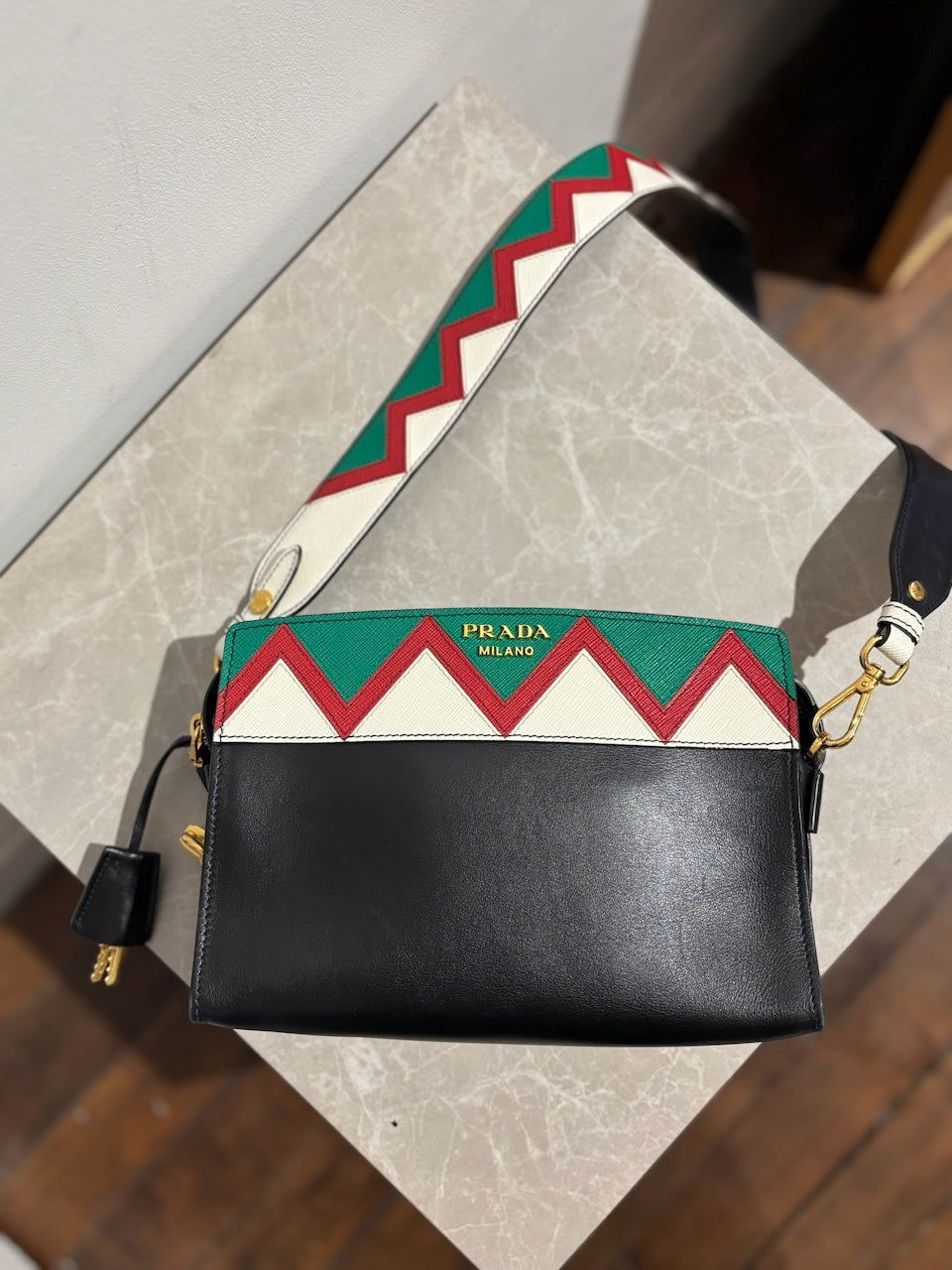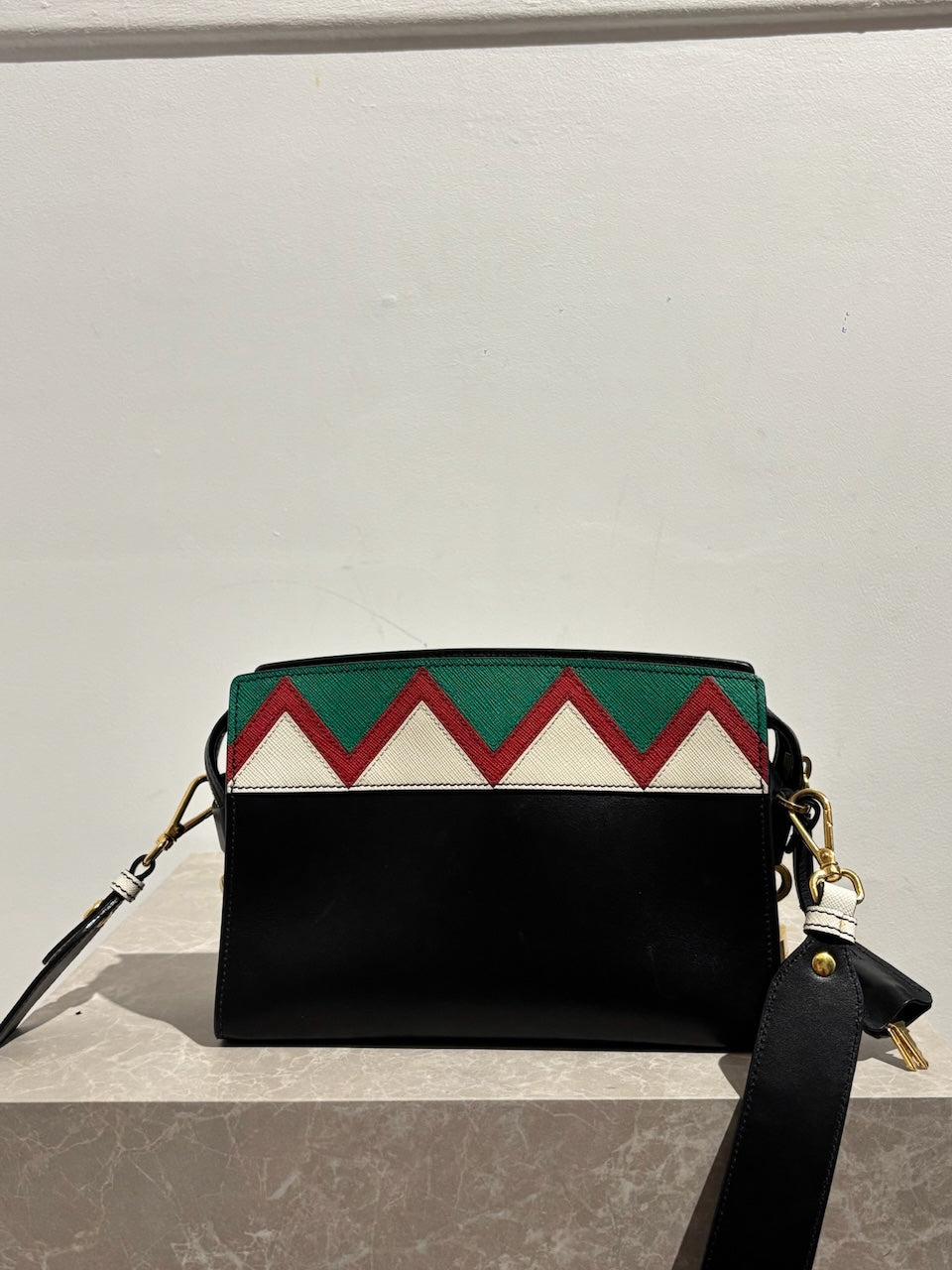 Sac à main en cuir Saffiano noir avec motifs géométriques blanc, rouge et vert, fermeture zippée et logo Prada en métal doré à l'avant. Bandoulière amovible reprenant le motif coloré. Poche intérieure plaquée. Avec cadenas et clés. Bijouterie dorée.