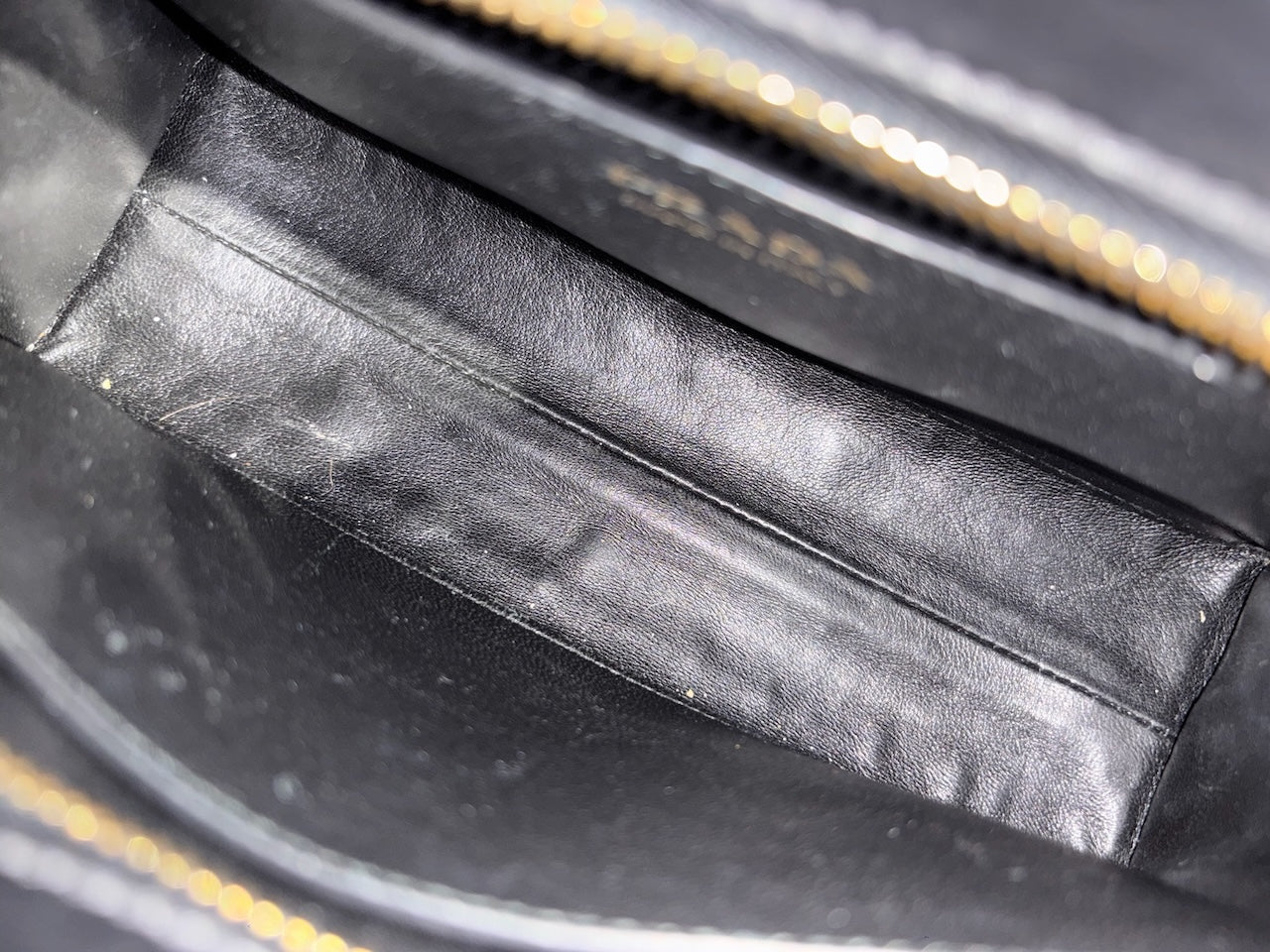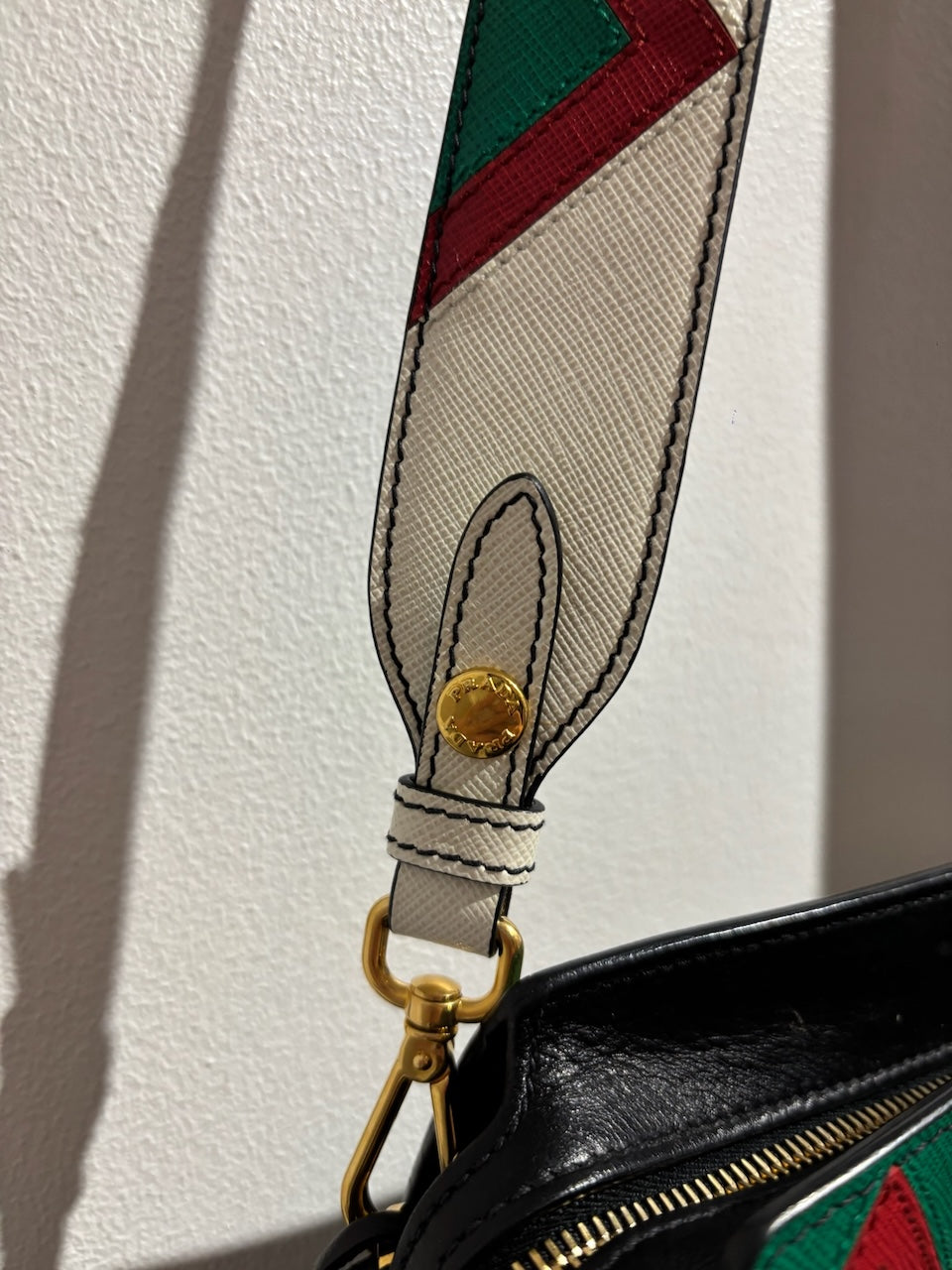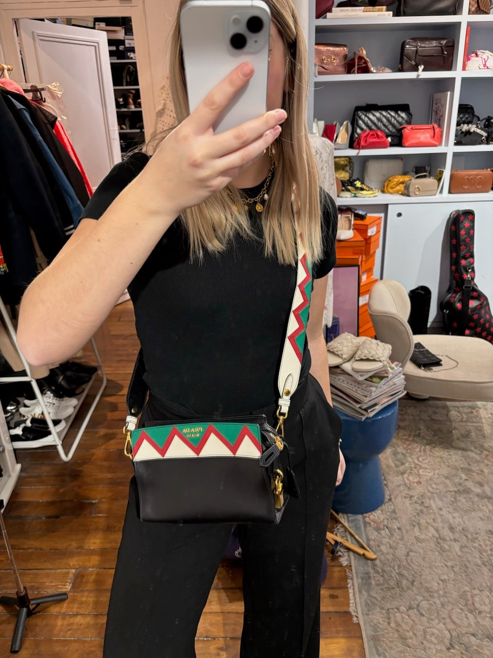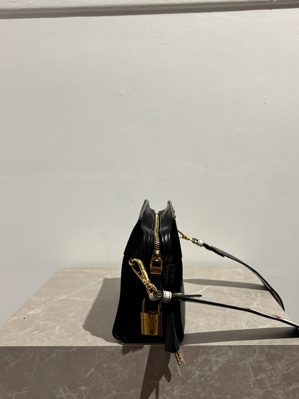 Sac à main en cuir Saffiano noir avec motifs géométriques blanc, rouge et vert, fermeture zippée et logo Prada en métal doré à l'avant. Bandoulière amovible reprenant le motif coloré. Poche intérieure plaquée. Avec cadenas et clés. Bijouterie dorée.