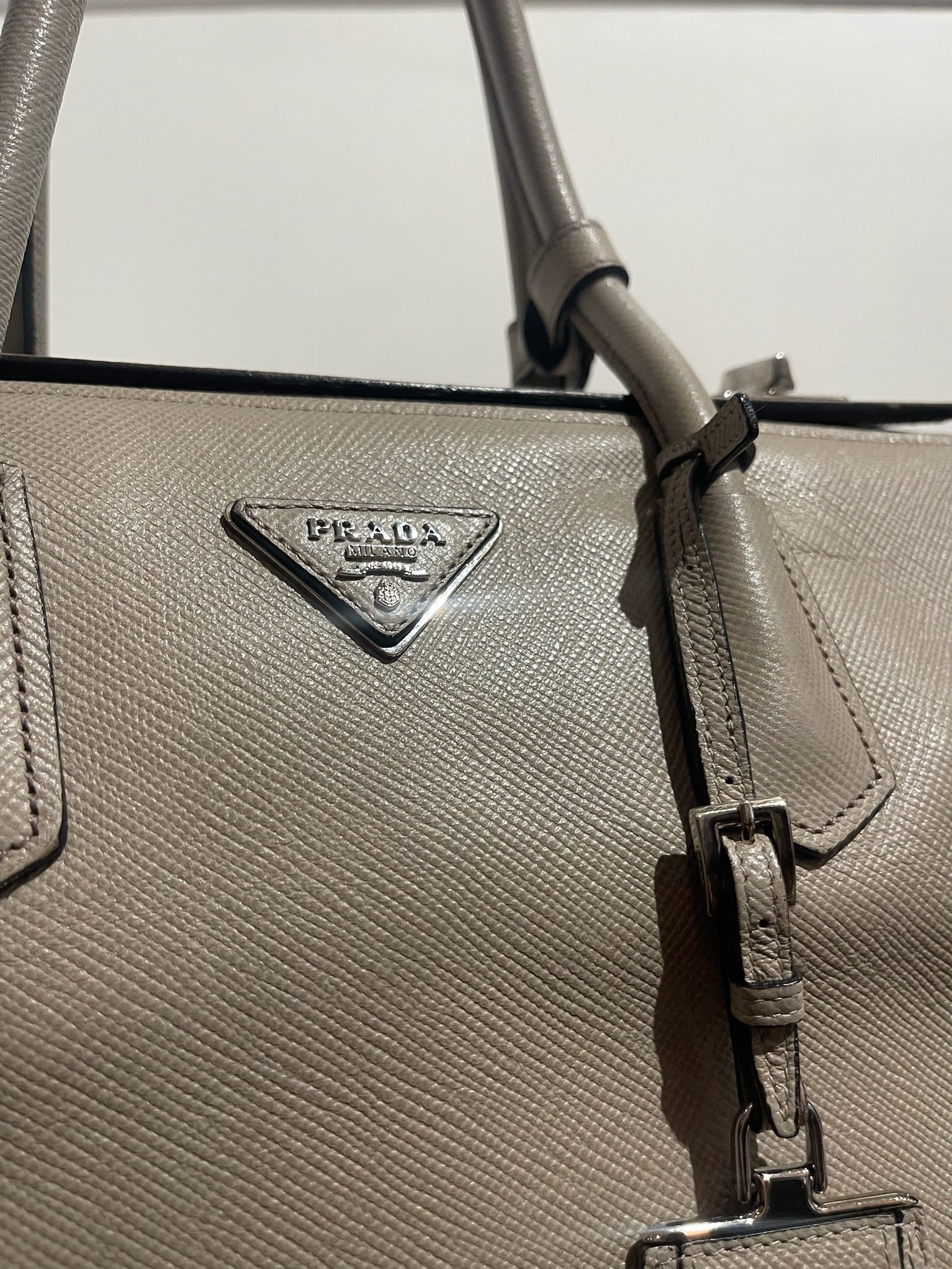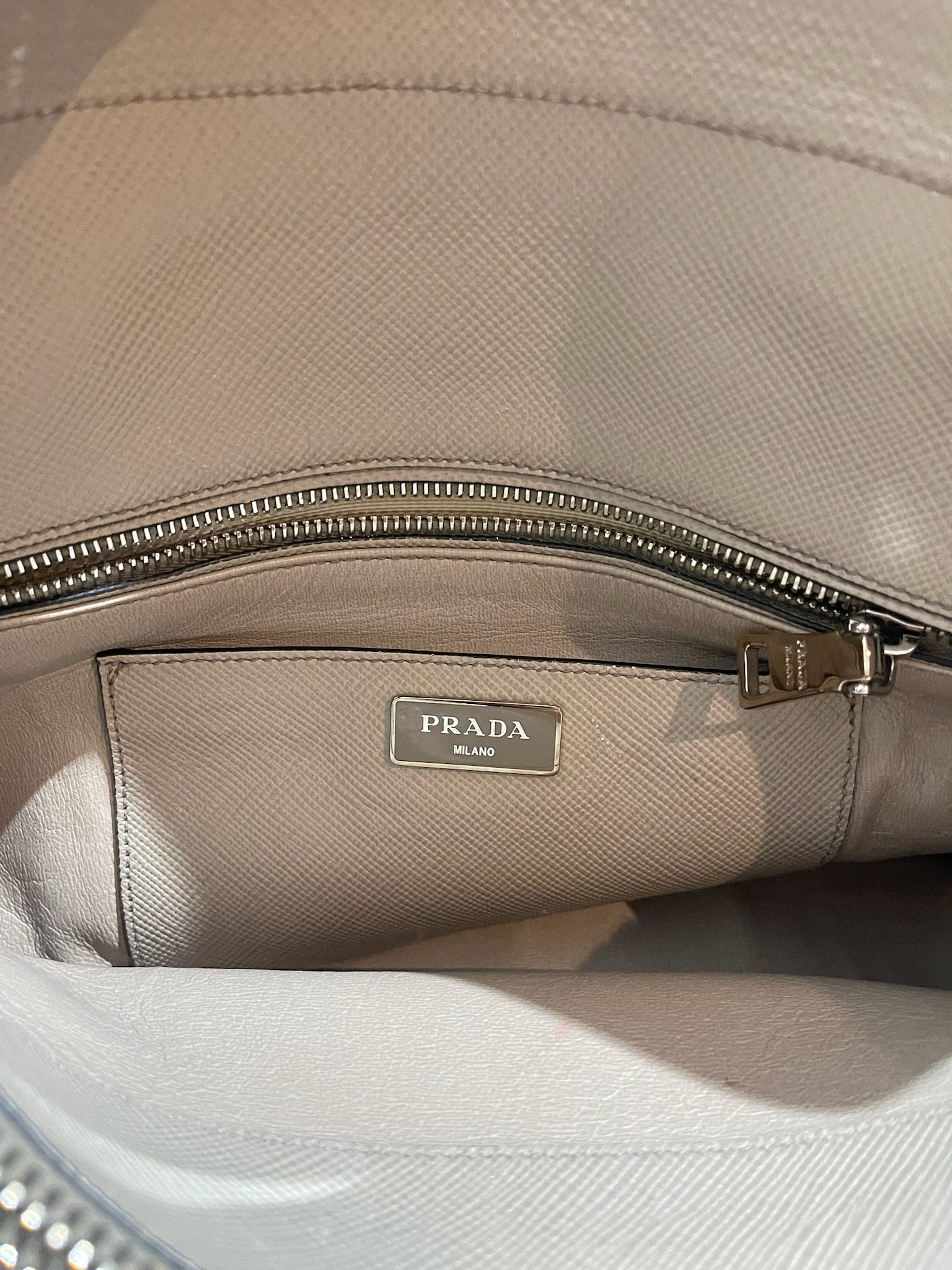 Sac à main en cuir saffiano beige avec double anse et étiquette signée Prada pour un porté main. Logo triangle en metal à l'avant. Fermeture sur le dessus grâce à un rabat avec verrou tournant. Deux poches interne, une poche zippée et de poches plaquées. Bijouterie argentée.