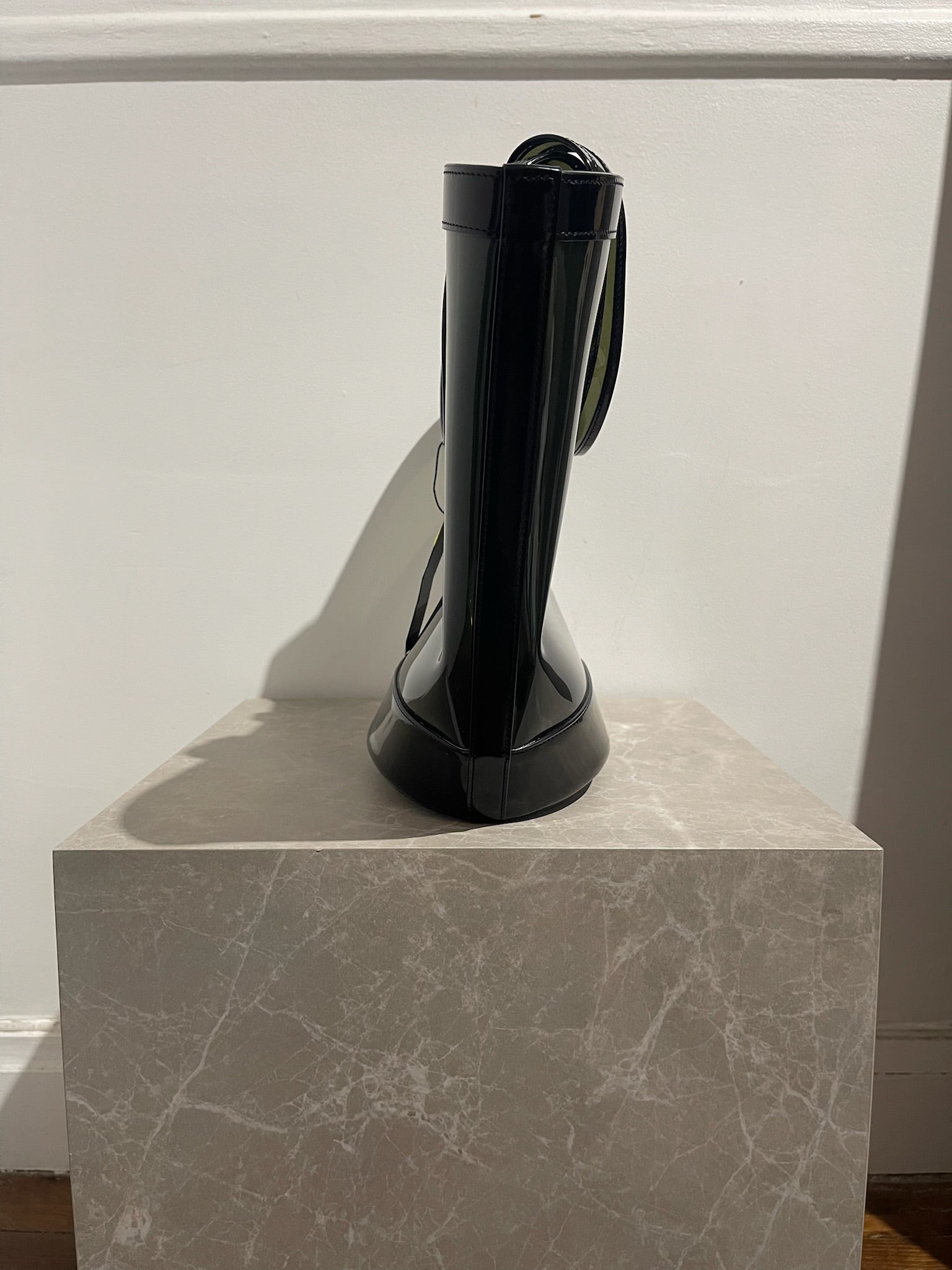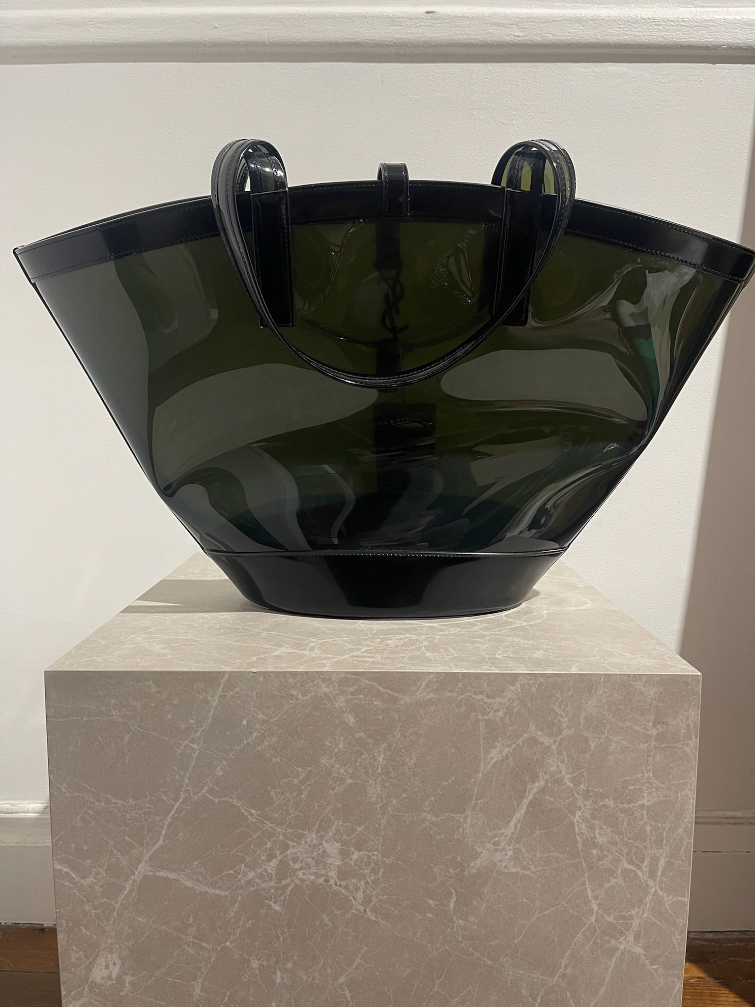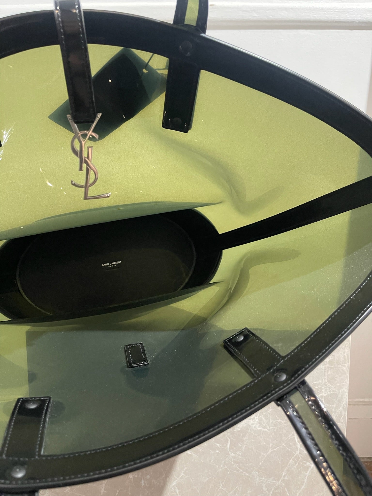 Sac cabas en PVC vert et cuir verni noir avec anse sur le dessus pour un porté épaule ou main, fermeture croché orné du logo YSL cassandre. Grand compartiment principal.