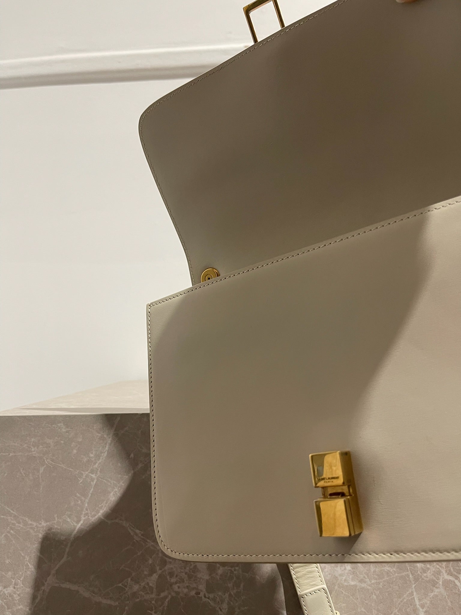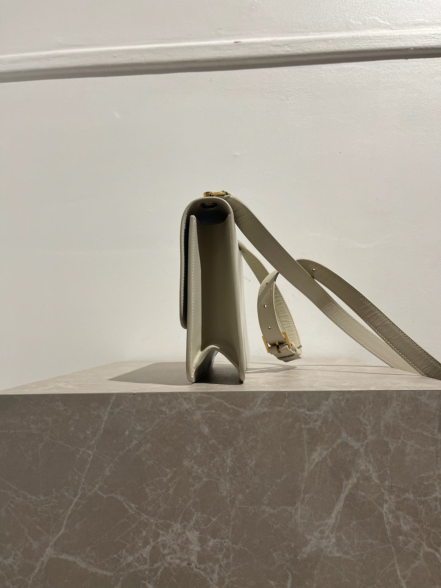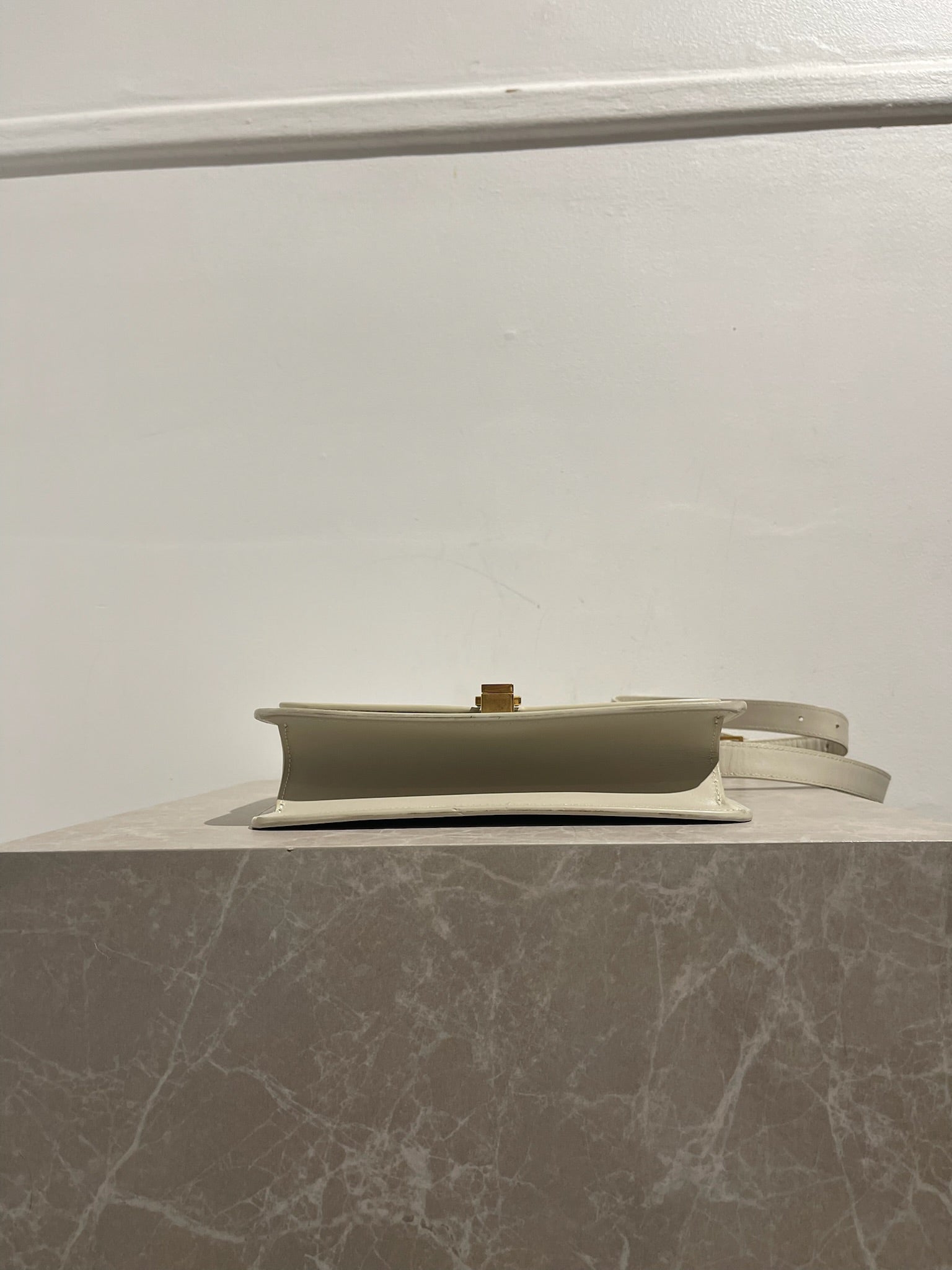 Sac en cuir de veau blanc orné d'un fermoir carré gravé Saint Laurent Paris. Fermeture à clip. Bandoulière réglable en cuir. Poche intérieure zip. Bijouterie dorée.