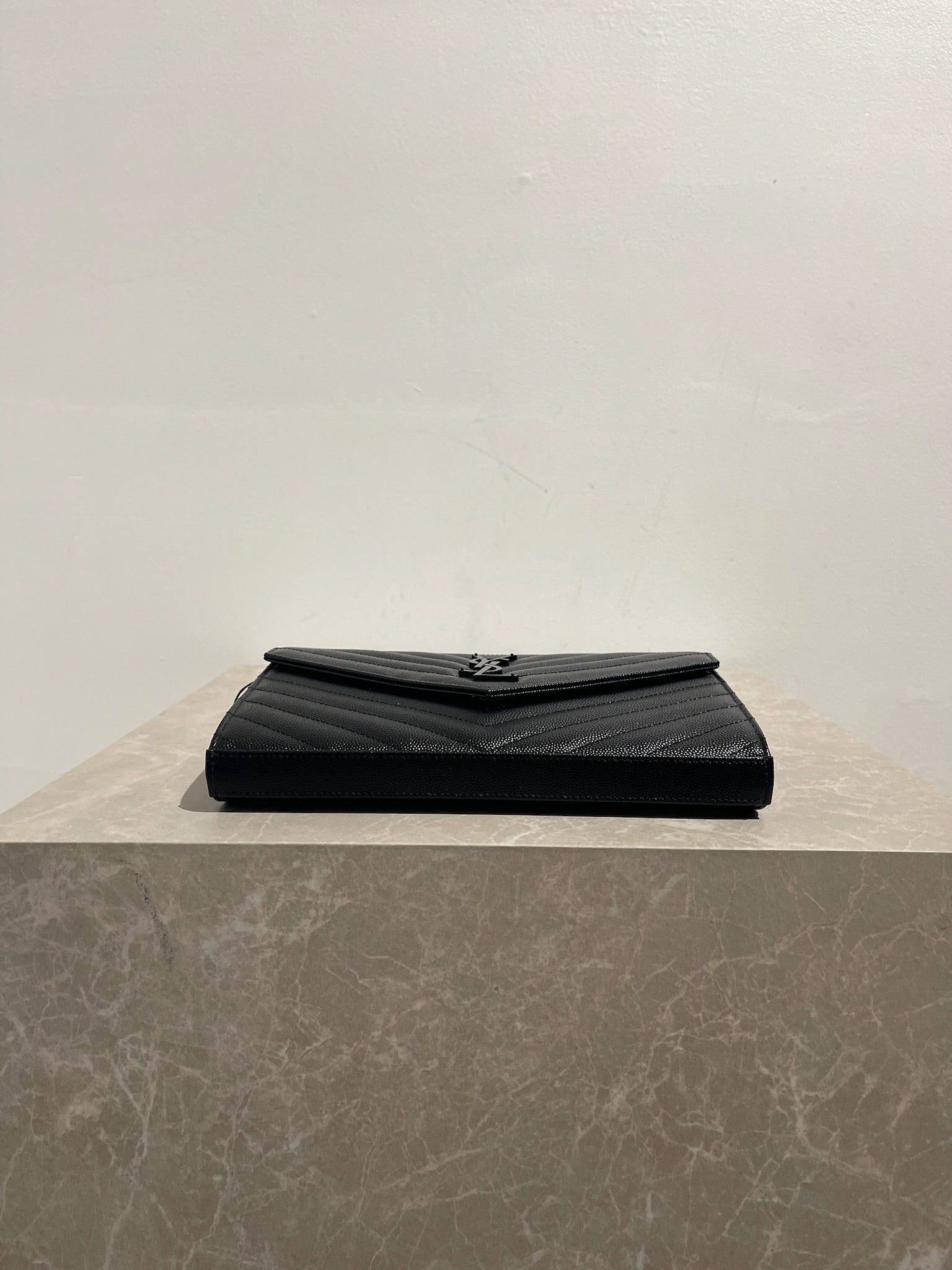 Sac en cuir grainé à motif chevron noir avec fermeture à rabat ornée du logo YSL en métal noir. Bandoulière en chaine et cuir pour un porté épaule ou crossbody. Bandoulière amovible. Deux compartiments et une poche centrale zippée. Compartiments pour cartes.