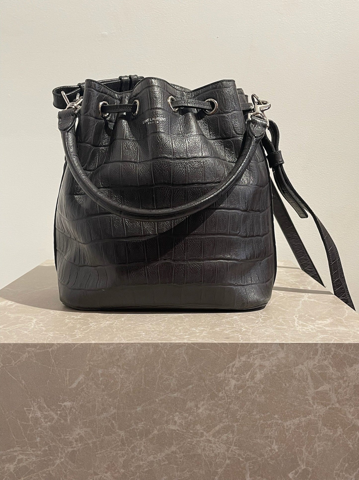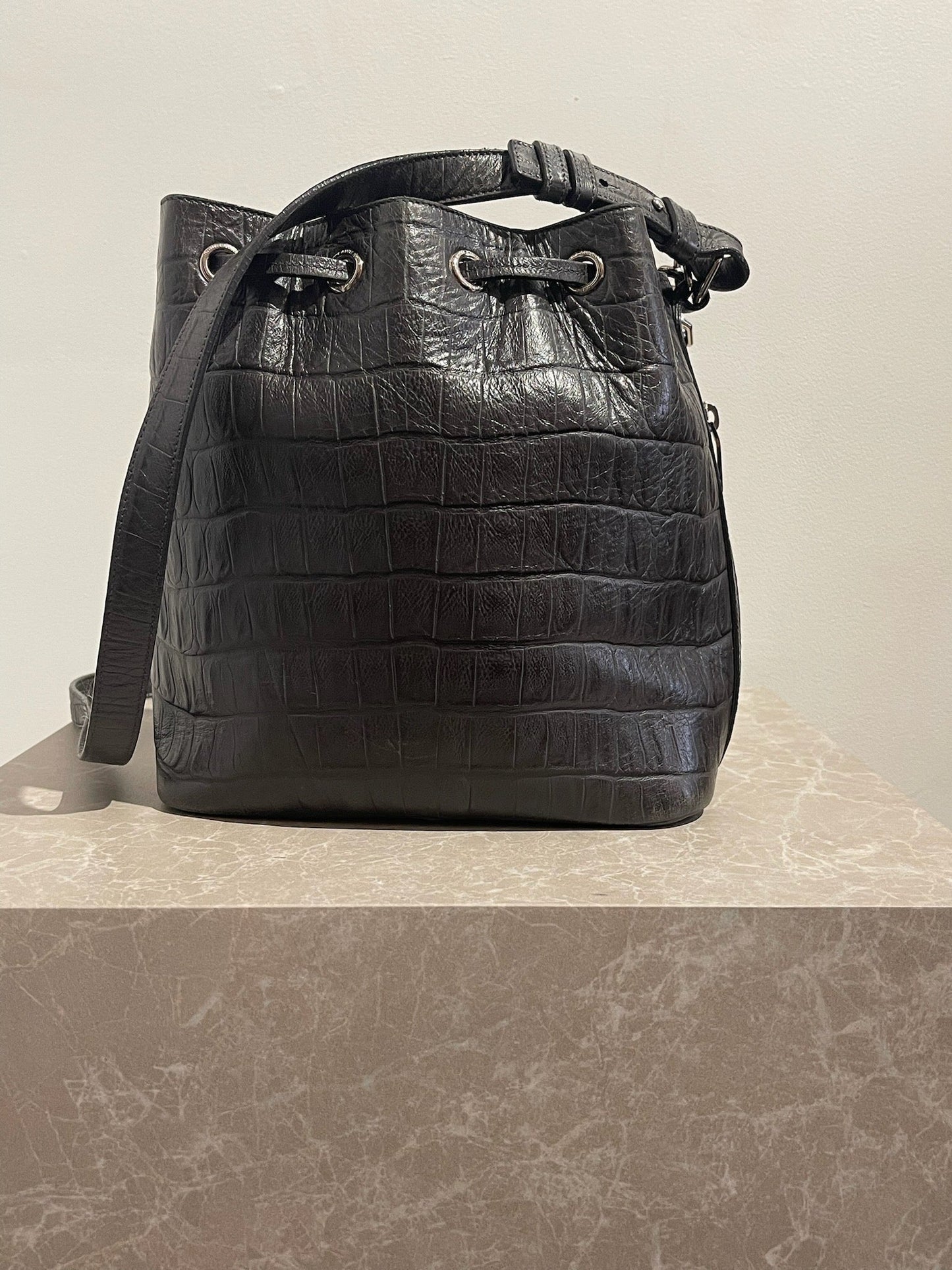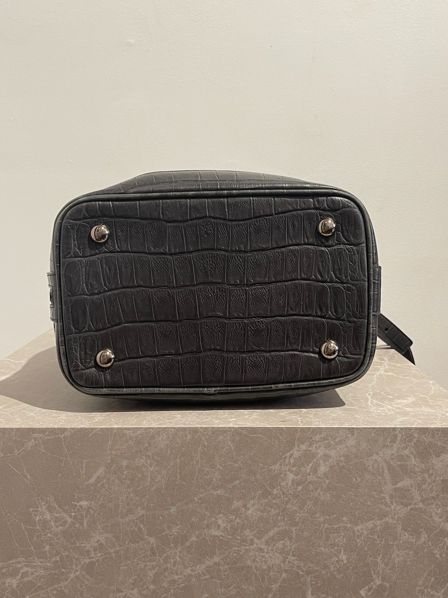 Sac seau en cuir embossé serpent gris avec petite anse sur le dessus pour un porté main et bandoulière ajustable et amovible pour un porté crossbody. Fermeture à lien. Poche latérale zippée.